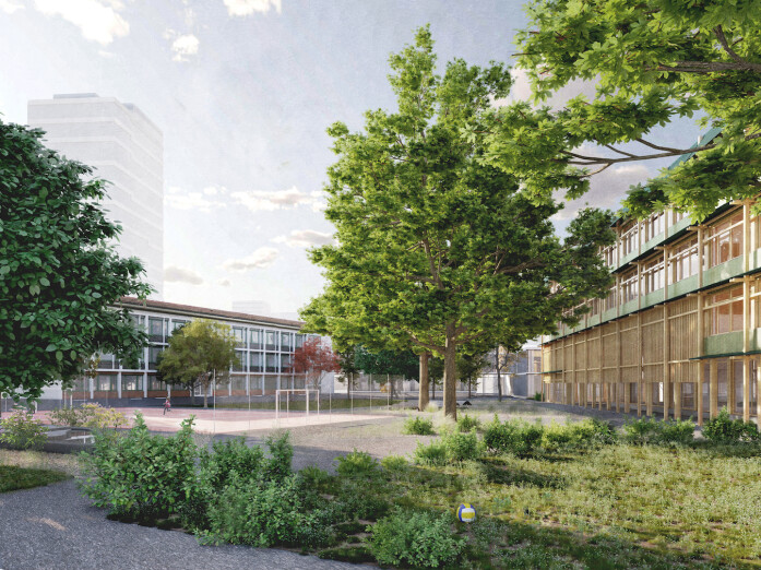 The current school complex presents itself as a conglomerate of buildings with different scales, uses and designs that have grown over the years. At the same time, the basic architectural principles of Godi Cordes' pavilion school are still present and clearly legible. The permeability of the ground floor and the associated covered areas together with the differentiated accesses, the different height buildings that embrace the open space and, of course, the diverse kinds of trees at the center of the plot that have grown over the 70 years from when the school was built. These qualities must be preserved and strengthened, and nevertheless the school complex needs to be densified with significantly more school space that can better fulfill the current and future needs.