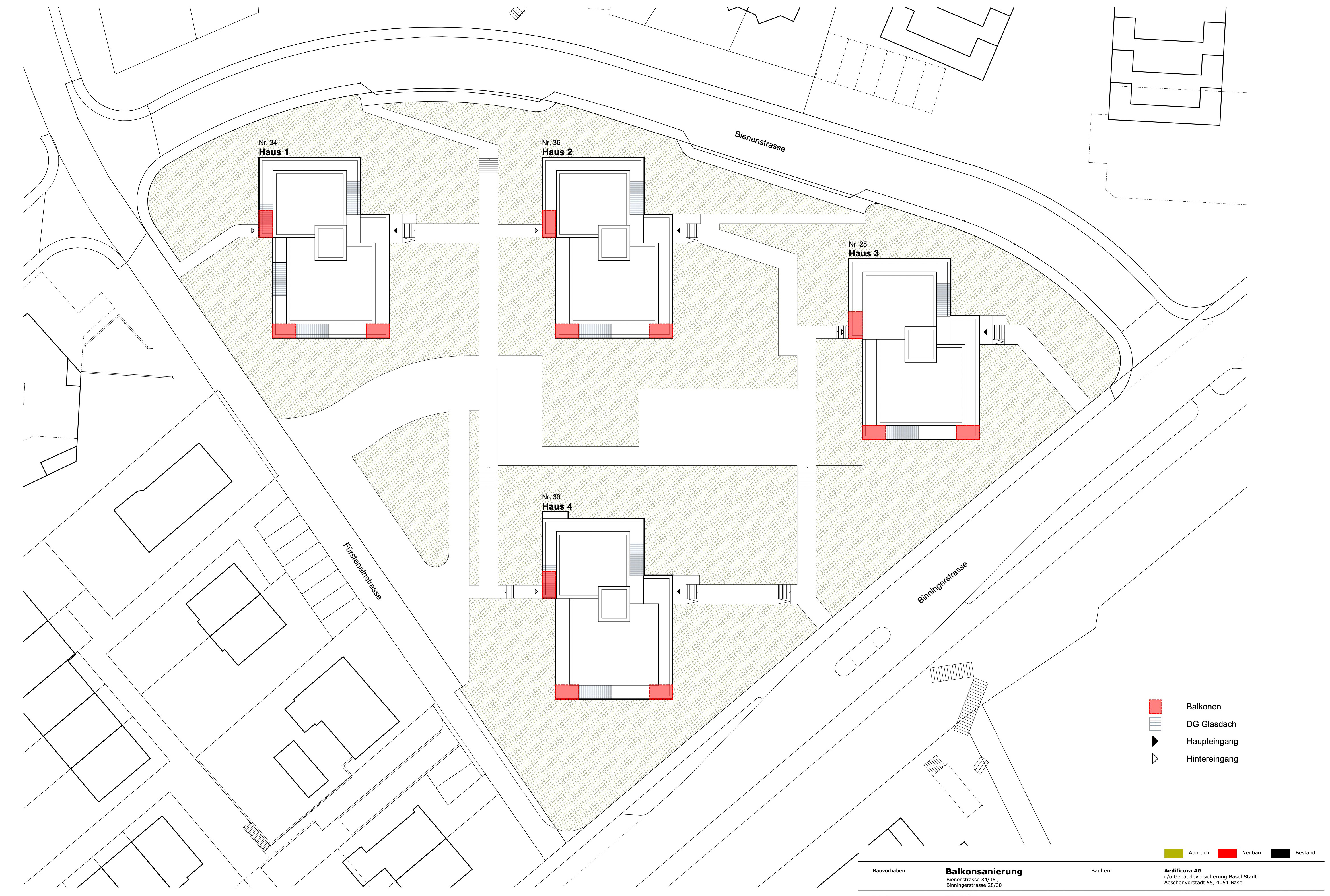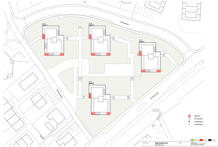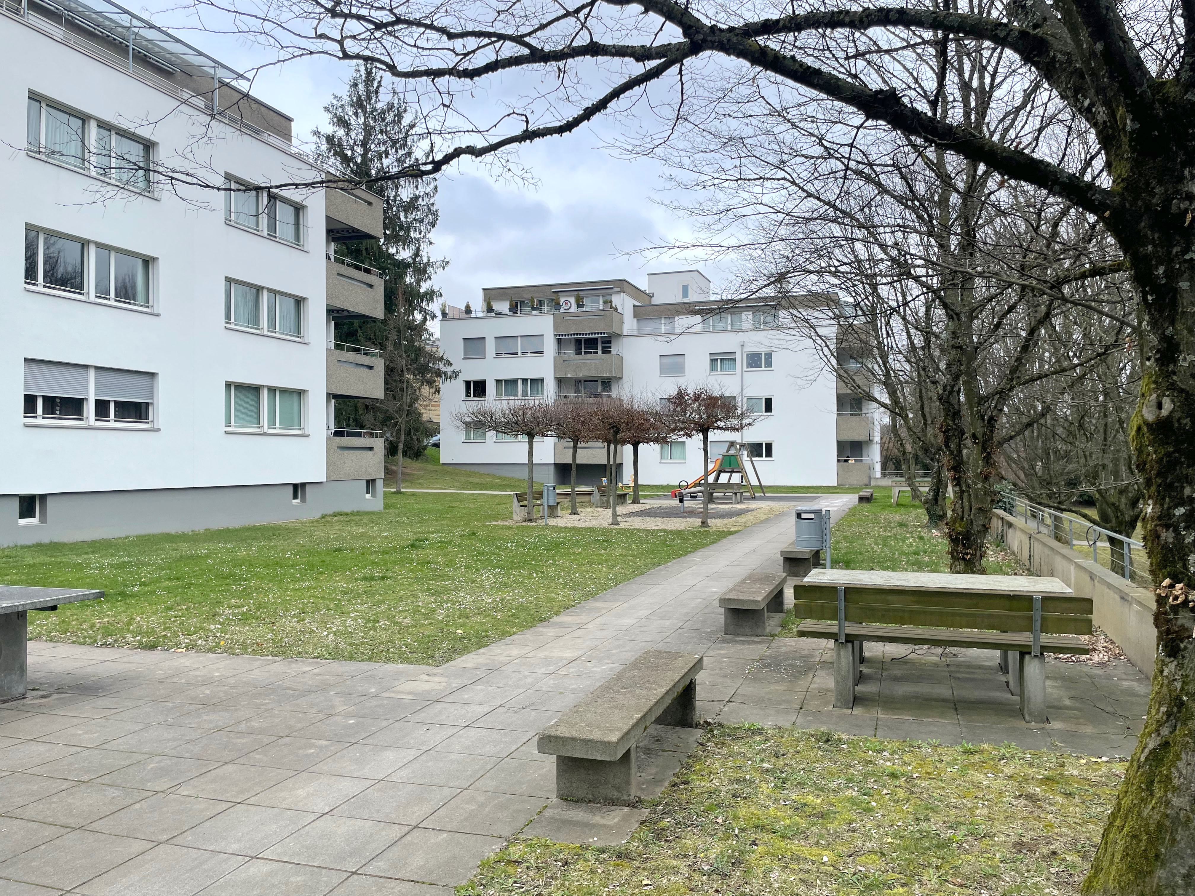 The residential development from the 1960s is located on a slight slope along the main road between Basel and the village center of Oberwil. The four identical buildings are positioned in a southeast orientation, following the terrain, and nestled into the park-like grounds. The property is accessed via the neighborhood streets Bienenstrasse and Fürstenrein. The centrally located piazza with a playground serves as the focal point of the settlement's open space design.