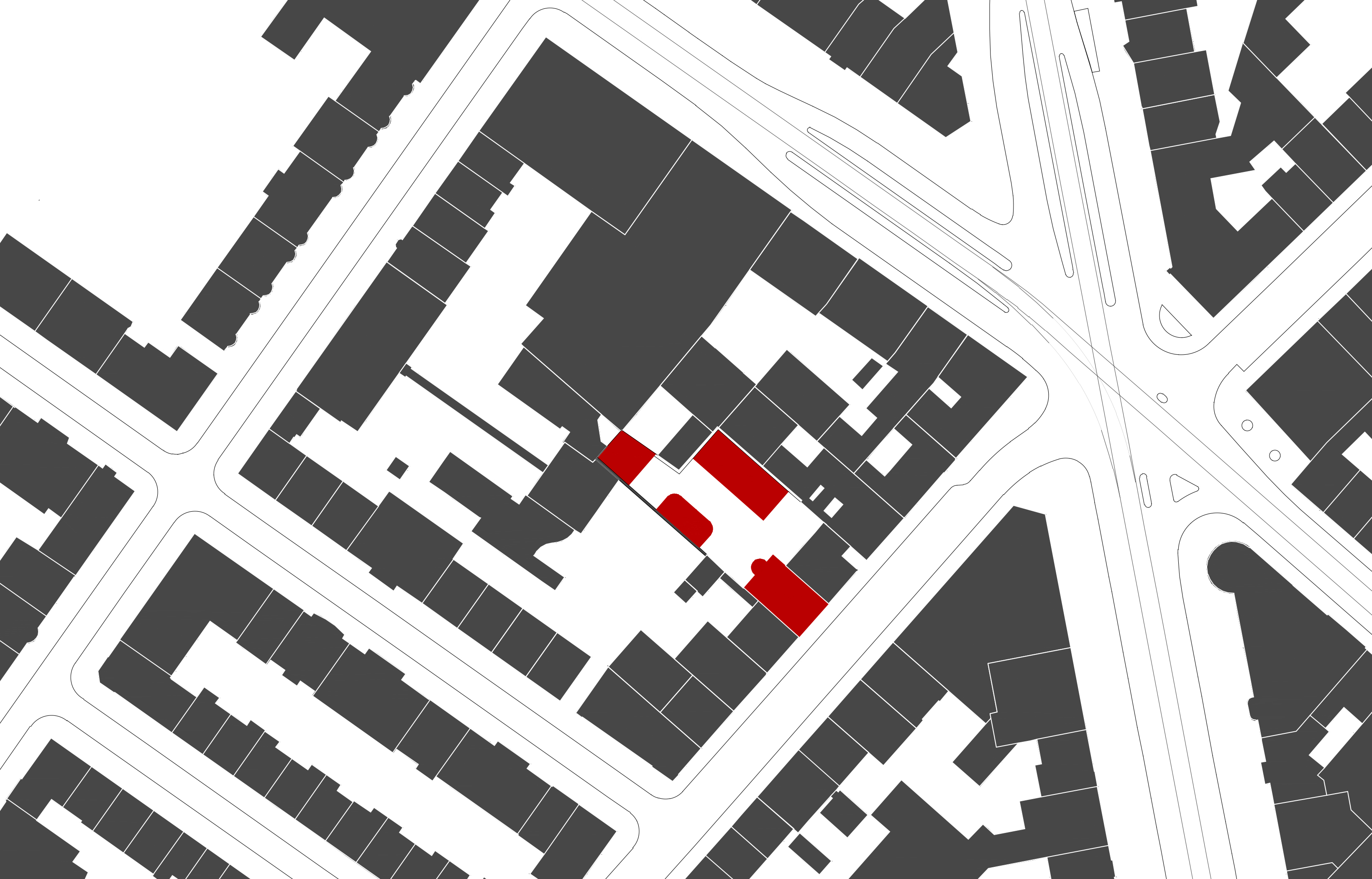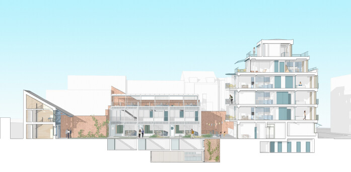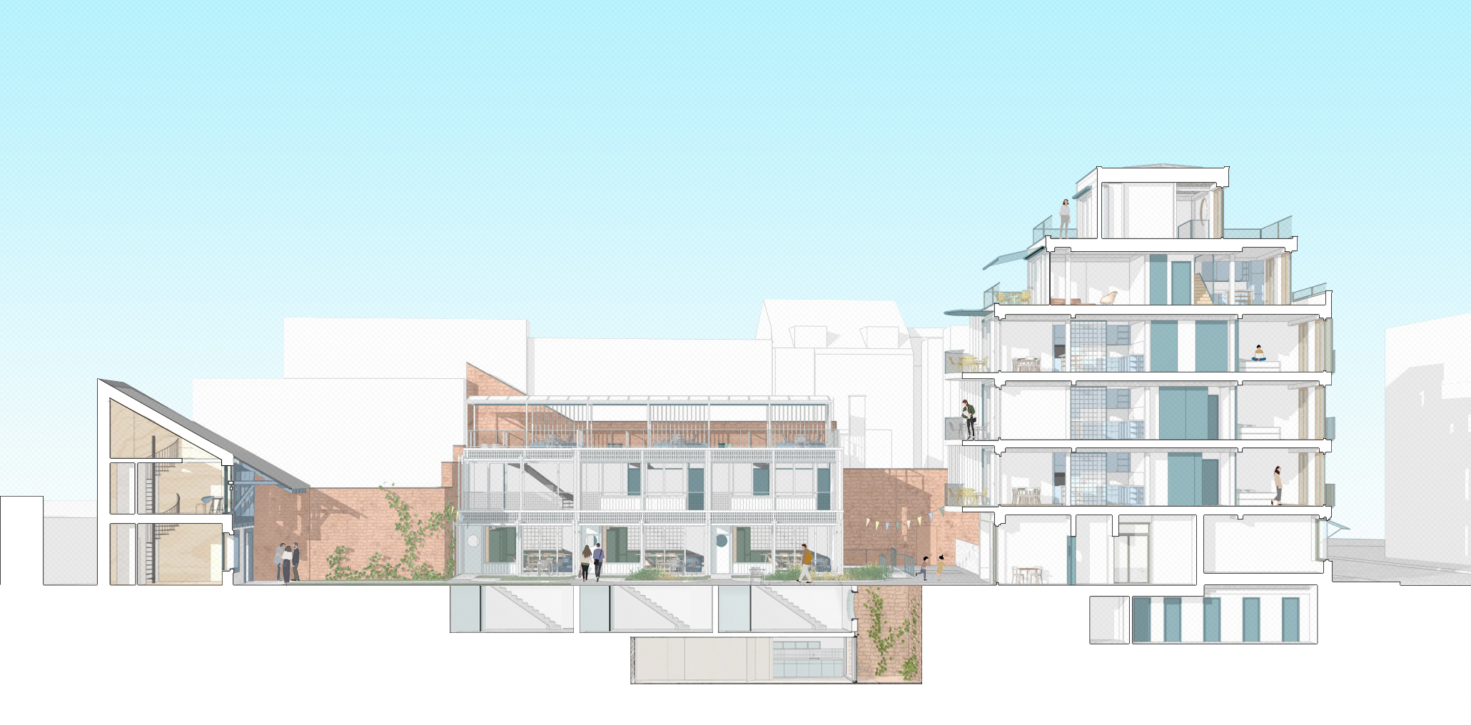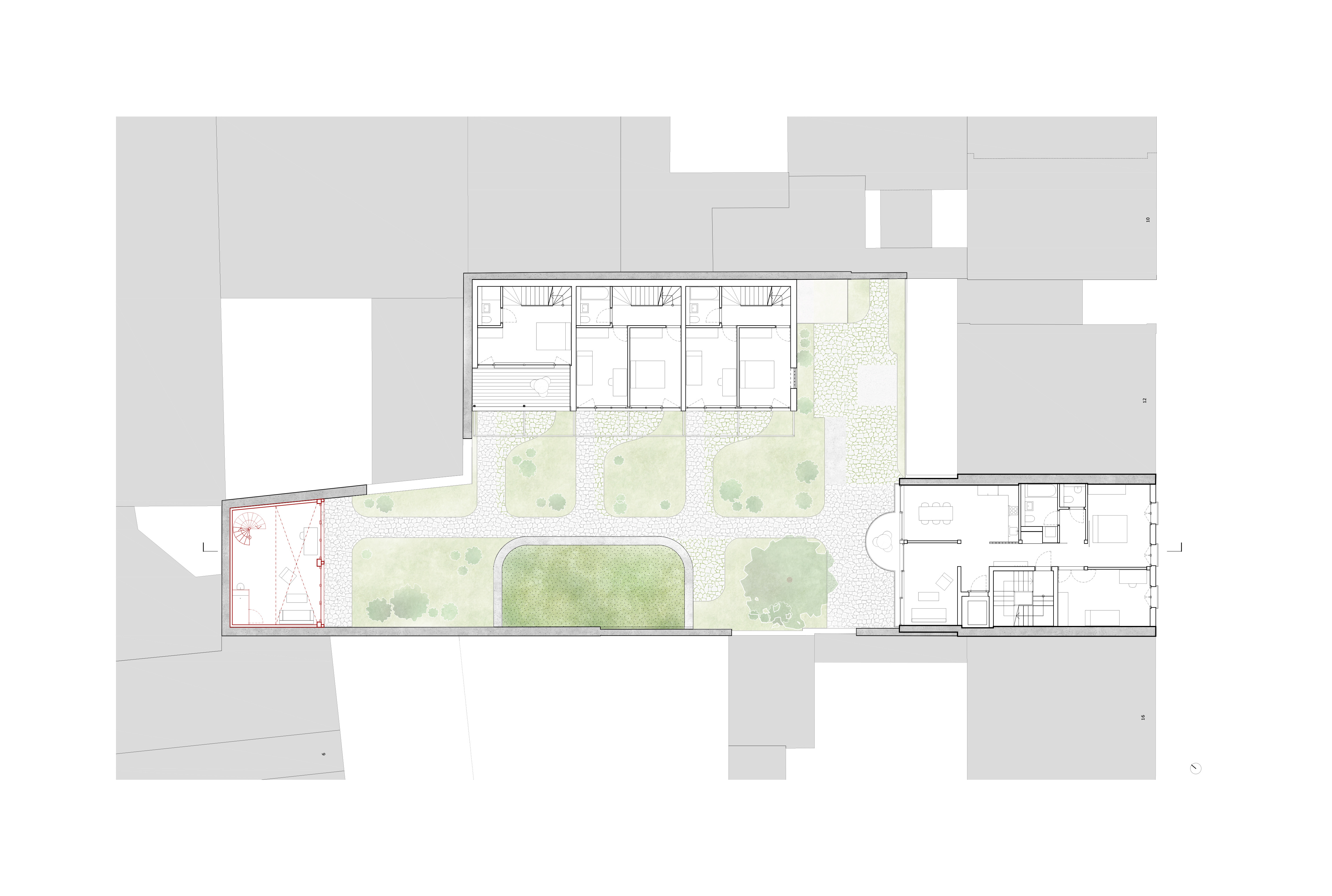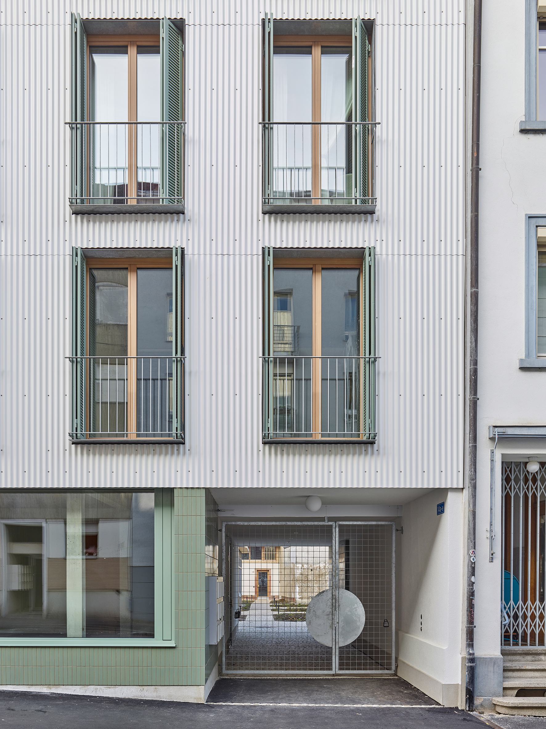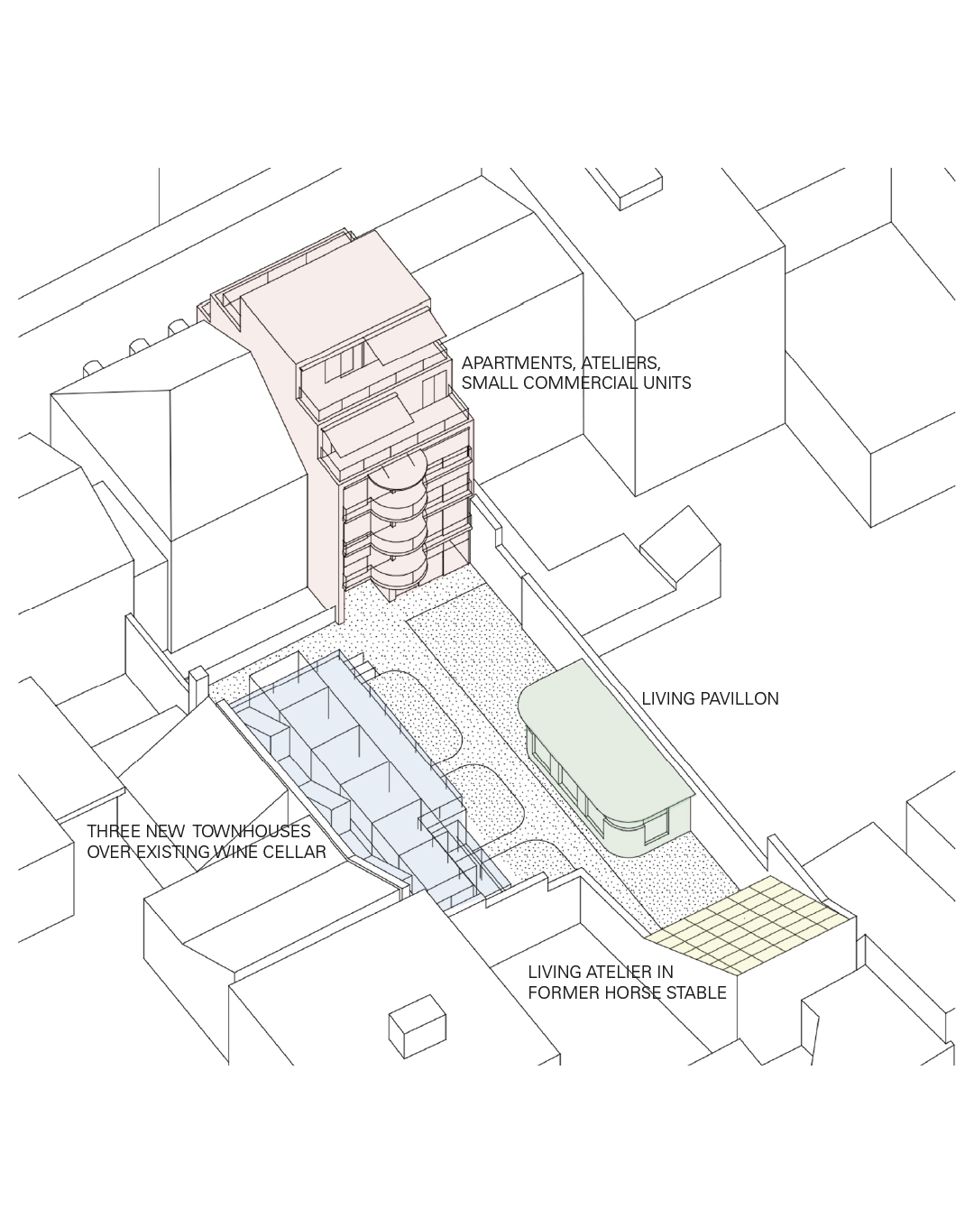 Densification of a backyard in Basel: an urban ensemble of apartments, small shops, town houses, studios and pavilion living in a communal courtyard.