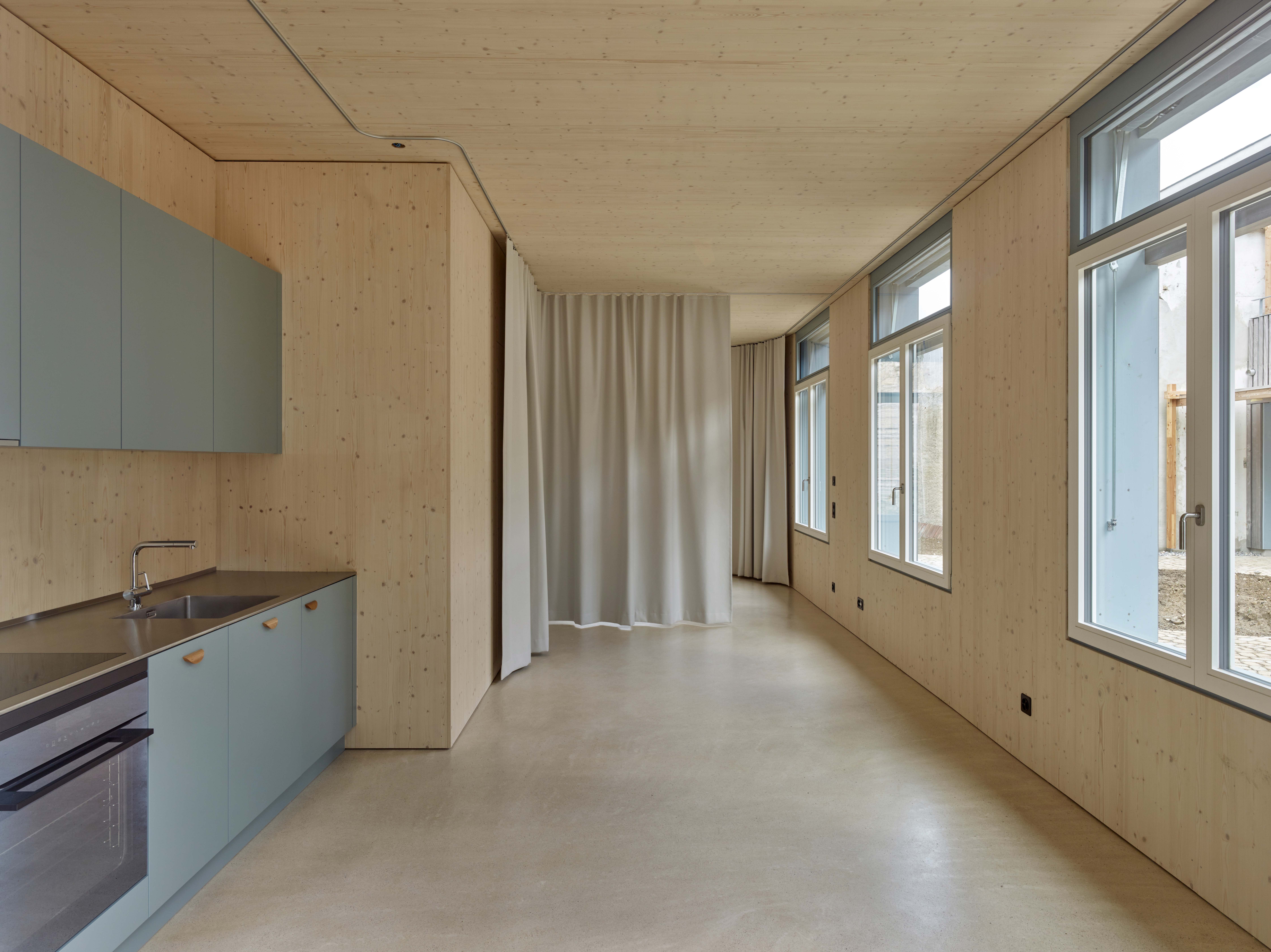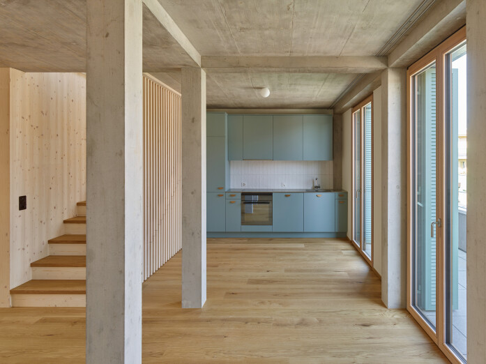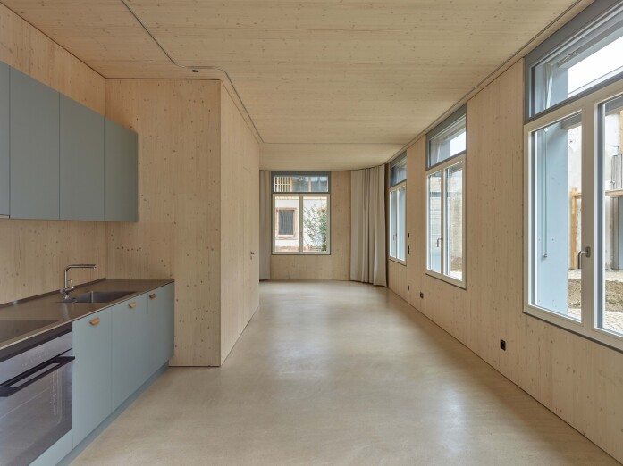 These new buildings are constructed as sustainable structures using wood and wood-concrete hybrid construction methods and require almost no excavation work. Despite their compact layout, the floor plans are characterized by clear views, spatial diversity, and visual connections to the courtyard. The structural detailing, materials, and differentiated color scheme create a rich courtyard ensemble with residential, small commercial, and communal uses.