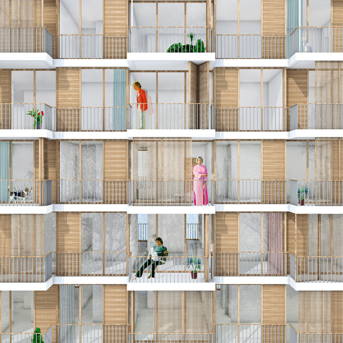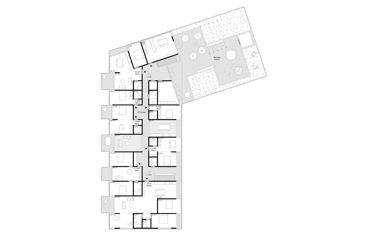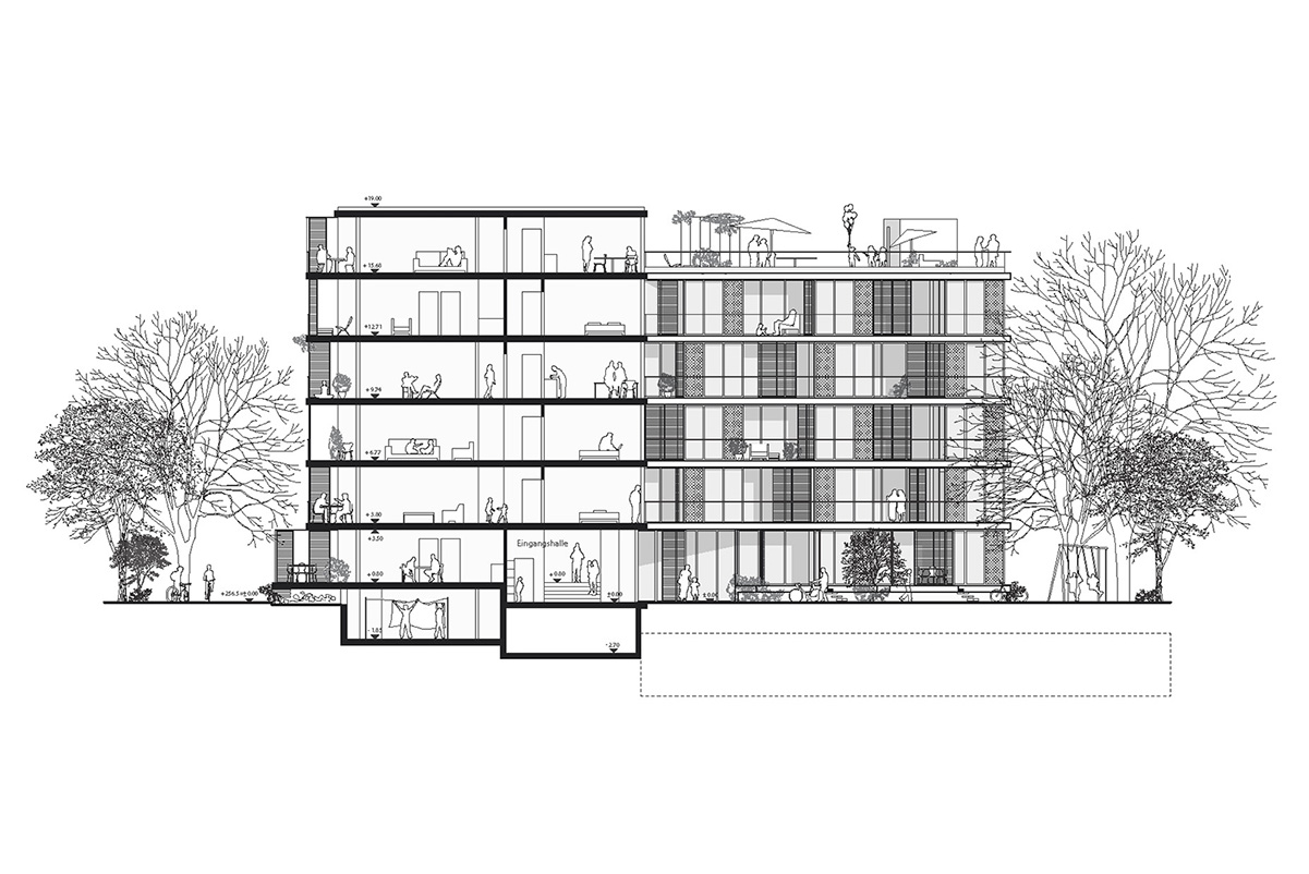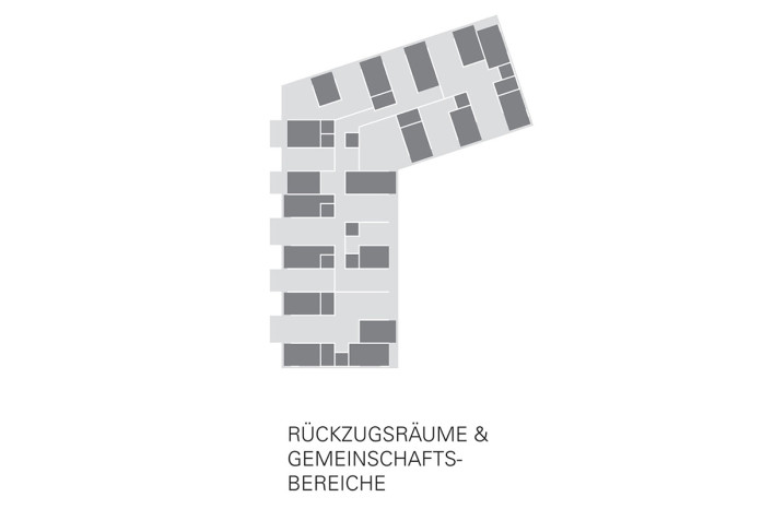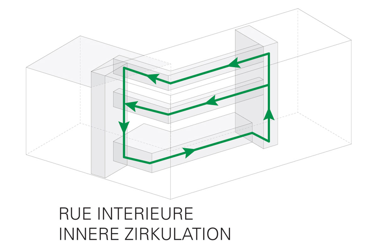 - is undergoing a transformation into a new urban quarter. In its centre lies a generous new park, the edges of which are defined by a series of apartment buildings and diverse, communal amenities such as a café, a swimming pool and a kindergarten. The proposed apartment building is a contribution to new forms of dwelling typologies; a mix of open and closed cluster apartments, shared apartments and traditional apartment layouts is offered. The communal spaces such as the multi-purpose entry hall, the roof terrace and the communal kitchen and recreation room are connected through an interior street; a rue interieure. The apartments floor plans are compact and spatially efficient , and therefore result in affordable rents. The two-sided orientation of the living areas to the park and the courtyard add spatial generosity and diversity to the apartments. The structure is based on a simple column grid, with non load-bearing partition walls in order to maintain long term flexibility.