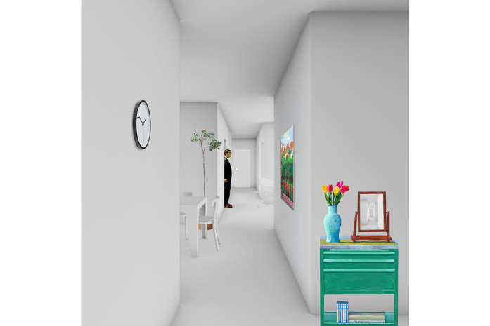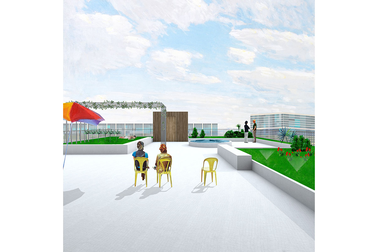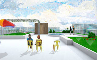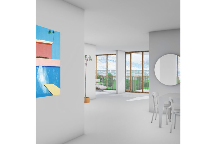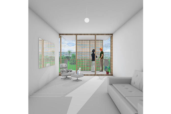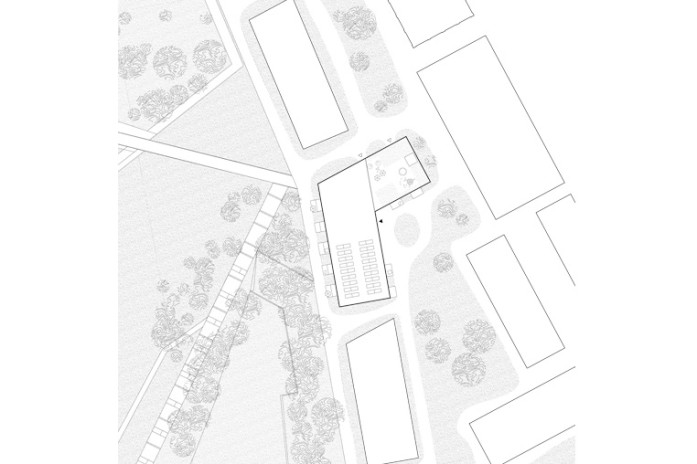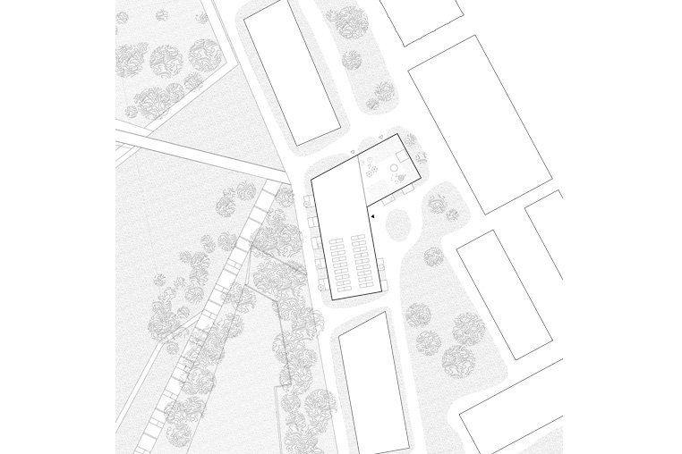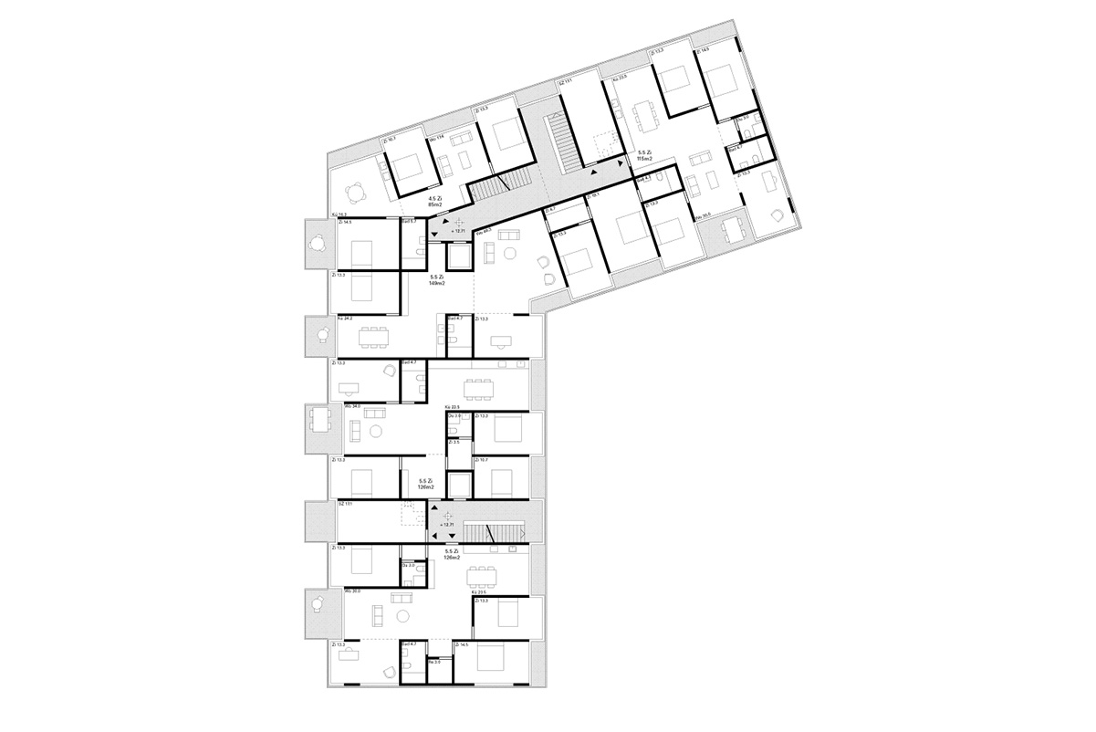 - is undergoing a transformation into a new urban quarter. In its centre lies a generous new park, the edges of which are defined by a series of apartment buildings and diverse, communal amenities such as a café, a swimming pool and a kindergarten. The proposed apartment building is a contribution to new forms of dwelling typologies; a mix of open and closed cluster apartments, shared apartments and traditional apartment layouts is offered. The communal spaces such as the multi-purpose entry hall, the roof terrace and the communal kitchen and recreation room are connected through an interior street; a rue interieure. The apartments floor plans are compact and spatially efficient , and therefore result in affordable rents. The two-sided orientation of the living areas to the park and the courtyard add spatial generosity and diversity to the apartments. The structure is based on a simple column grid, with non load-bearing partition walls in order to maintain long term flexibility.