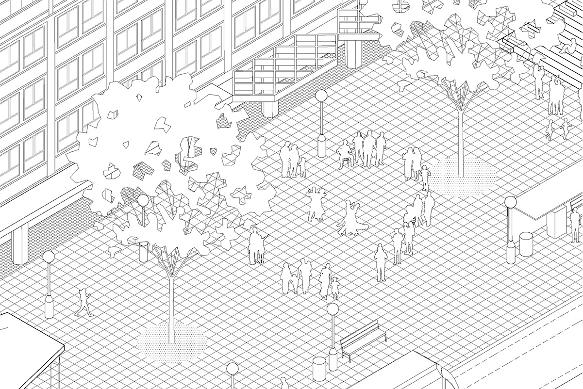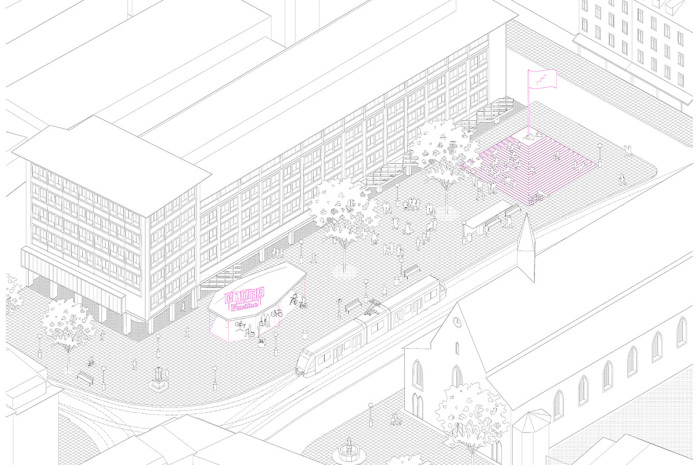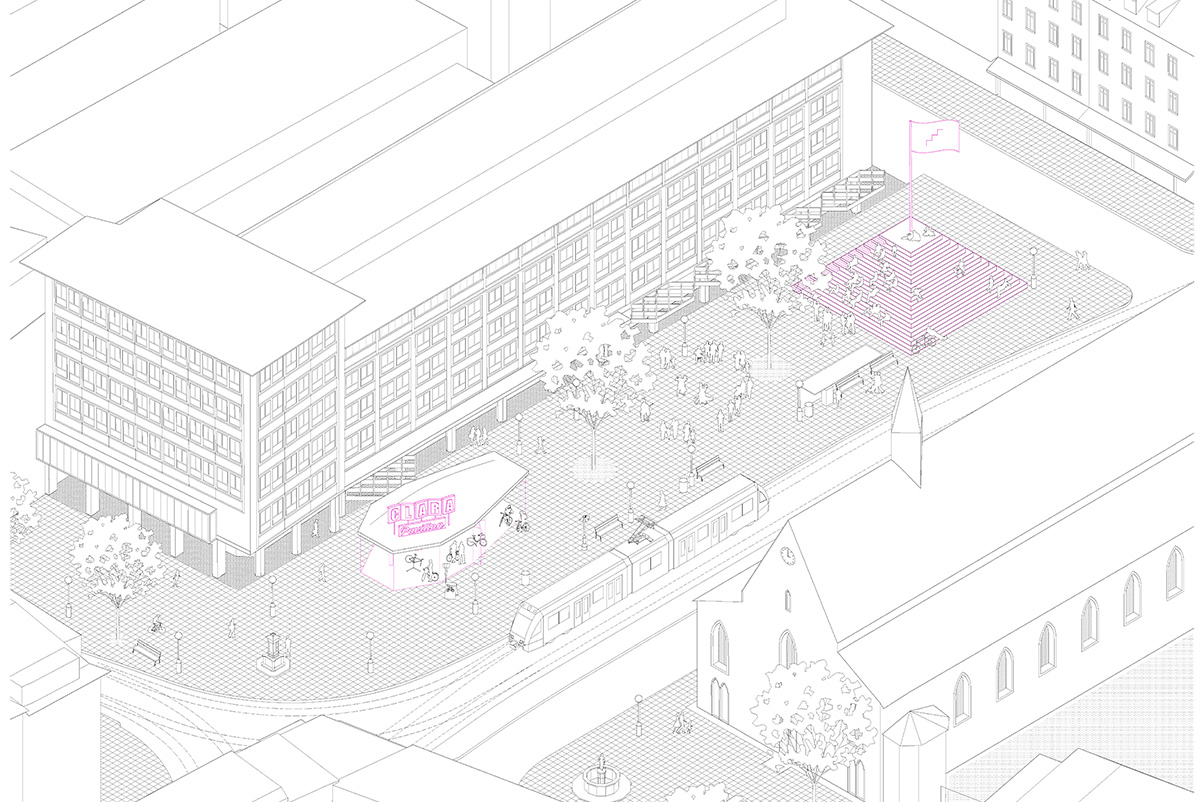 Located in the lively, multi-cultural neighbourhood of Kleinbasel, Claraplatz is a main square that has been dissected and distorted into a central transport hub. Consequently, its potential as a public space is under-exploited, making it a transitory node rather than an attractive place to gather in. Seating possibilities do not go beyond linear urban benches and open areas are occupied by formalized, unusable vegetation.