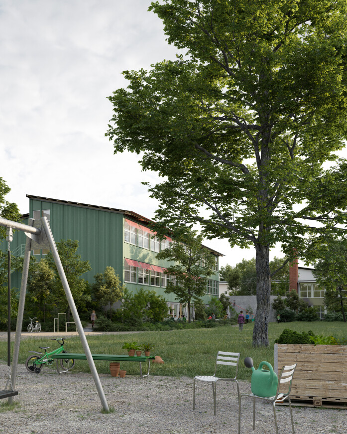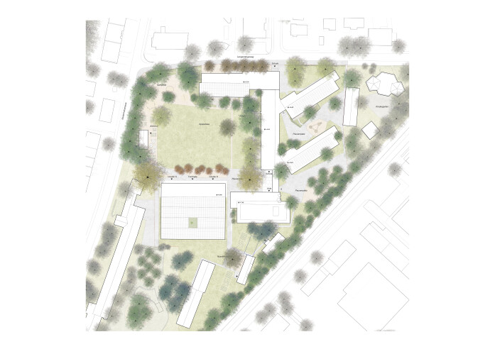 The current school complex, which has grown over the years, is characterised by a large open playground area with a great variety of trees and by the pavilion school by Rasser & Vadi Architects carefully integrated with the topography.  In the area facing the railway tracks, the side wings and the simple wooden pavilions create further diverse and small-scale external spaces. Together, the buildings and green spaces form a very harmonious, varied and finely scaled overall complex.