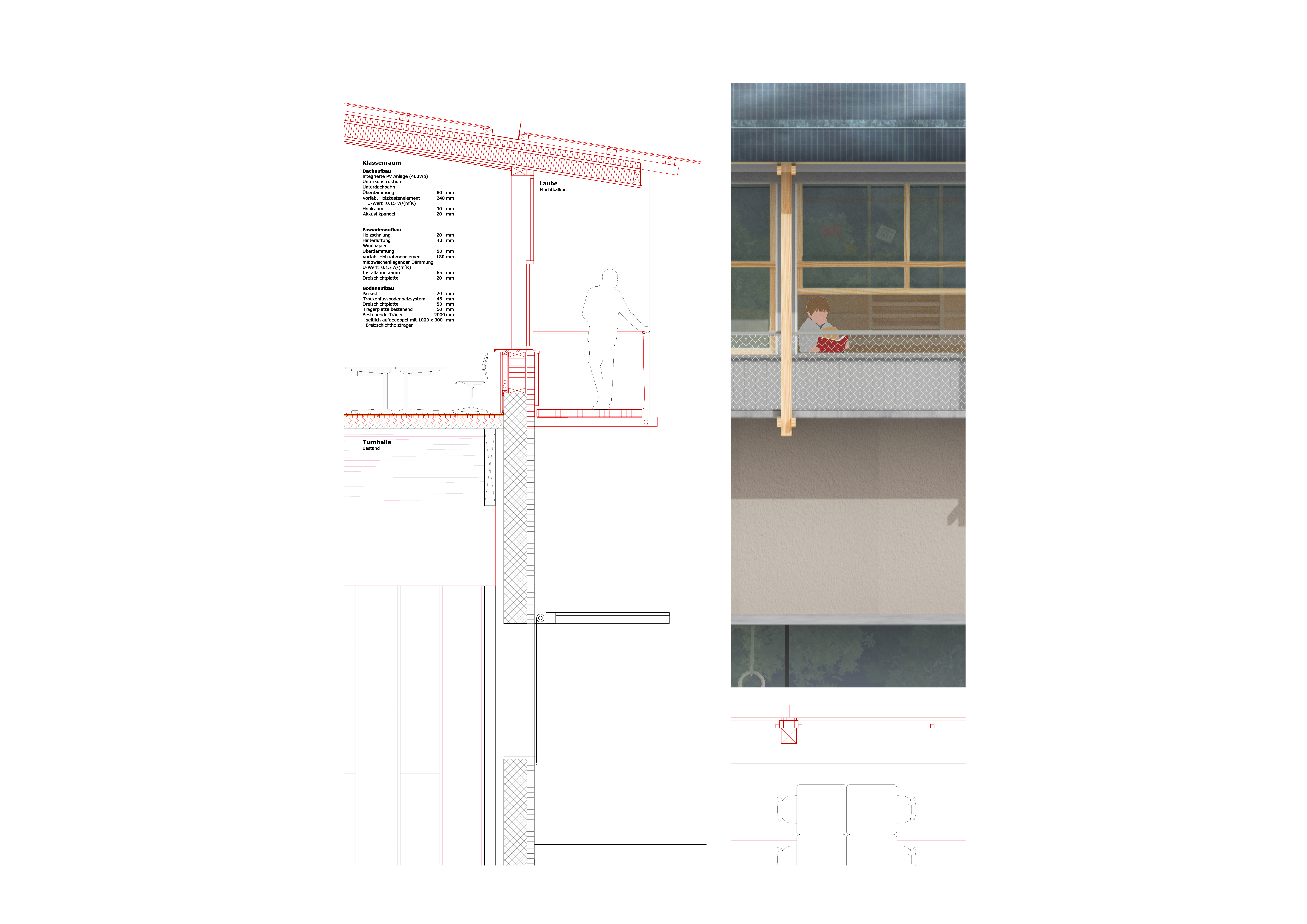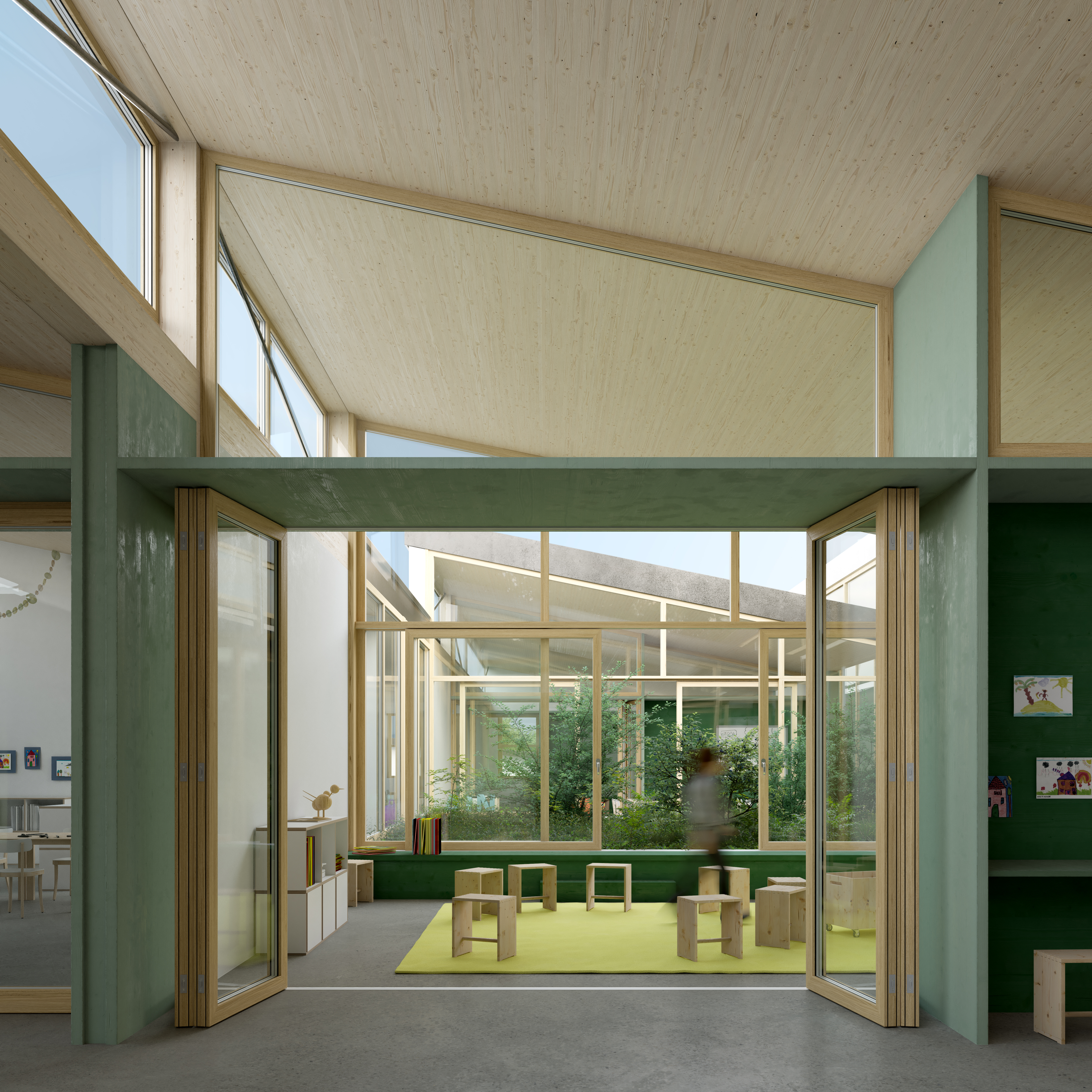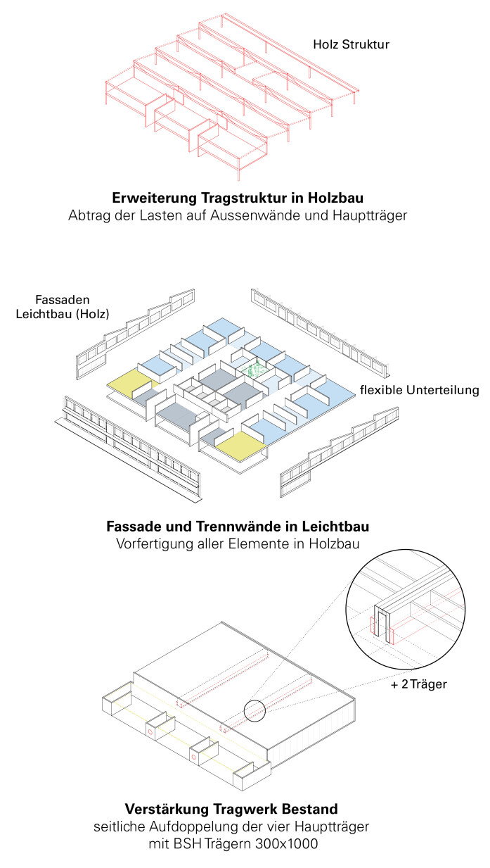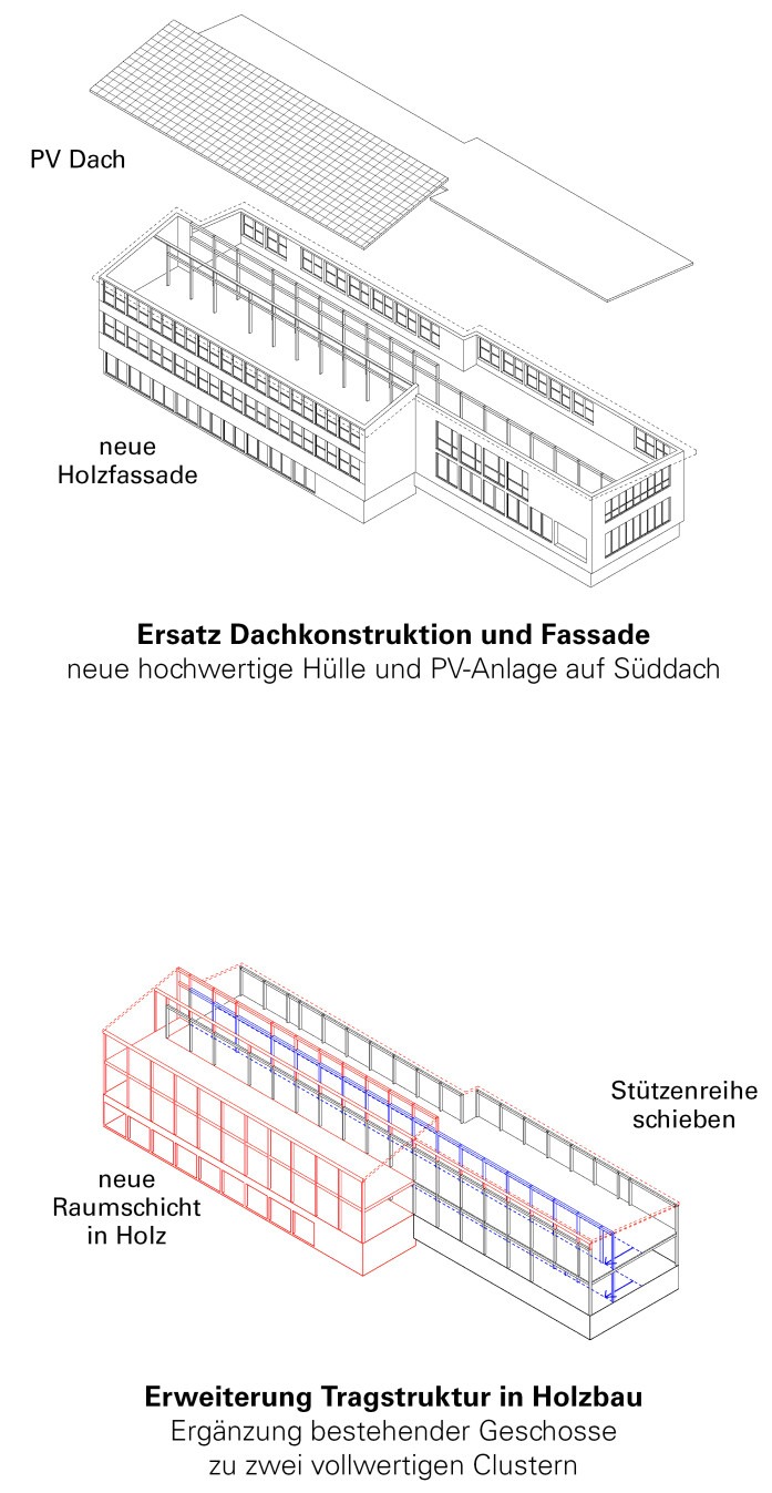 The new buildings are designed with resource-saving timber constructions. The arrangement of additions inside and on top of the existing buildings minimises excavation and land consumption. Both the slender load-bearing structures and all the façades are in timber. As a result, the new buildings form an independent addition to the school in solid construction.