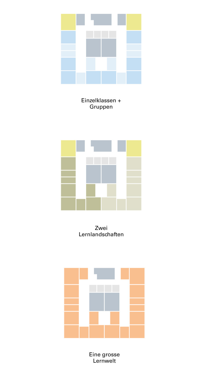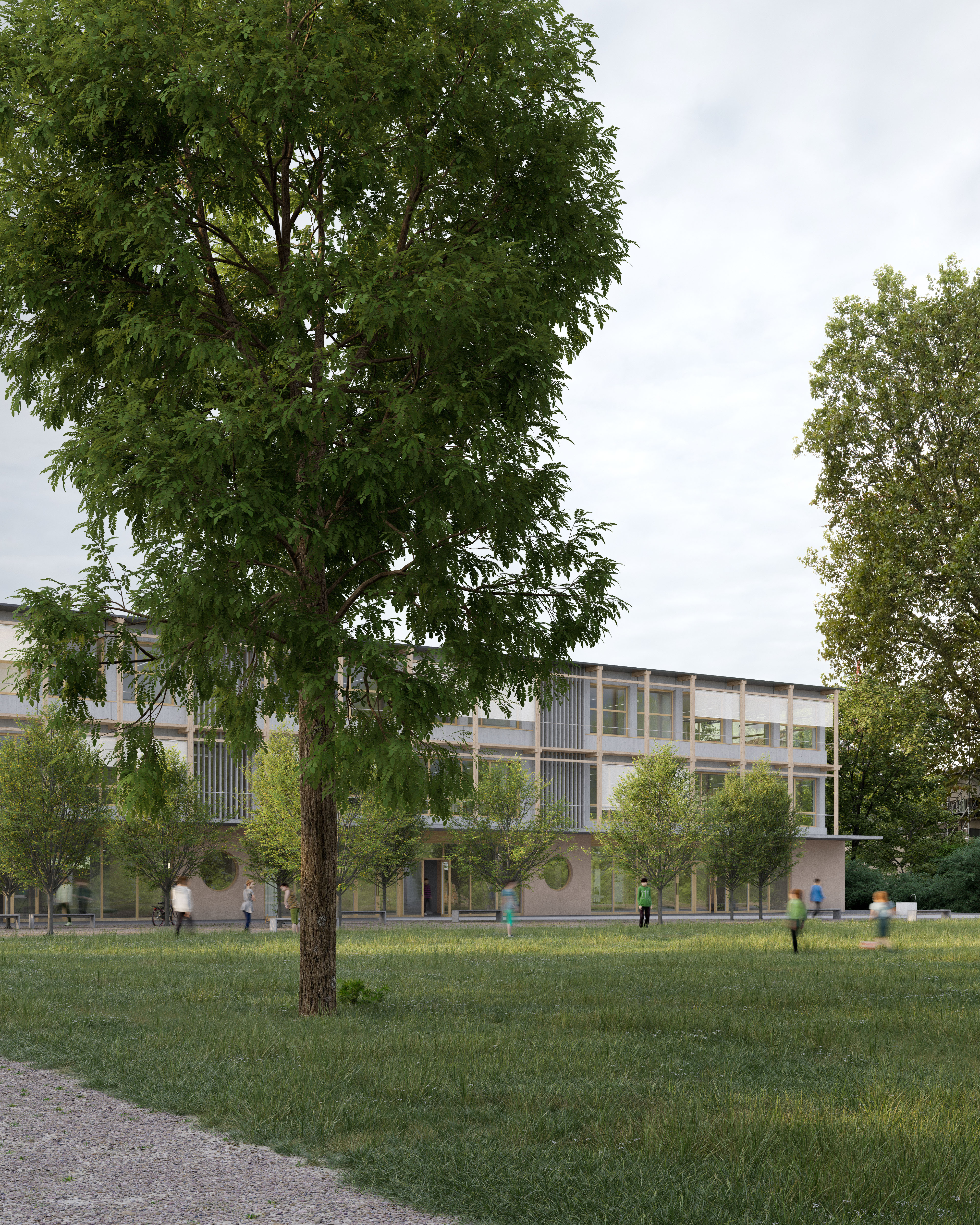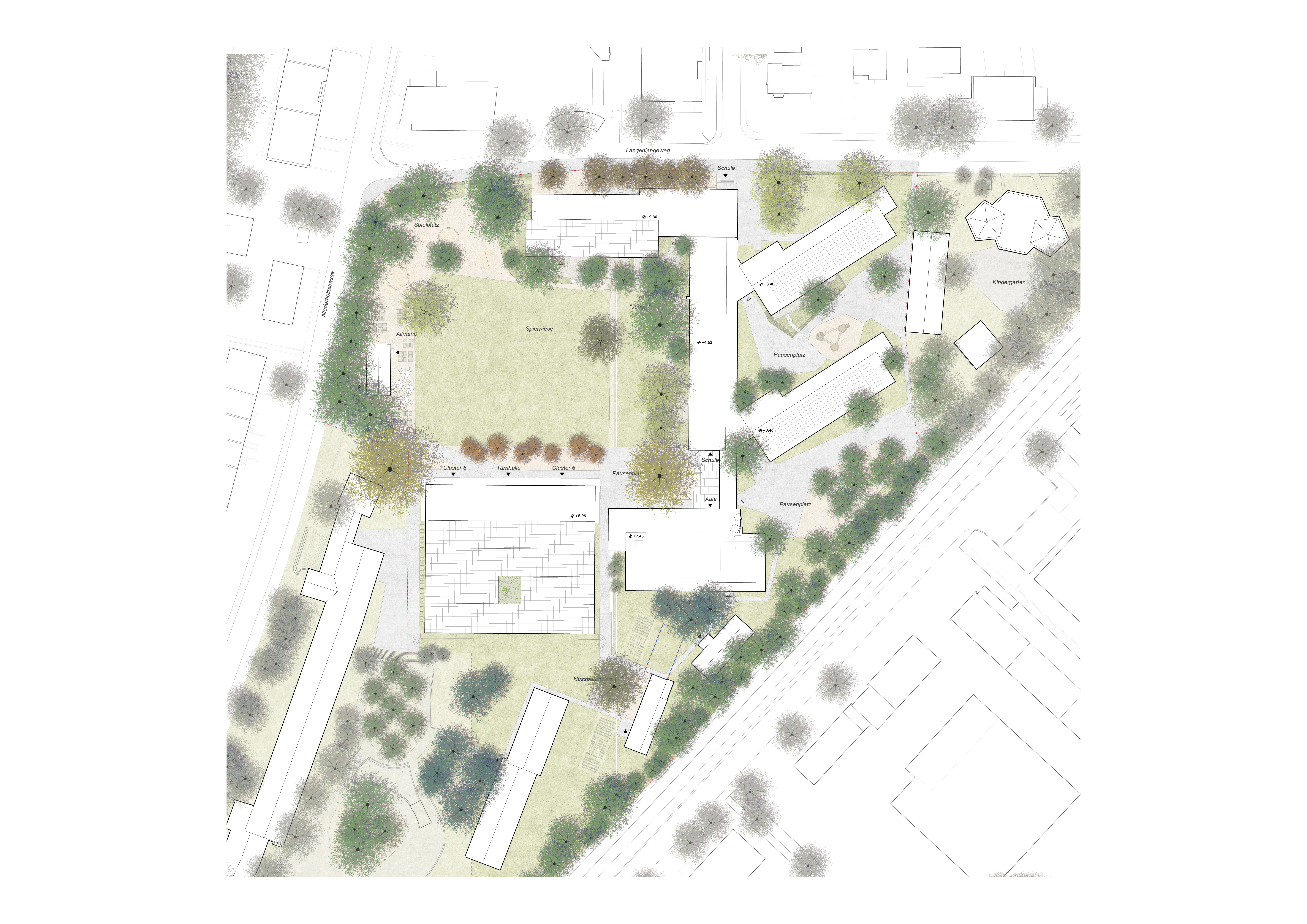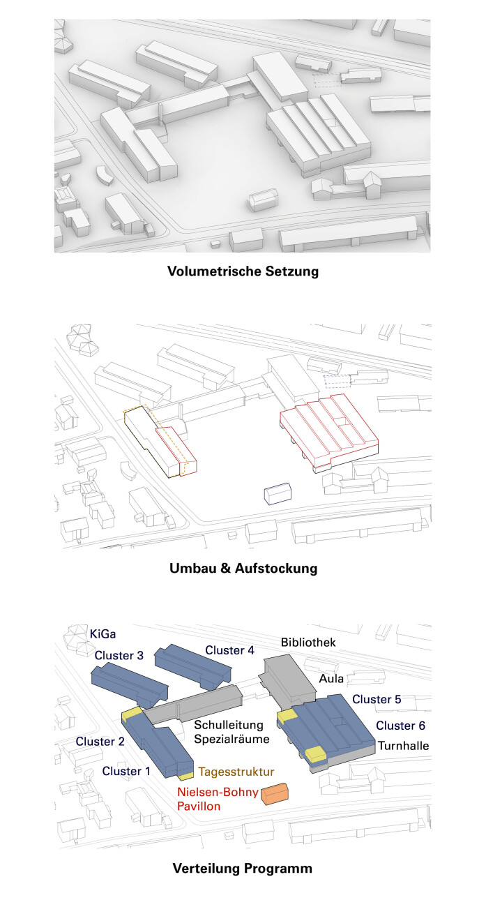 The addition of an extra layer of rooms to Wing A and the extension and activation of the sports hall means that hardly any additional space is required. The large open space with the playground area along Niederholzstrasse will have on all sides various functions and uses for schools, sports and the neighbourhood.