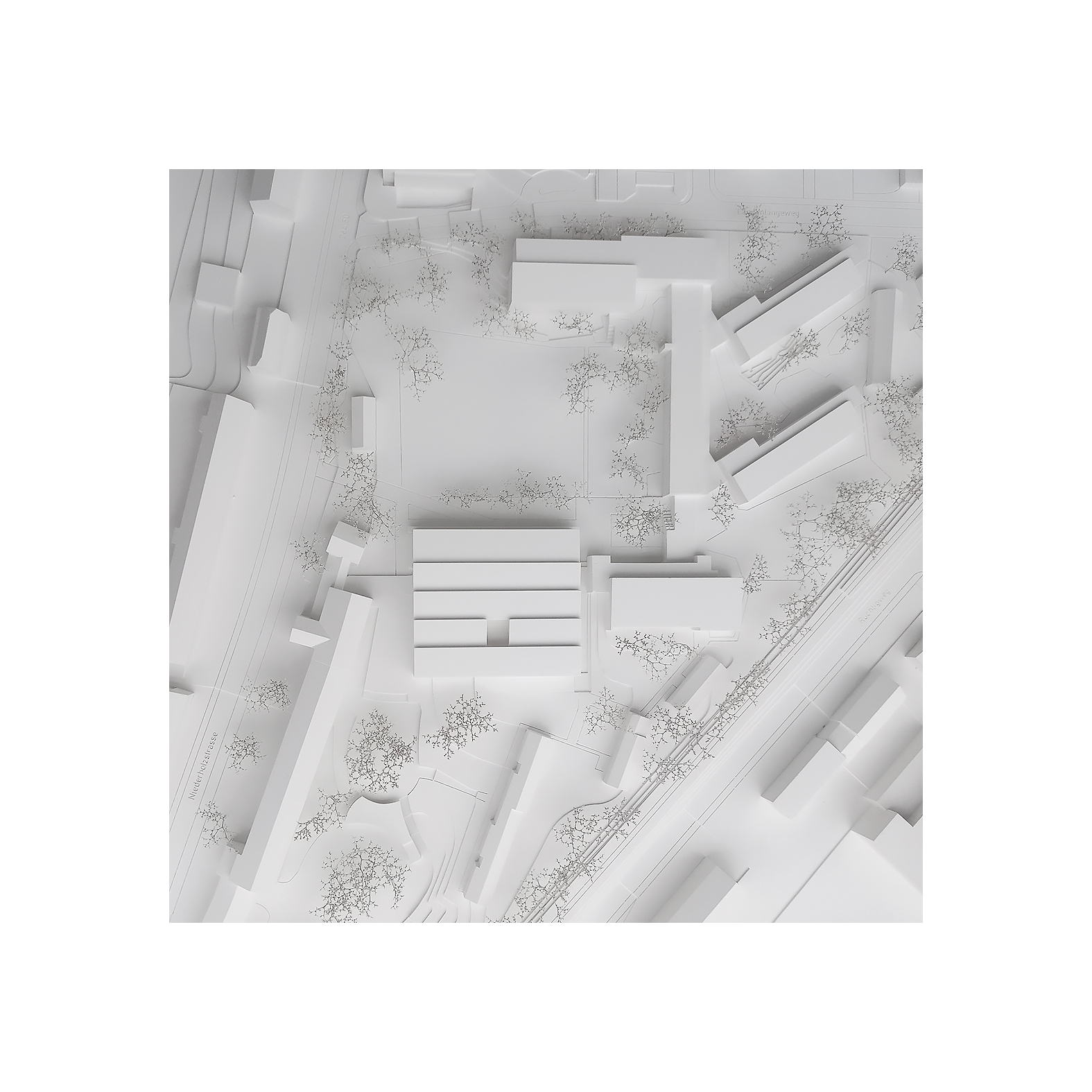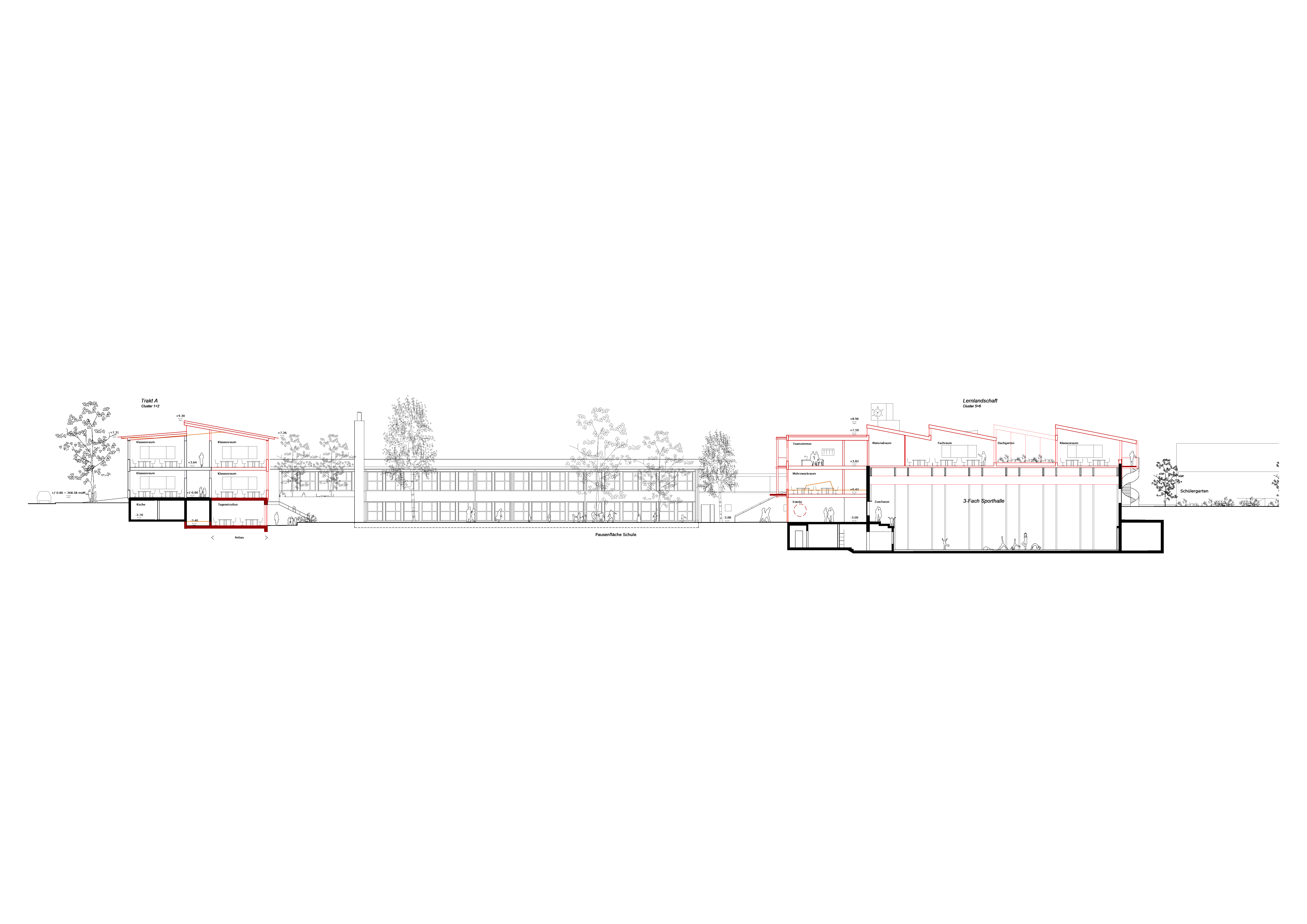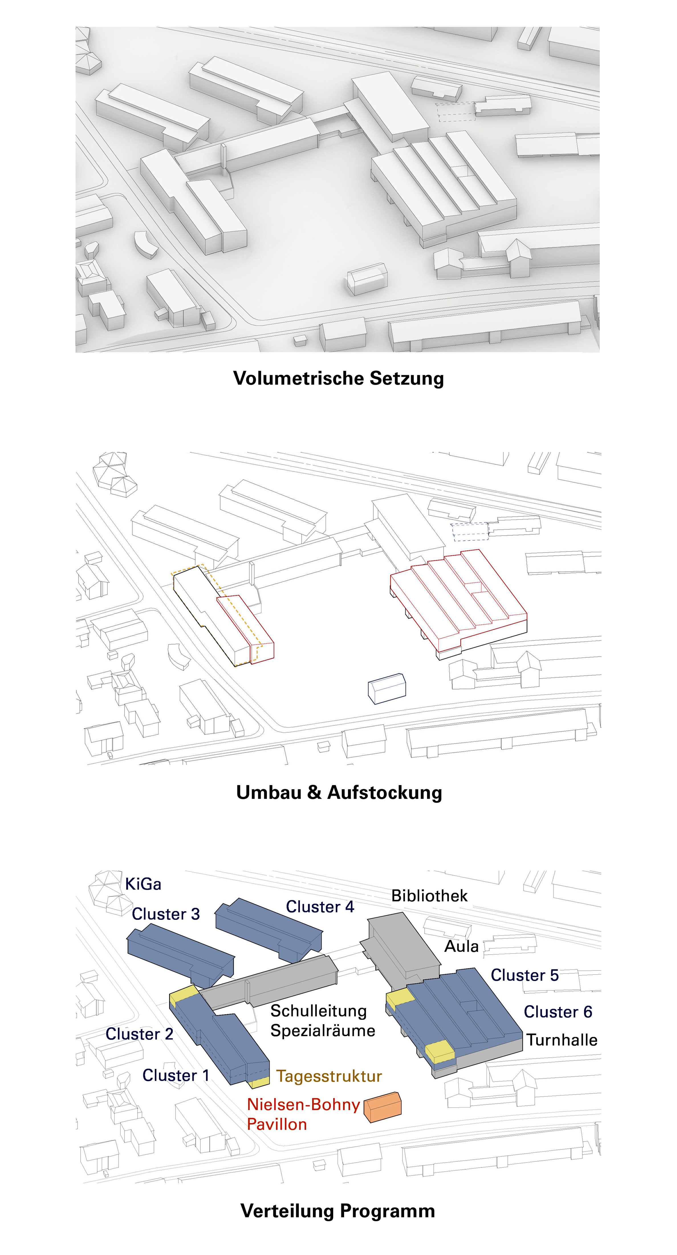 The addition of an extra layer of rooms to Wing A and the extension and activation of the sports hall means that hardly any additional space is required. The large open space with the playground area along Niederholzstrasse will have on all sides various functions and uses for schools, sports and the neighbourhood.