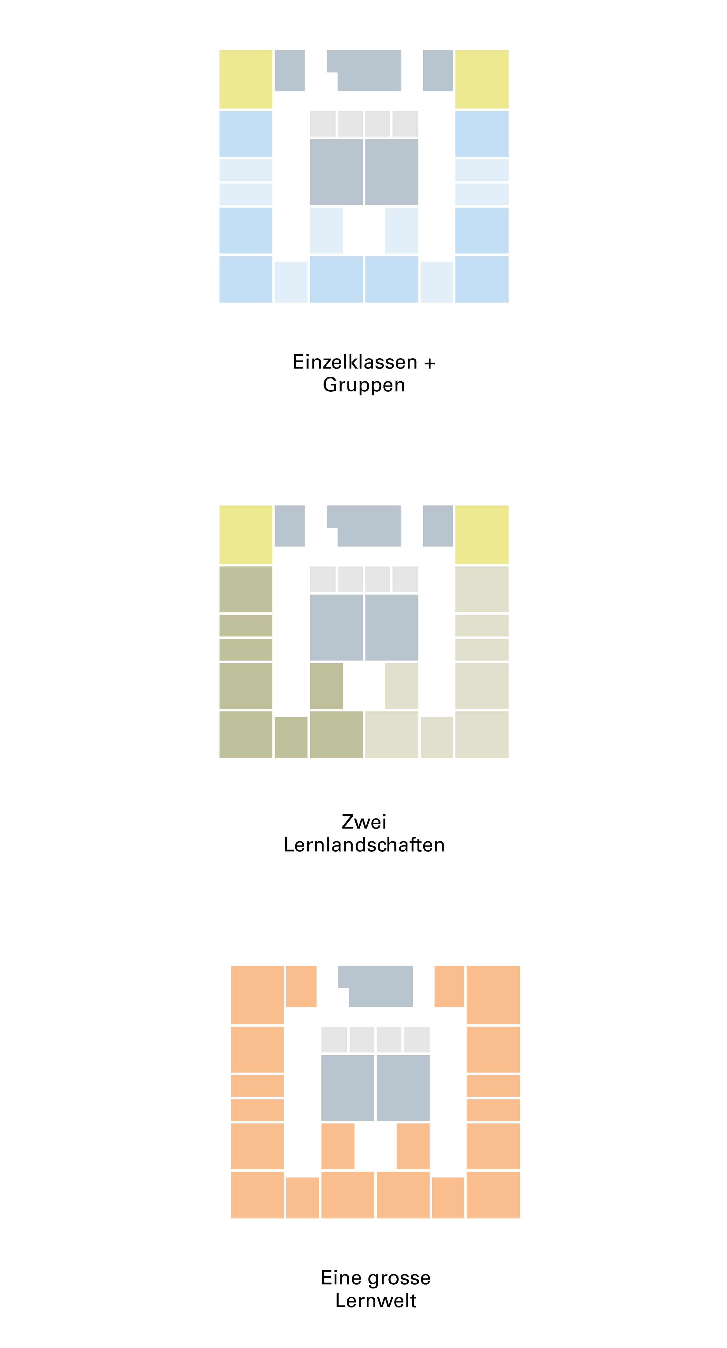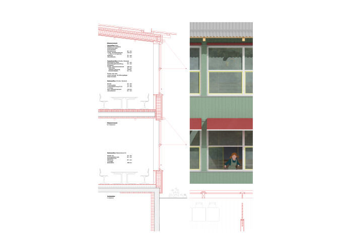 Then as now, the scarcity of resources characterises the chosen construction method. As contrasting and independent as the school buildings may appear at first glance, they are nevertheless related in their unpretentious attitude and their endeavour to create light-flooded rooms. The sustainable construction and choice of materials, the use of filigree woodwork and the chosen colour palette create an exciting dialogue between them.