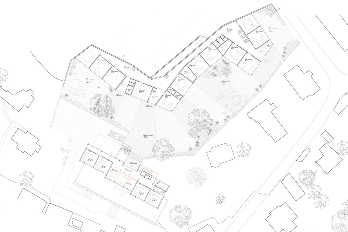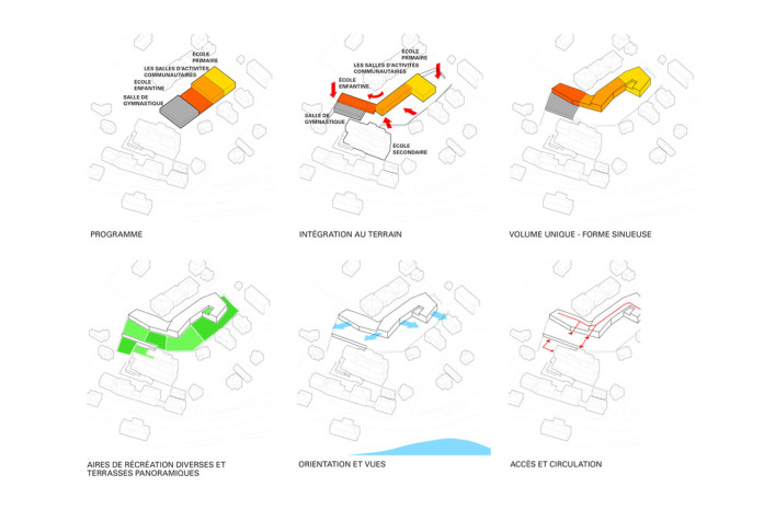 Le nouveau complexe scolaire suit la topographie du terrain; l’école primaire, les salles d’activités communautaires, l’école enfantine et la salle de gymnastique se juxtaposent pour former un bâtiment de forme allongée et sinueuse. Grace à cette forme, chaque partie du bâtiment bénéficie d’une orientation idéale et d’espaces extérieurs adéquats. Sa forme terrassée épousant la forme du terrain garantit aux aires de récréation un bon ensoleillement ainsi qu’une belle vue.