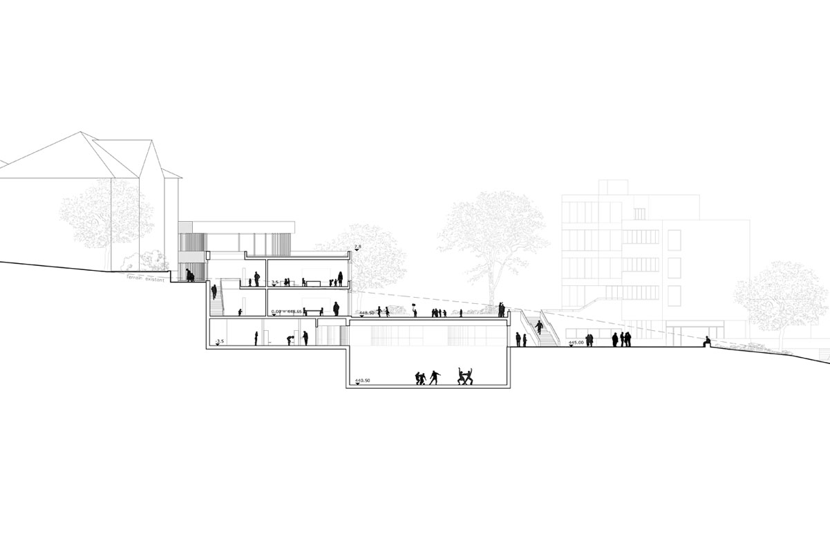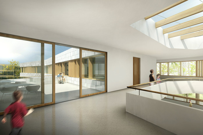 L’emplacement du nouveau bâtiment dans la partie nord du site respecte ainsi le bâtiment scolaire existant et offre la possibilité d’une cour de récréation commune. Parfois surbaissé ou rehaussé le bâtiment s’intègre ainsi parfaitement au terrain. La stratification horizontale prononcée donne une échelle adéquate pour l’école et à ses utilisateurs.