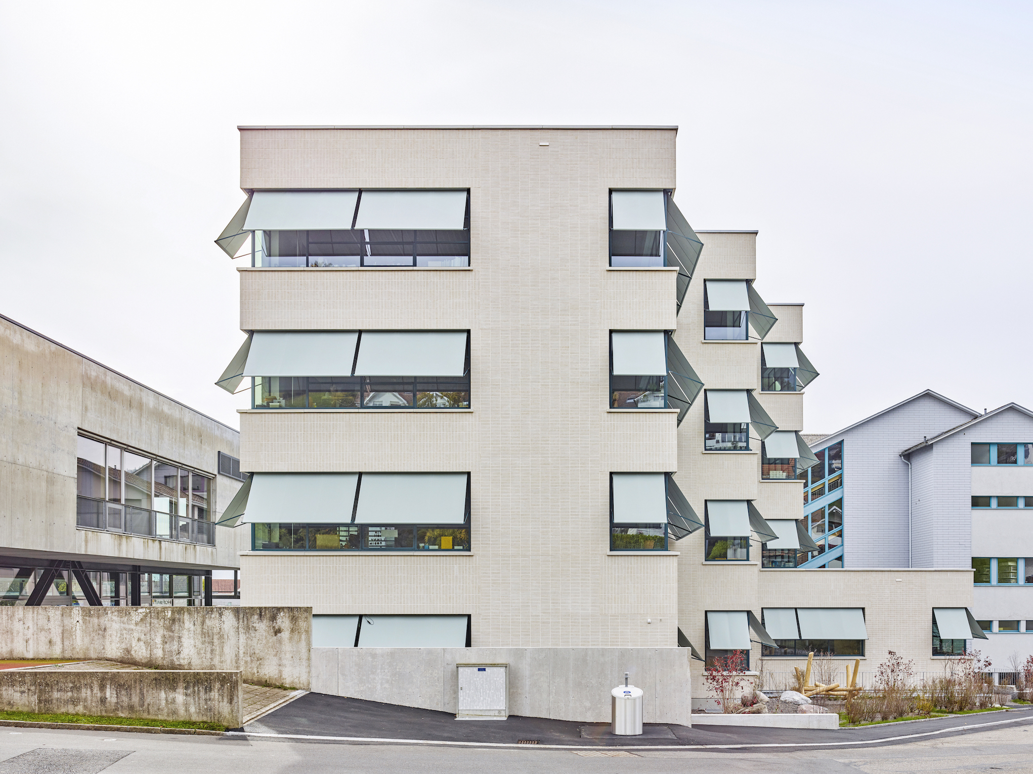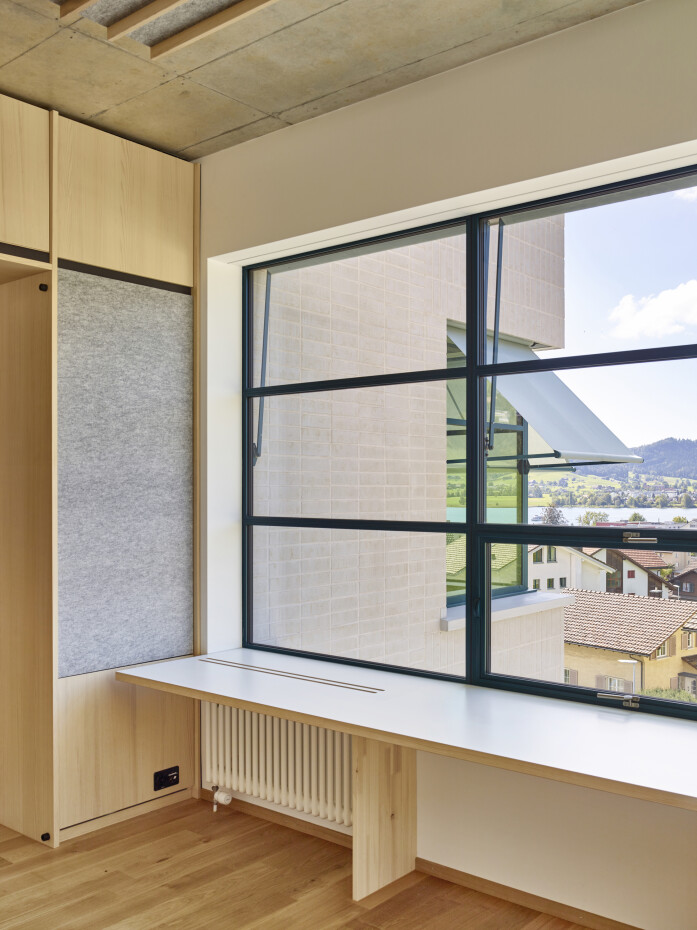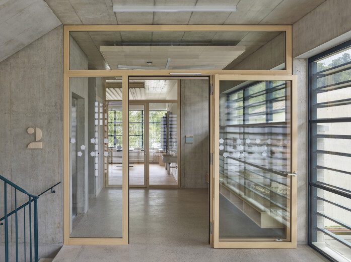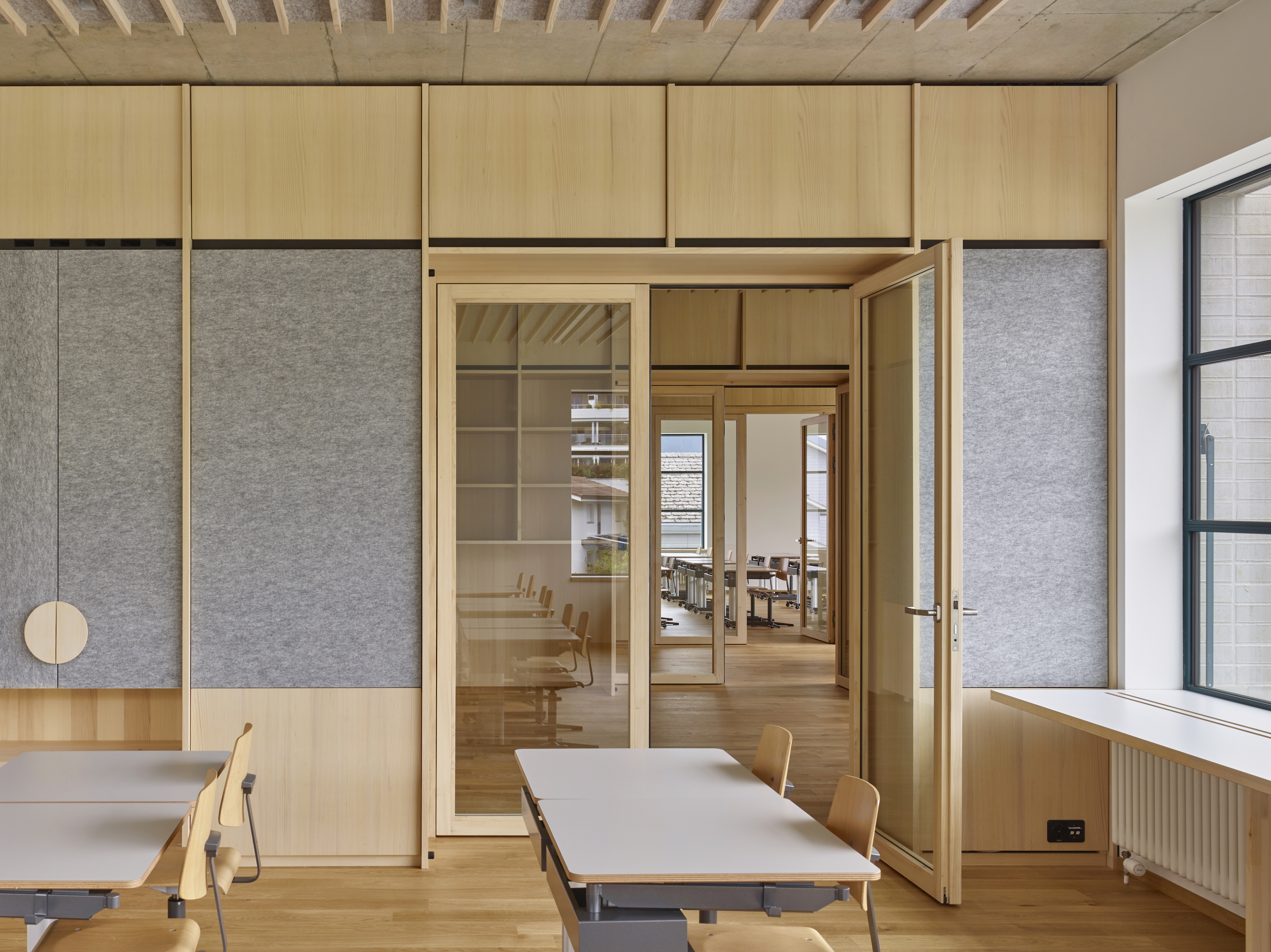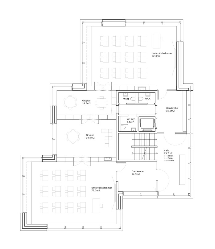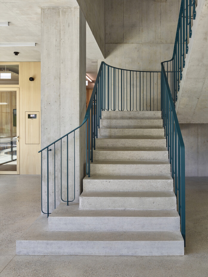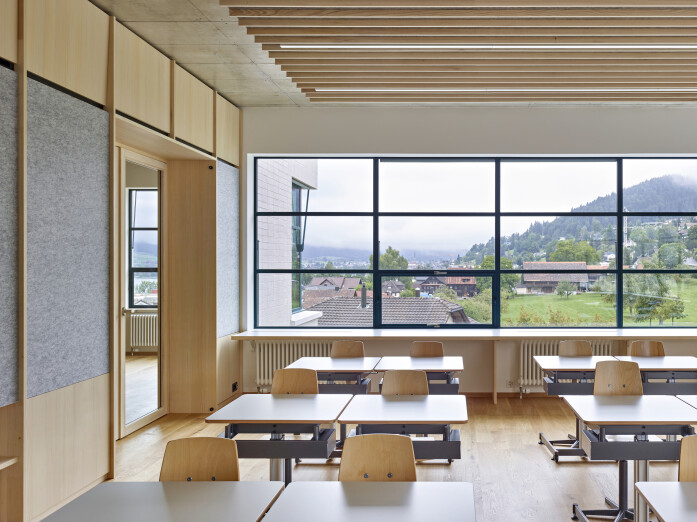 The school building has seven classrooms with associated group-rooms, a multi-purpose room and a large teacher's area. The classrooms are grouped around the central staircase and have each views to the outside with their two sided orientation. The arrangement of the classrooms and group-rooms produce an enfilade which allows for cross-class teaching and exchange between the students and teachers.