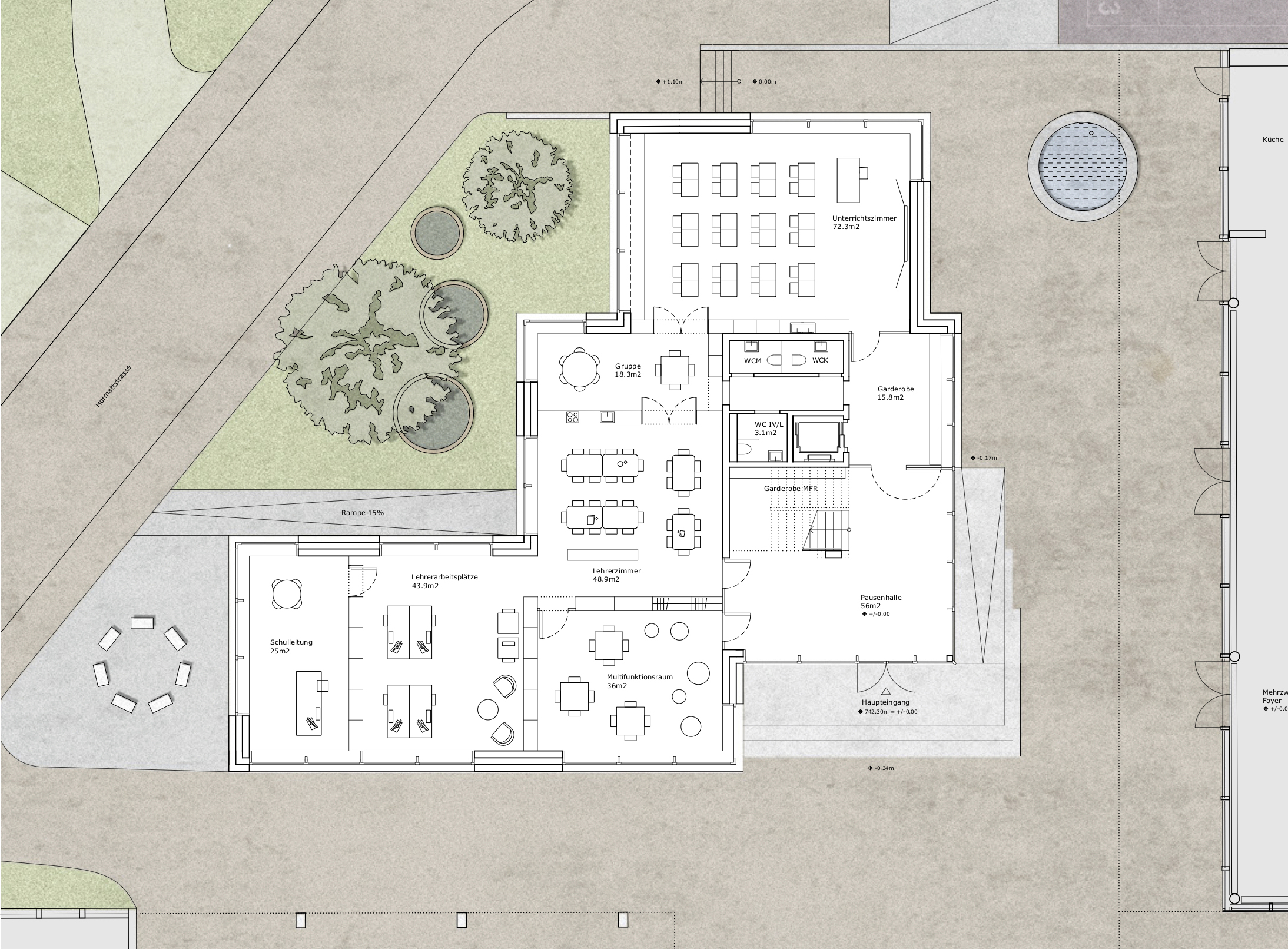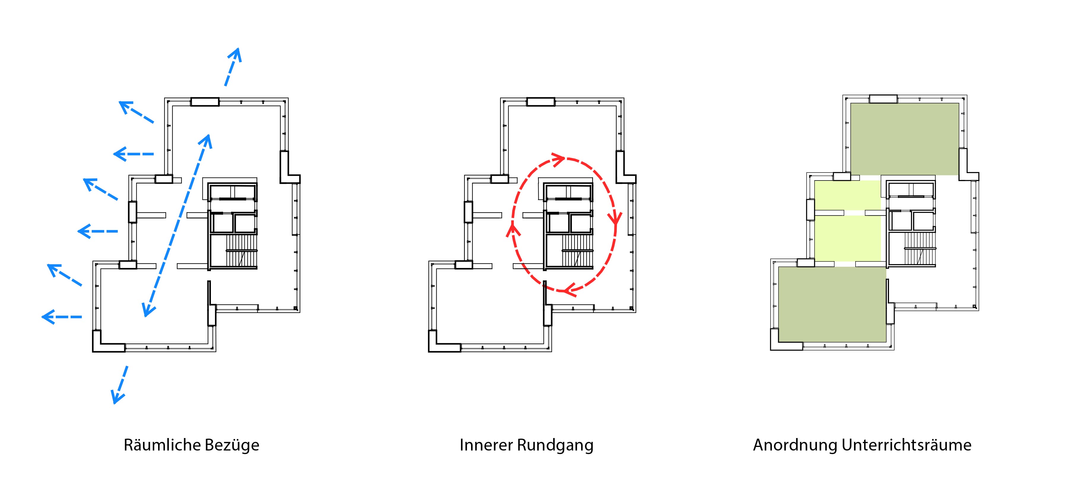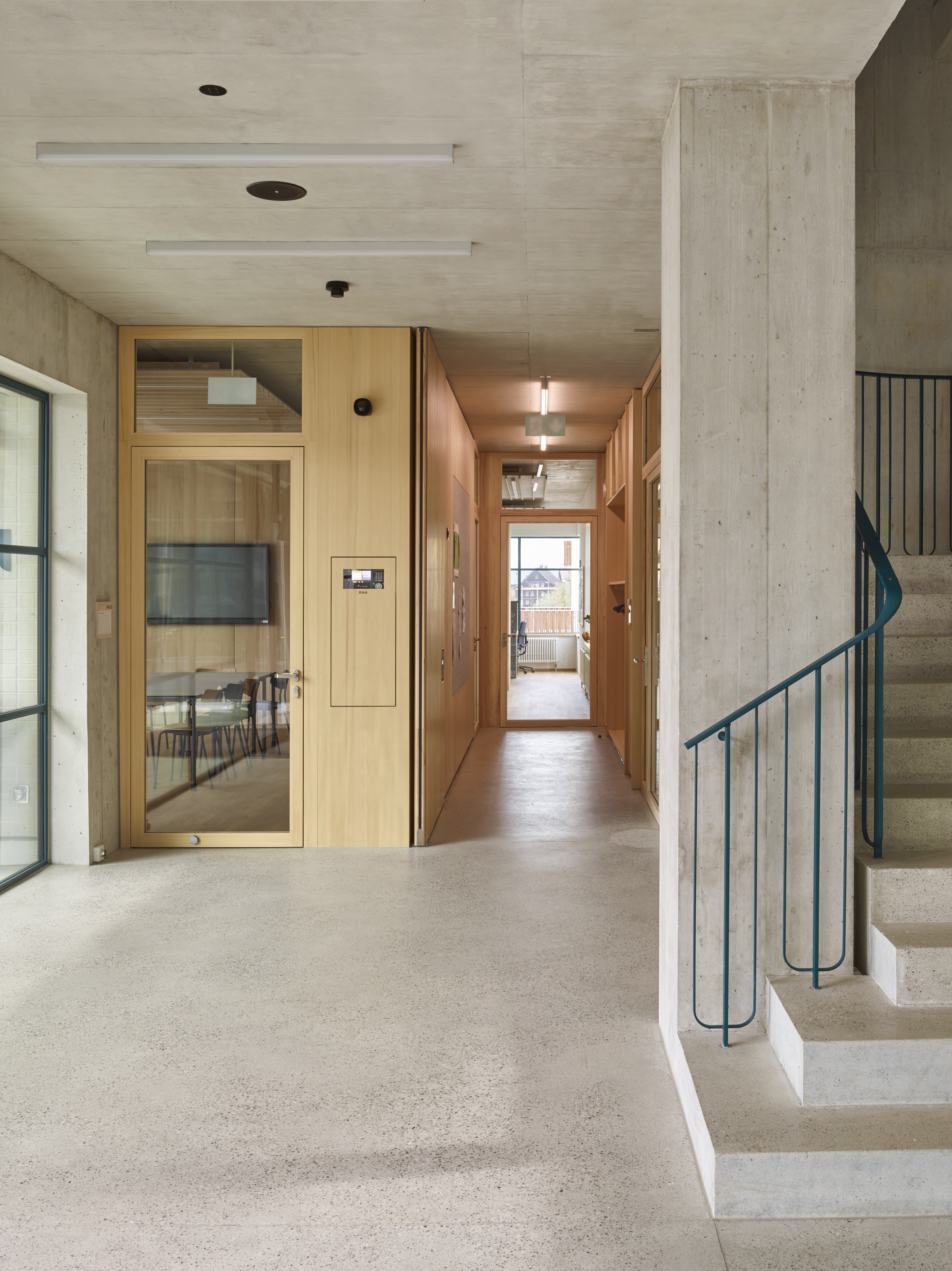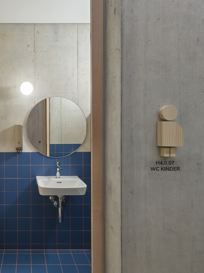 The school building has seven classrooms with associated group-rooms, a multi-purpose room and a large teacher's area. The classrooms are grouped around the central staircase and have each views to the outside with their two sided orientation. The arrangement of the classrooms and group-rooms produce an enfilade which allows for cross-class teaching and exchange between the students and teachers.