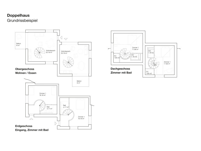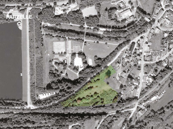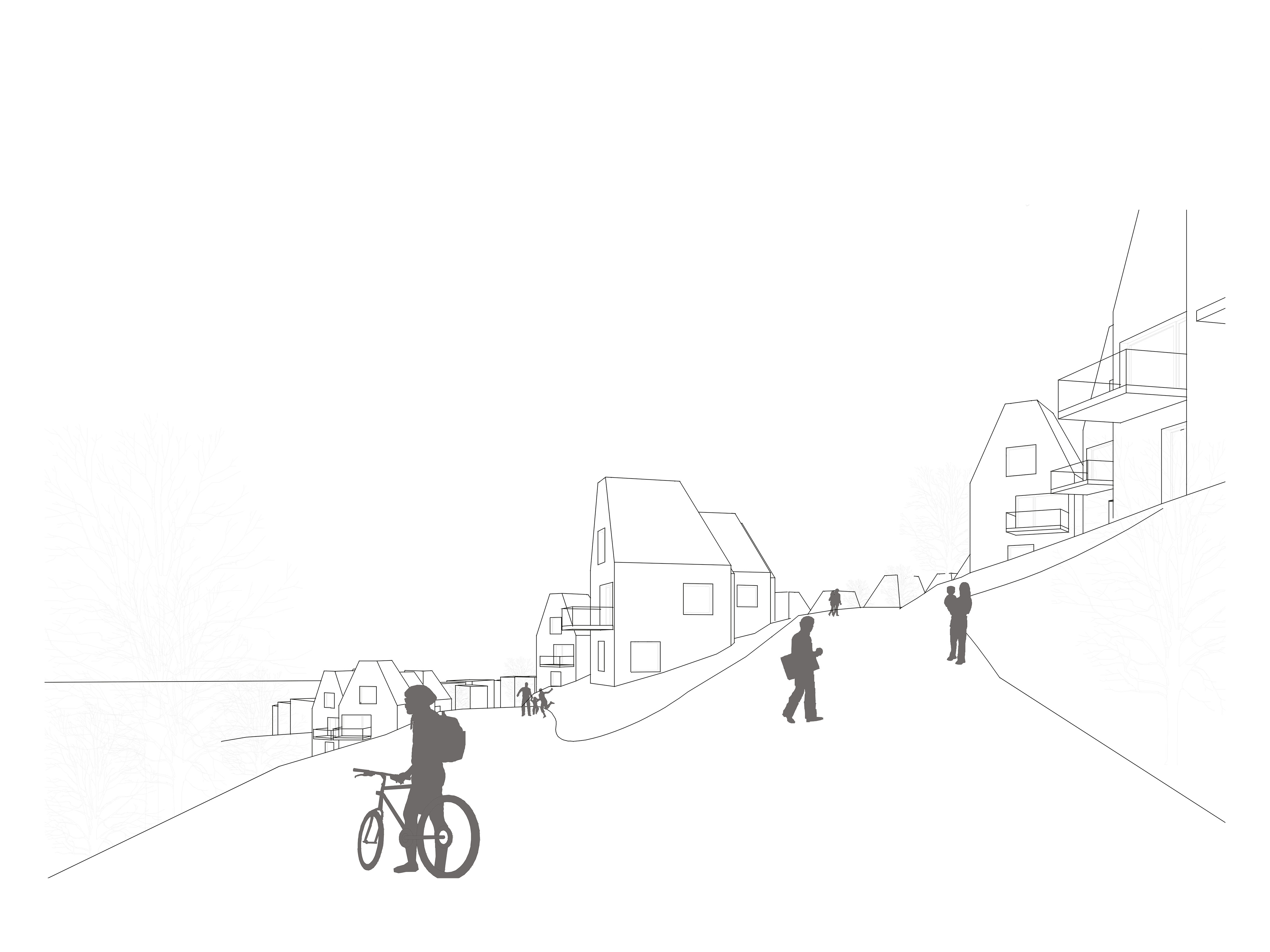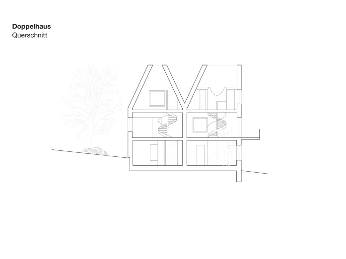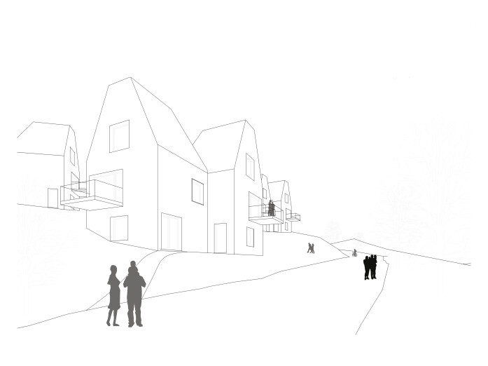 The settlement is based on a typology of semi-detached houses which adapt to the terrain. The living rooms and terraces are located on the upper floors and benefit from the view, while the ground floor has an entrance and a bedroom. In their volumetry, the houses refer to the existing building structure of the adjacent grown village.