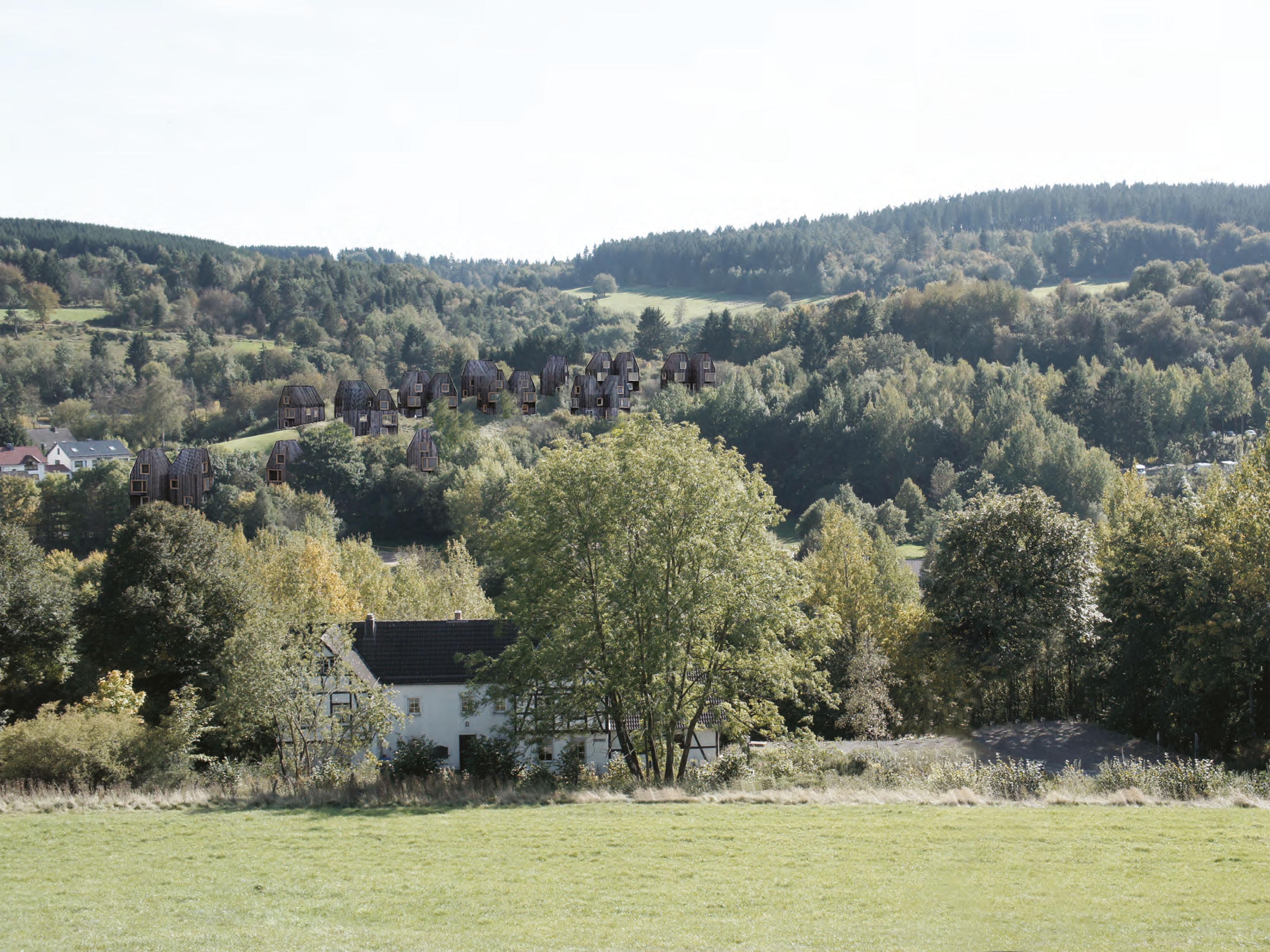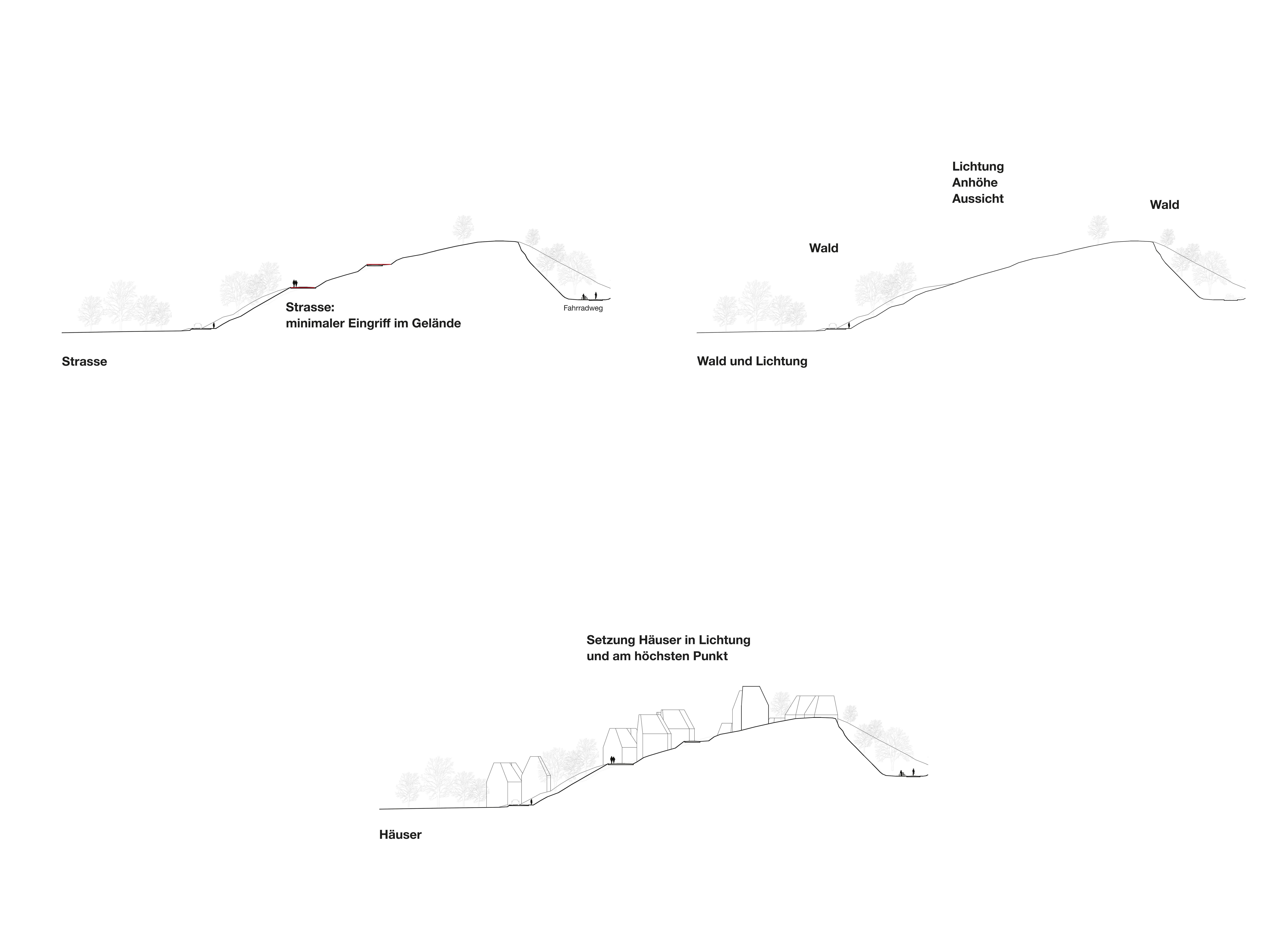 The 14 houses are set in a forrest clearing from where they receive the best possible view and maximum sunlight. The existing road in the north of the plot will be continued and will follow the edge of the terrain as a natural path up to the top of the hill. The intervention in the topography is carried out as minimal as possible.