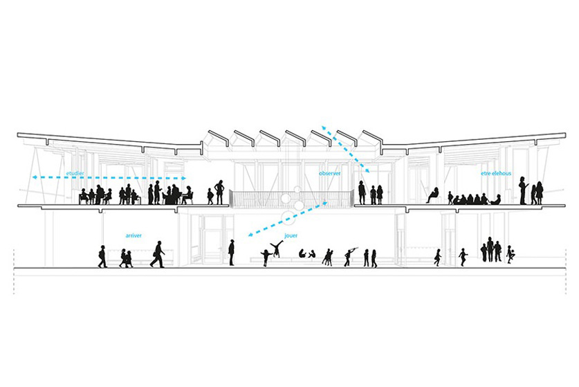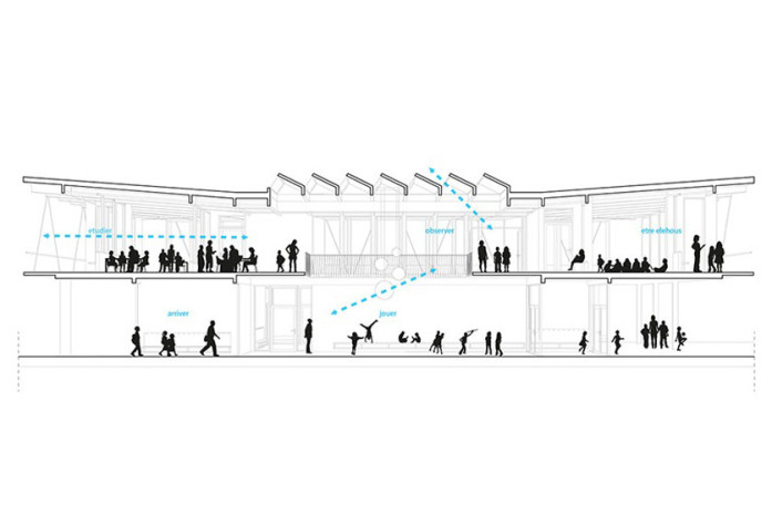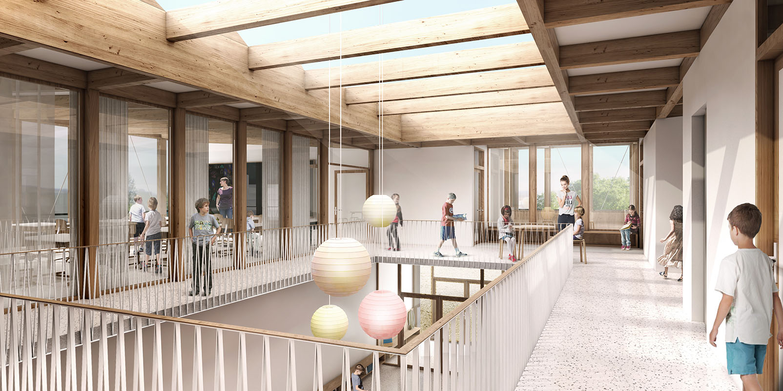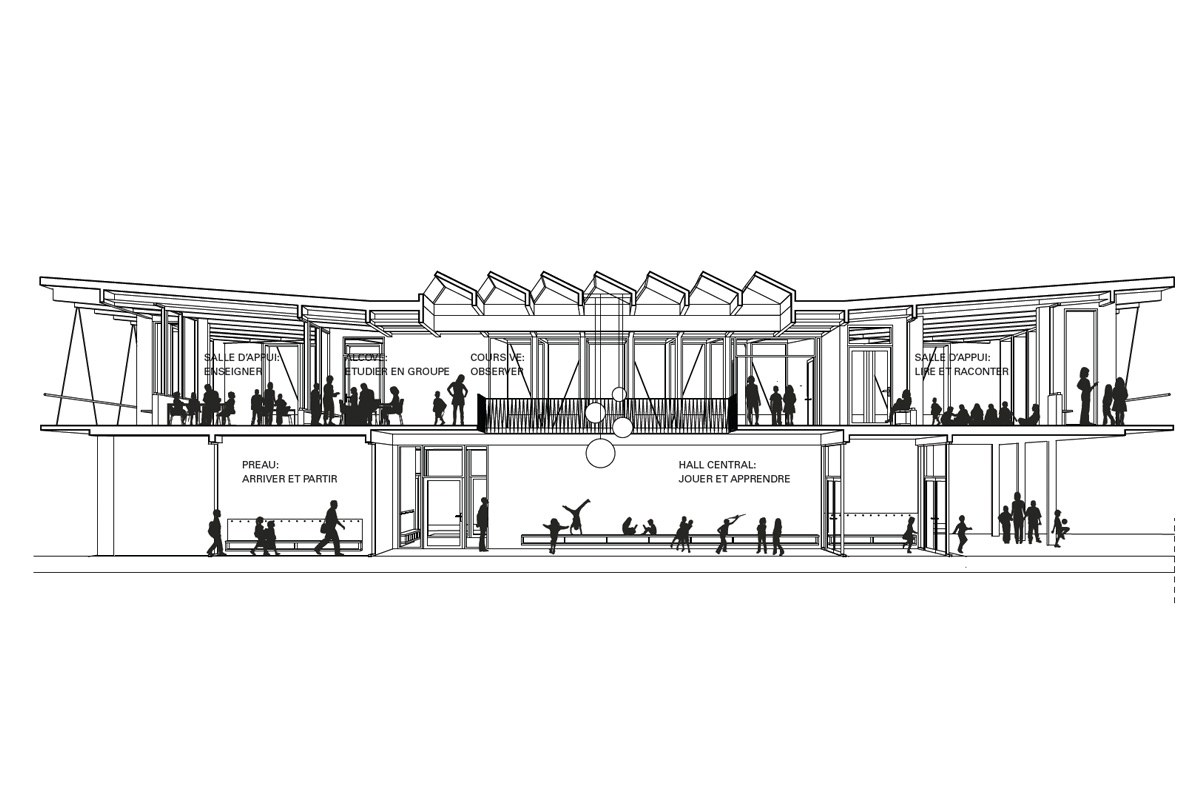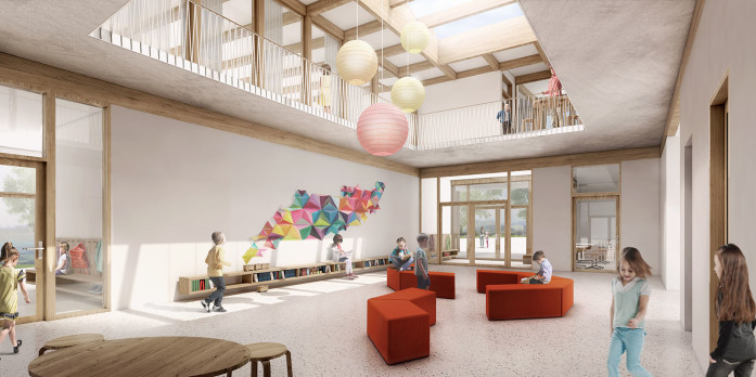Au centre de l’école se trouve le hall en double hauteur depuis lequel toutes les salles sont accessibles: les salles de classe enfantine et primaire, les salles ACT/ACM et l’appui extrascolaire. Ce hall est un élément de cohésion qui agit aussi comme une salle de classe informelle et supplémentaire.