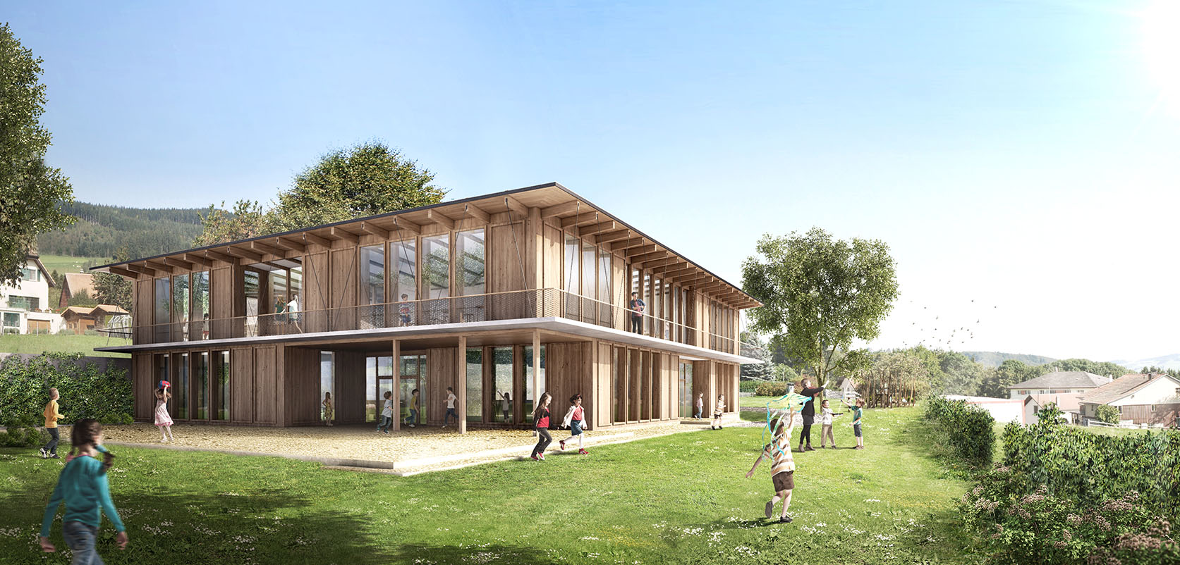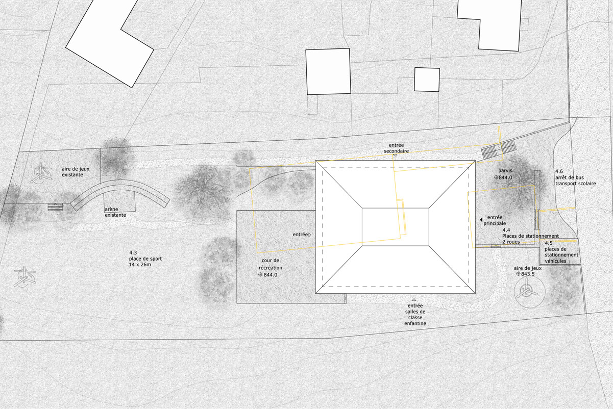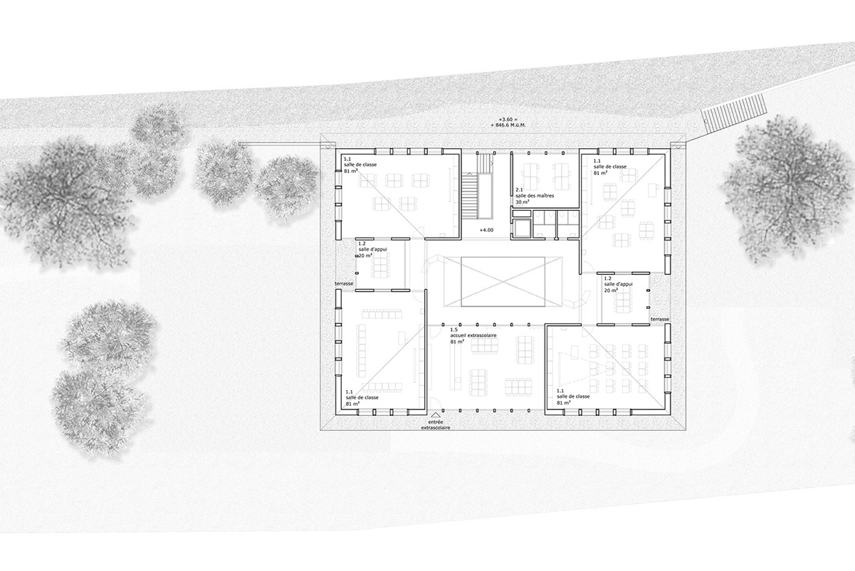 Alors que le rez-de-chaussée est ouvert sur l’extérieur et donc perméable, le hall est efficacement relié à l’entrée principale au nord ainsi qu’au préau couvert au sud. Au rez-de-chaussée, se trouvent les salles d’activités créatrices sur textiles et les salles d’activités créatrices manuelles. Les deux salles de classe enfantine sont orientées vers la vallée et ont leur propre entrée à l’est. Grâce à leur connexion avec le hall central, il leur est possible à tout moment de participer aux évènements de l’école.