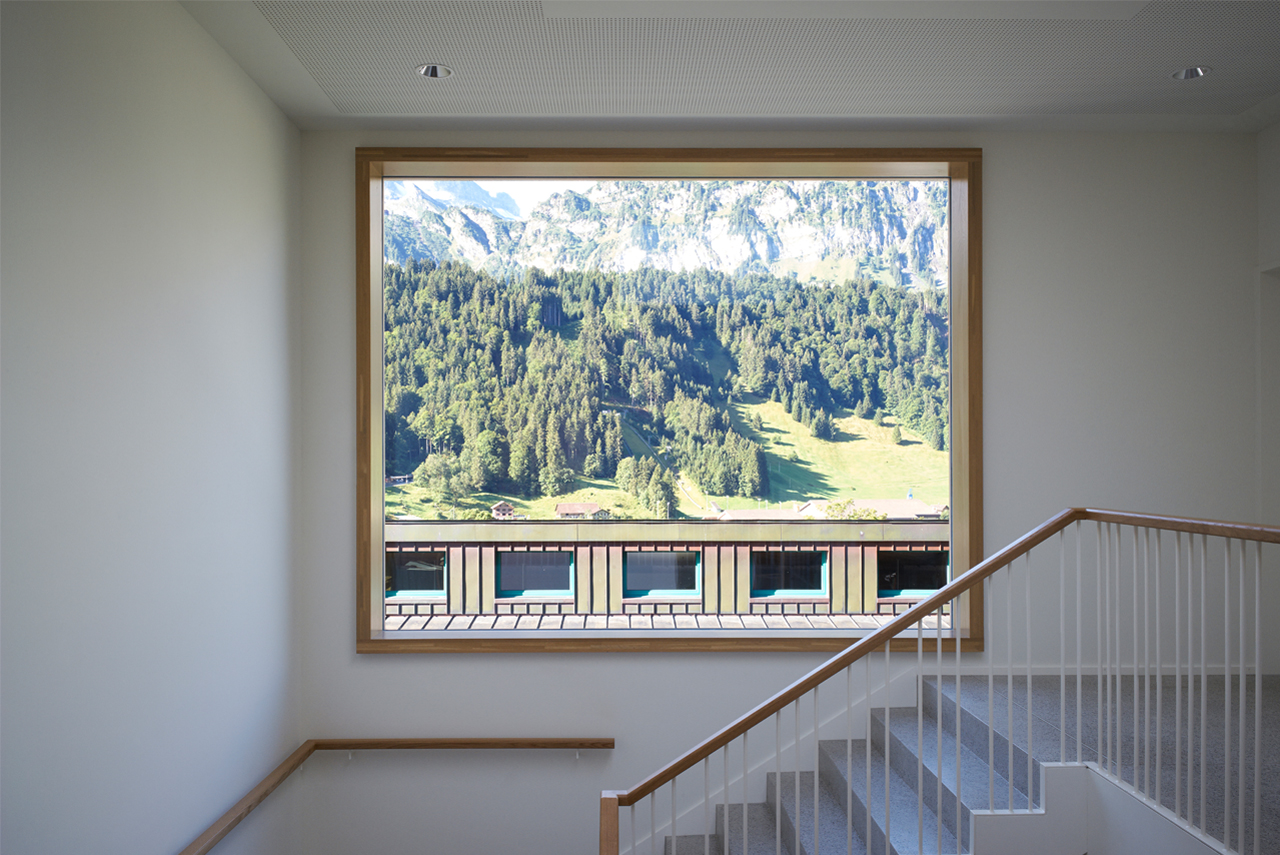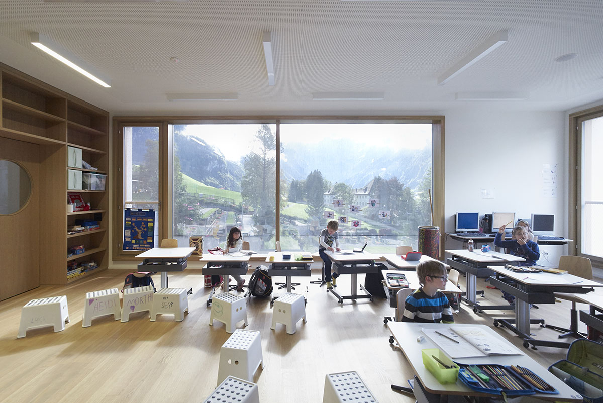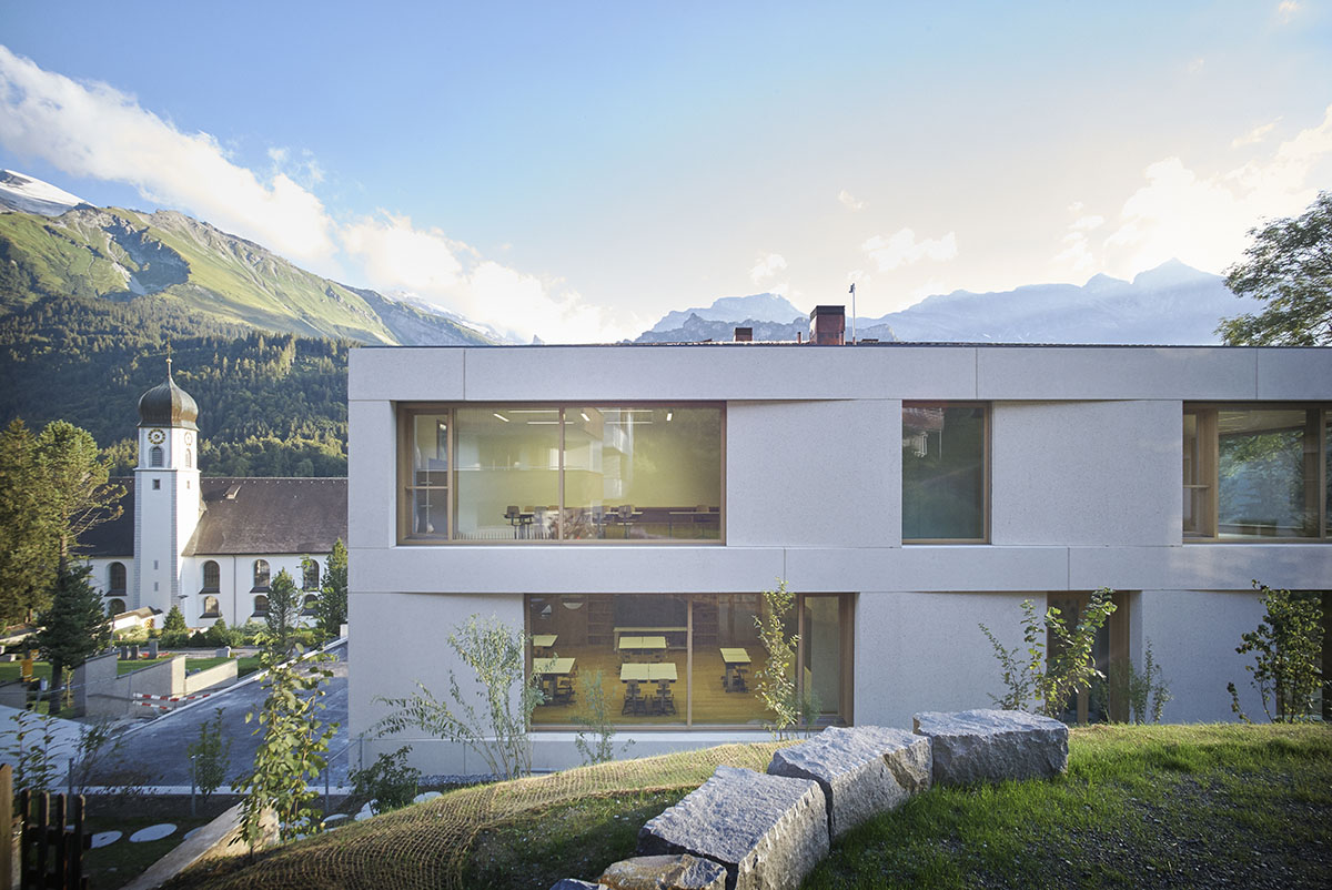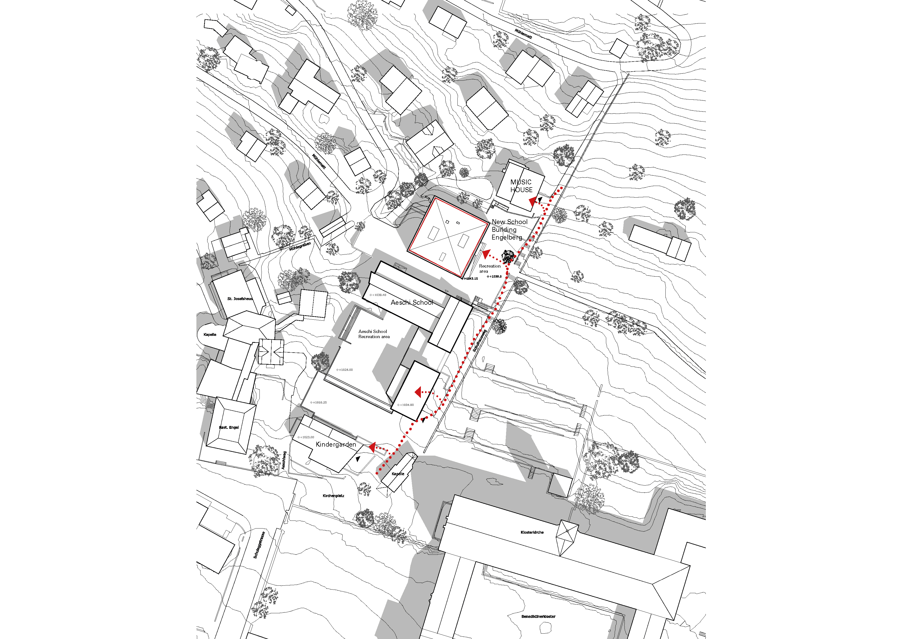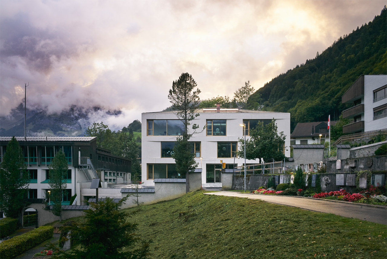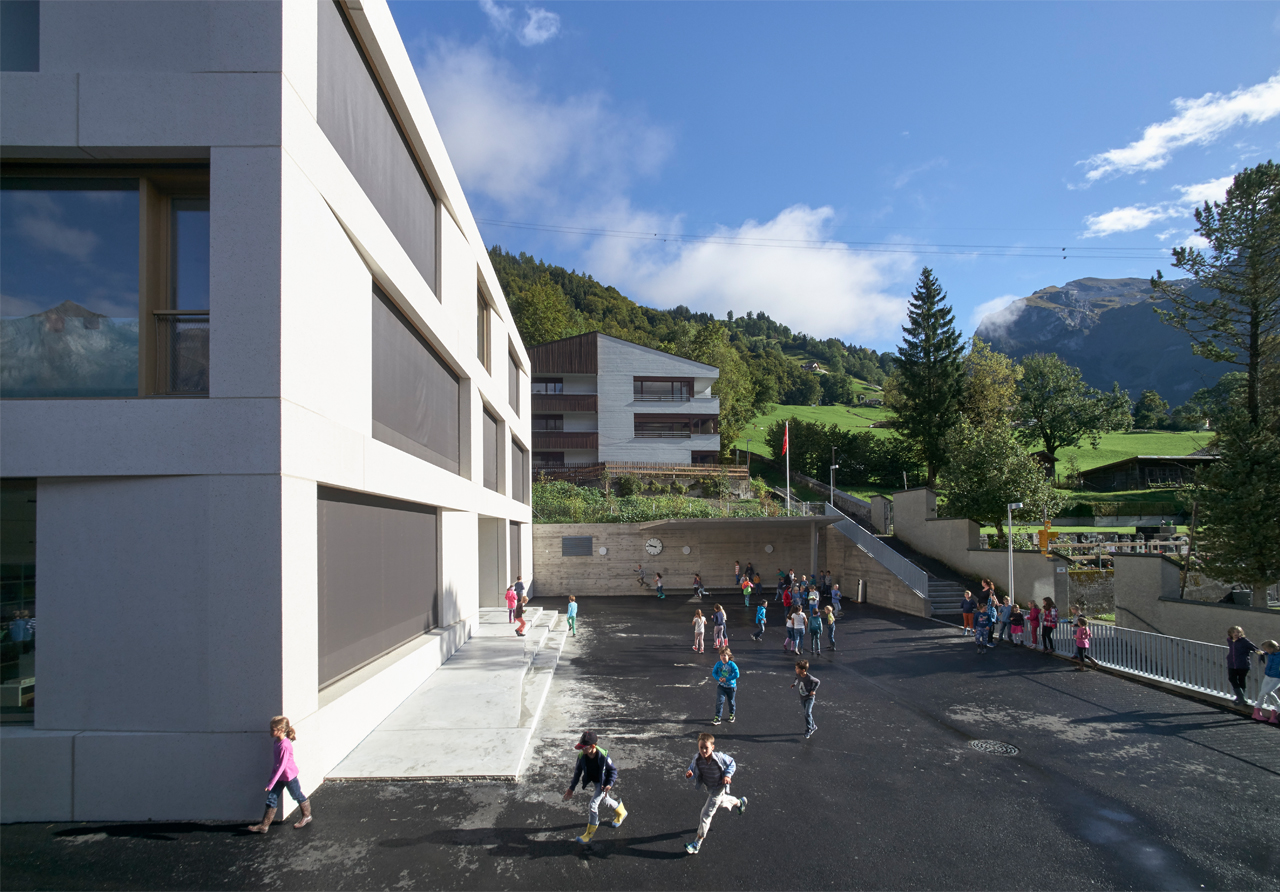 Situated in the Alpine region of central Switzerland, the new school of Engelberg overlooks a dramatic mountain range, an austere baroque monastery, groomed grazing meadows and the small village of Engelberg. The school establishes a dual dialogue: with its existing idyllic context on one hand, and with an adjacent Brutalist school building (completed in 1967 by architect Ernst Gisel) on the other. This exchange between the existing and the new is carried out through the building’s physical volume, material use, and the specific intervention in its mountainous site. By extending the ascending ‘rue intérieure’ and the sequence of terraced playgrounds, a coherent relationship to the existing school campus is strengthened.