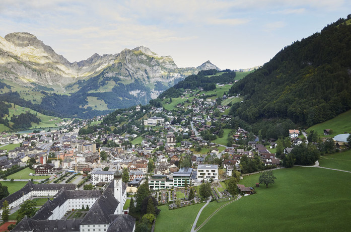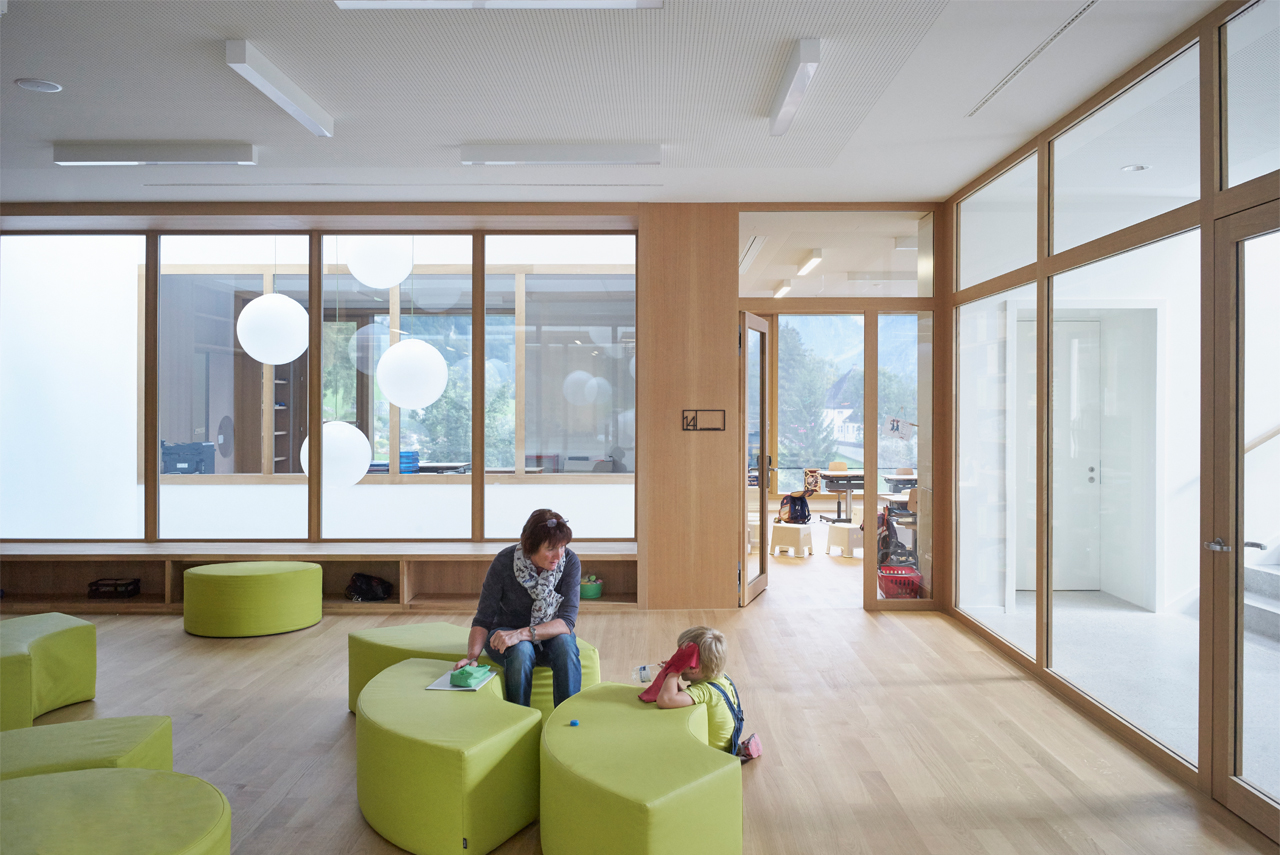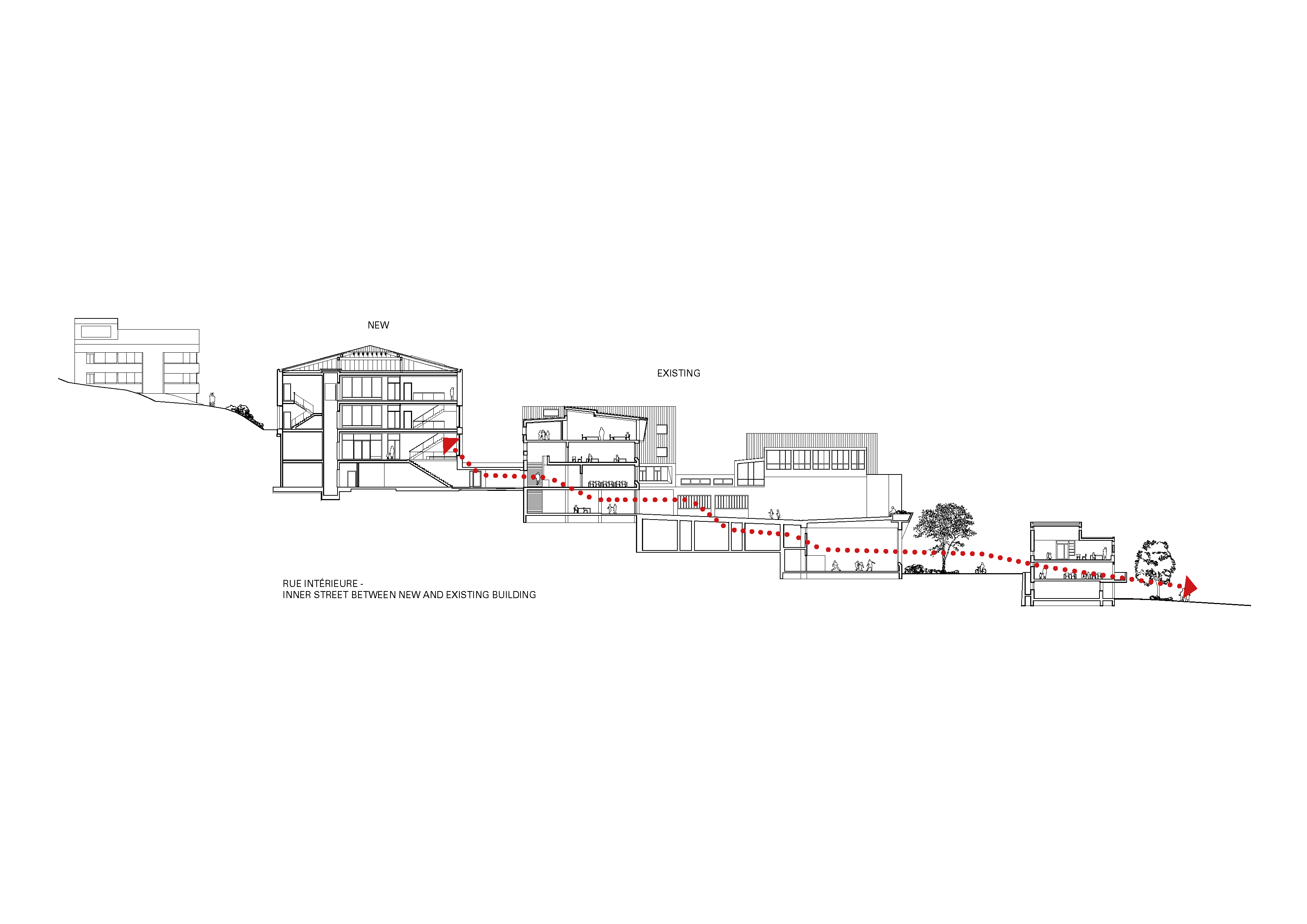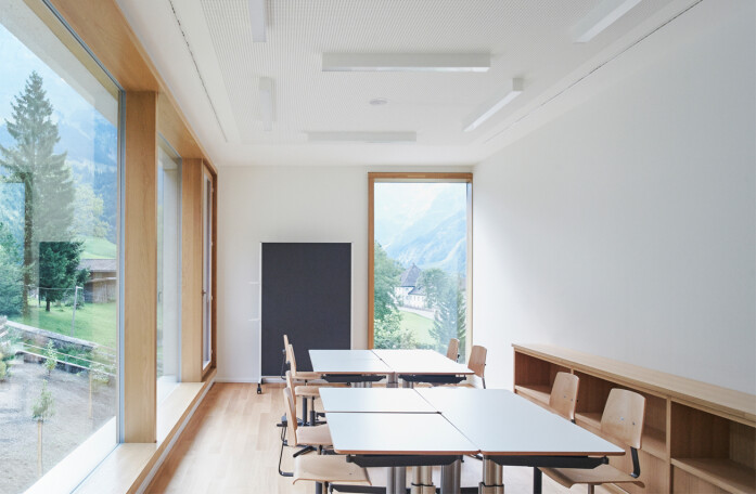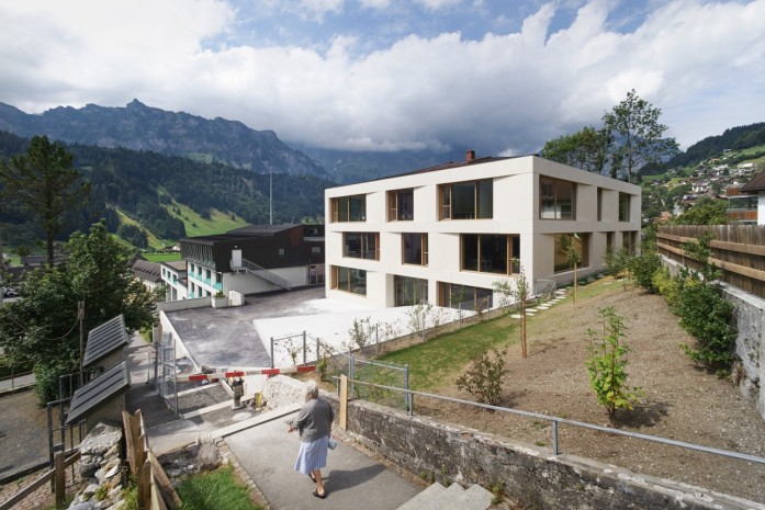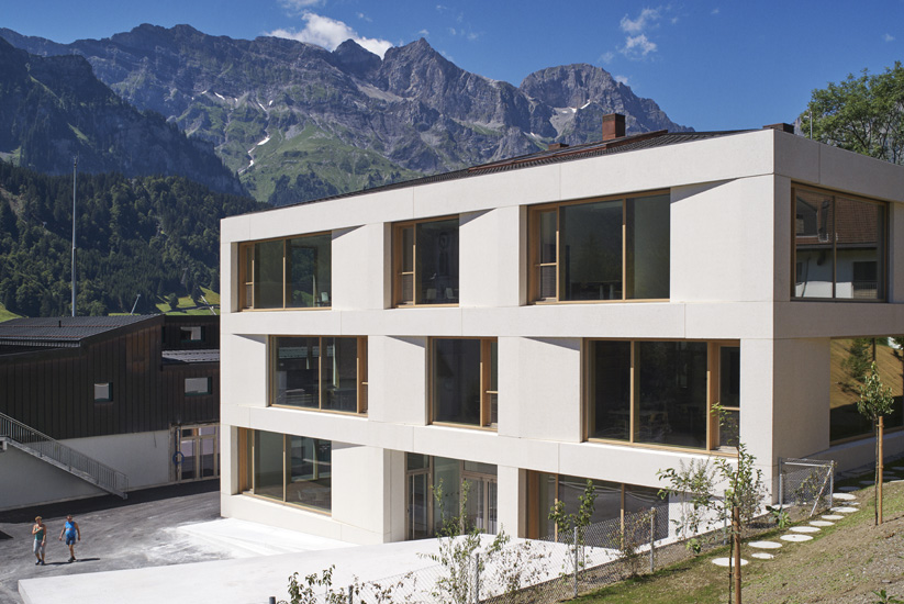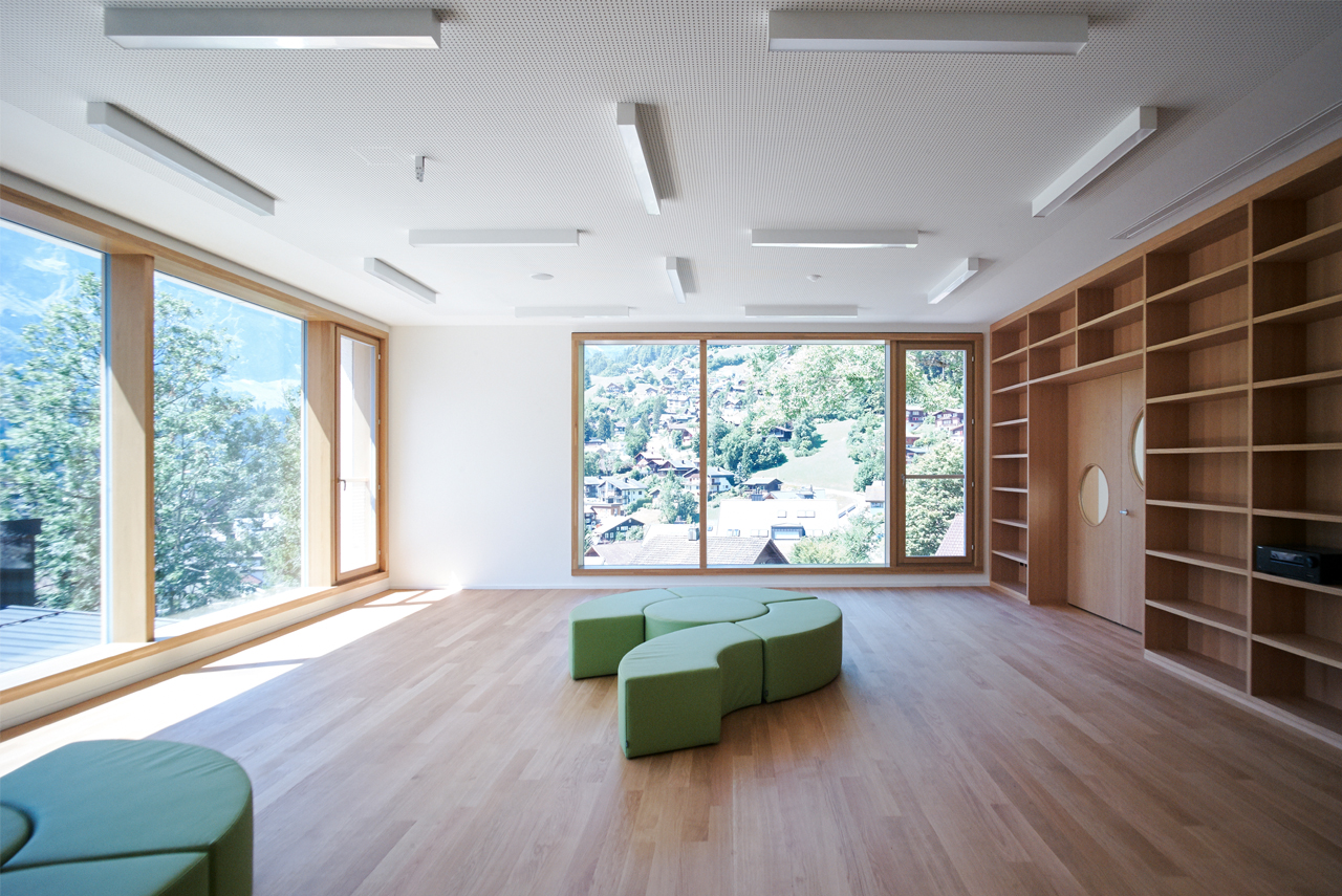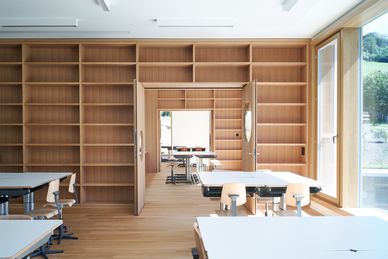 Situated in the Alpine region of central Switzerland, the new school of Engelberg overlooks a dramatic mountain range, an austere baroque monastery, groomed grazing meadows and the small village of Engelberg. The school establishes a dual dialogue: with its existing idyllic context on one hand, and with an adjacent Brutalist school building (completed in 1967 by architect Ernst Gisel) on the other. This exchange between the existing and the new is carried out through the building’s physical volume, material use, and the specific intervention in its mountainous site. By extending the ascending ‘rue intérieure’ and the sequence of terraced playgrounds, a coherent relationship to the existing school campus is strengthened.