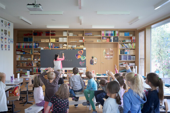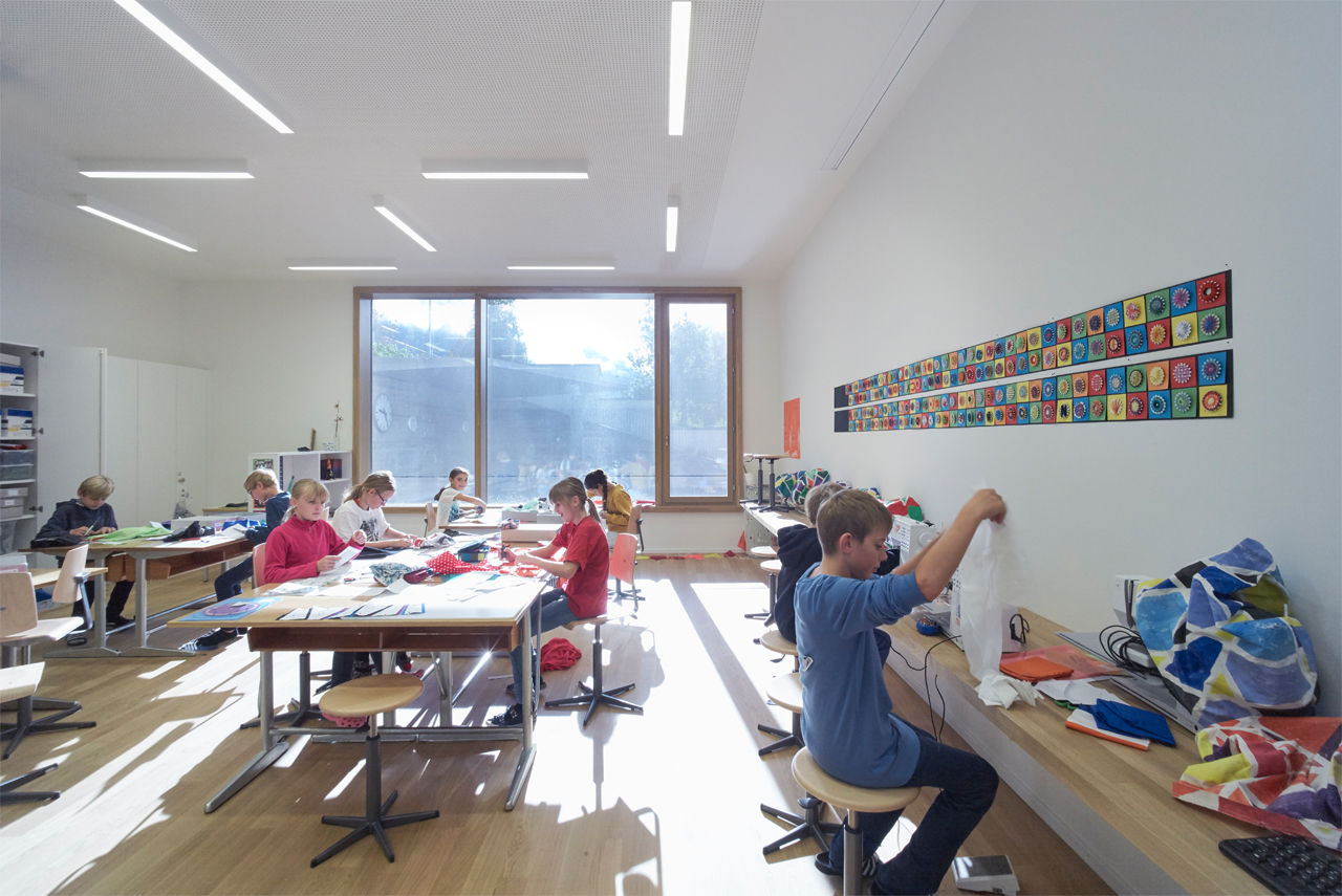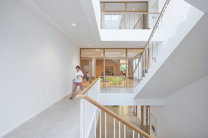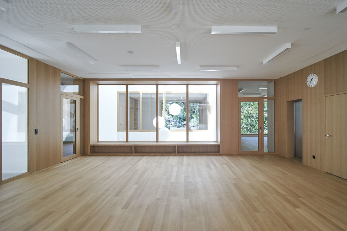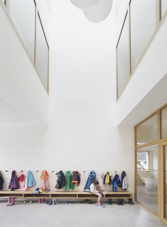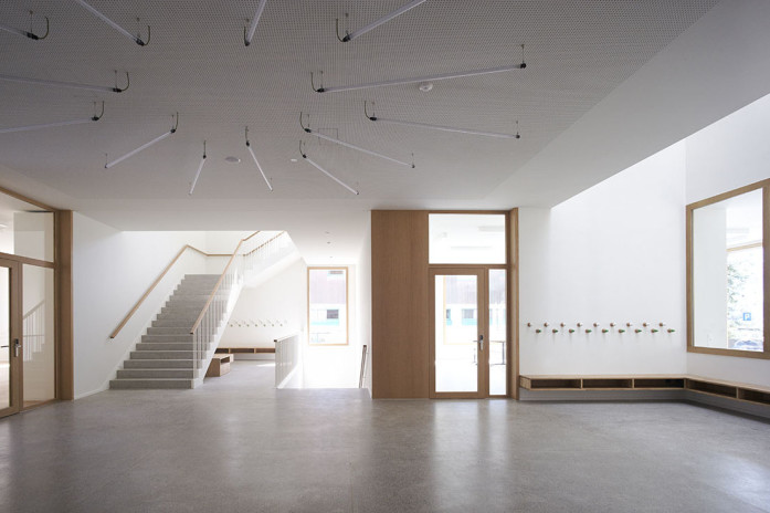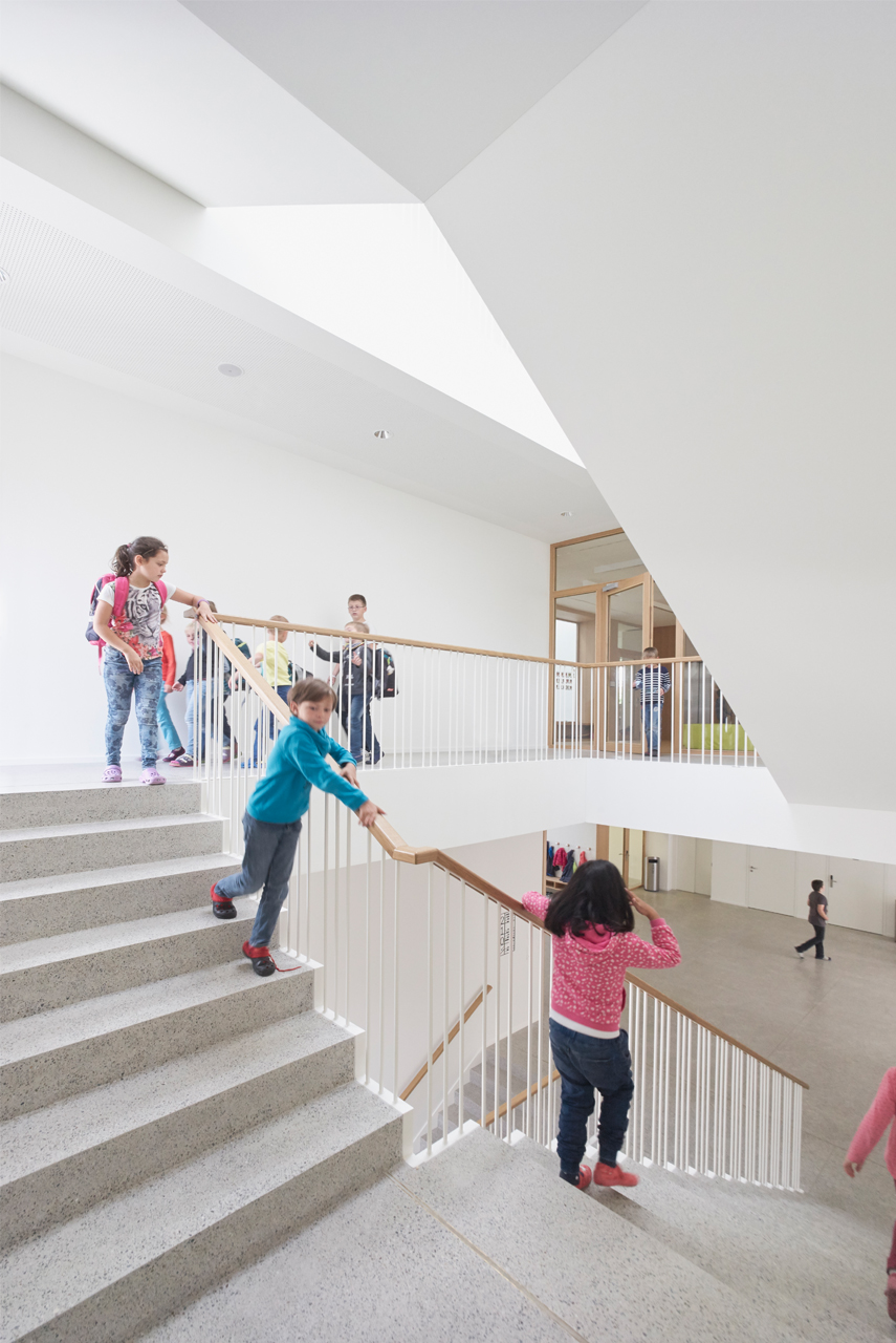 The school is defined by a lucid and consistent spatial organization: four equally sized classrooms are organized around a flexible common room in a pin-wheel manner, resulting in a square footprint on each level. Two light-wells bring daylight into the center of the building while also connecting the levels vertically and allowing for cross-views throughout the entire building. These visual connections encourage social camaraderie and communicative exchange between teachers and students. In addition, small flexible group-rooms connecting the classrooms enable different learning configurations, from individual tutoring to collective cross-class teaching. This innovative floor plan typology is a response to the latest pedagogical demands for versatile teaching spaces. This project addresses the current discourse of architecture of schools and visions of education changing over the course of time.
