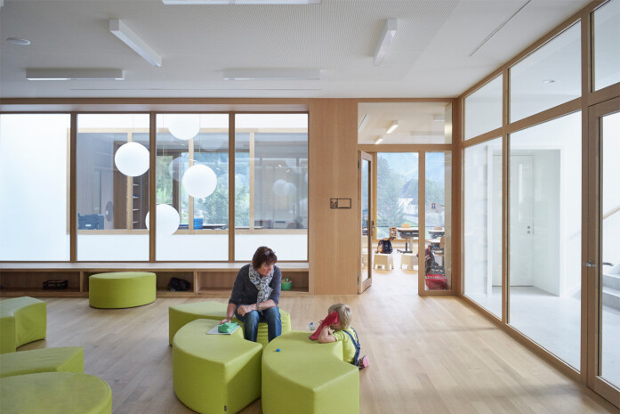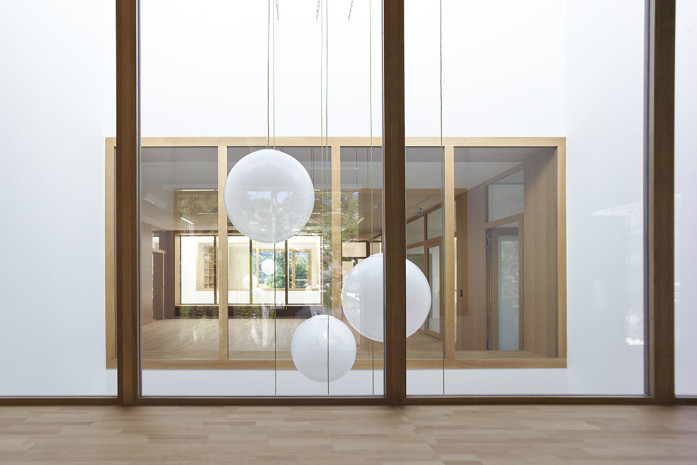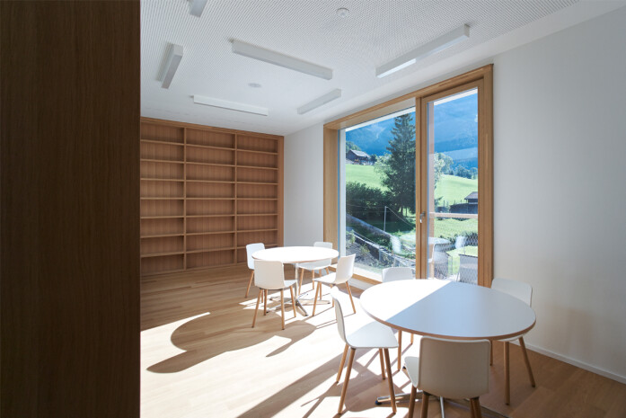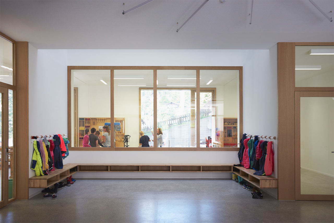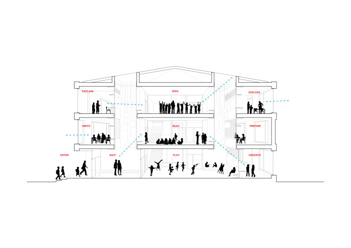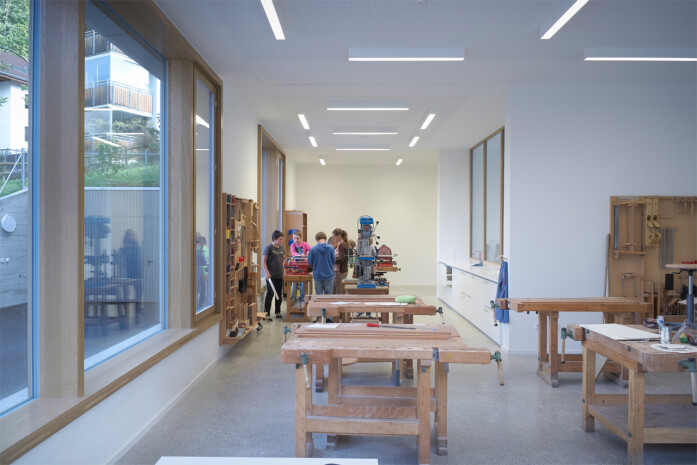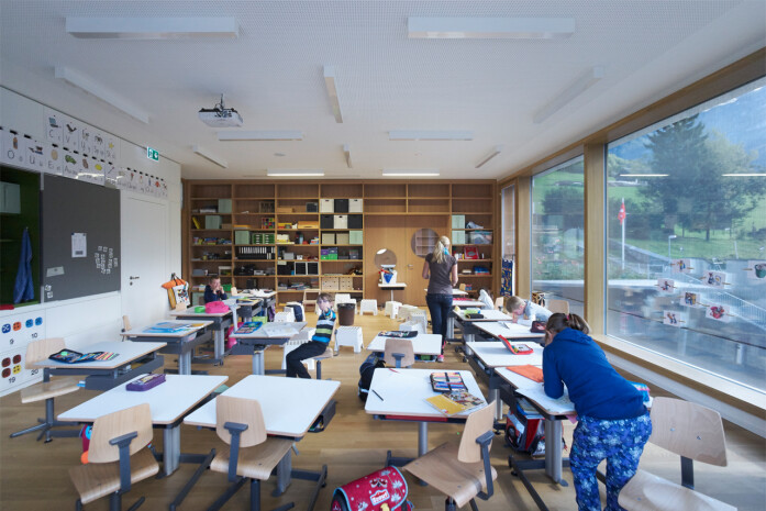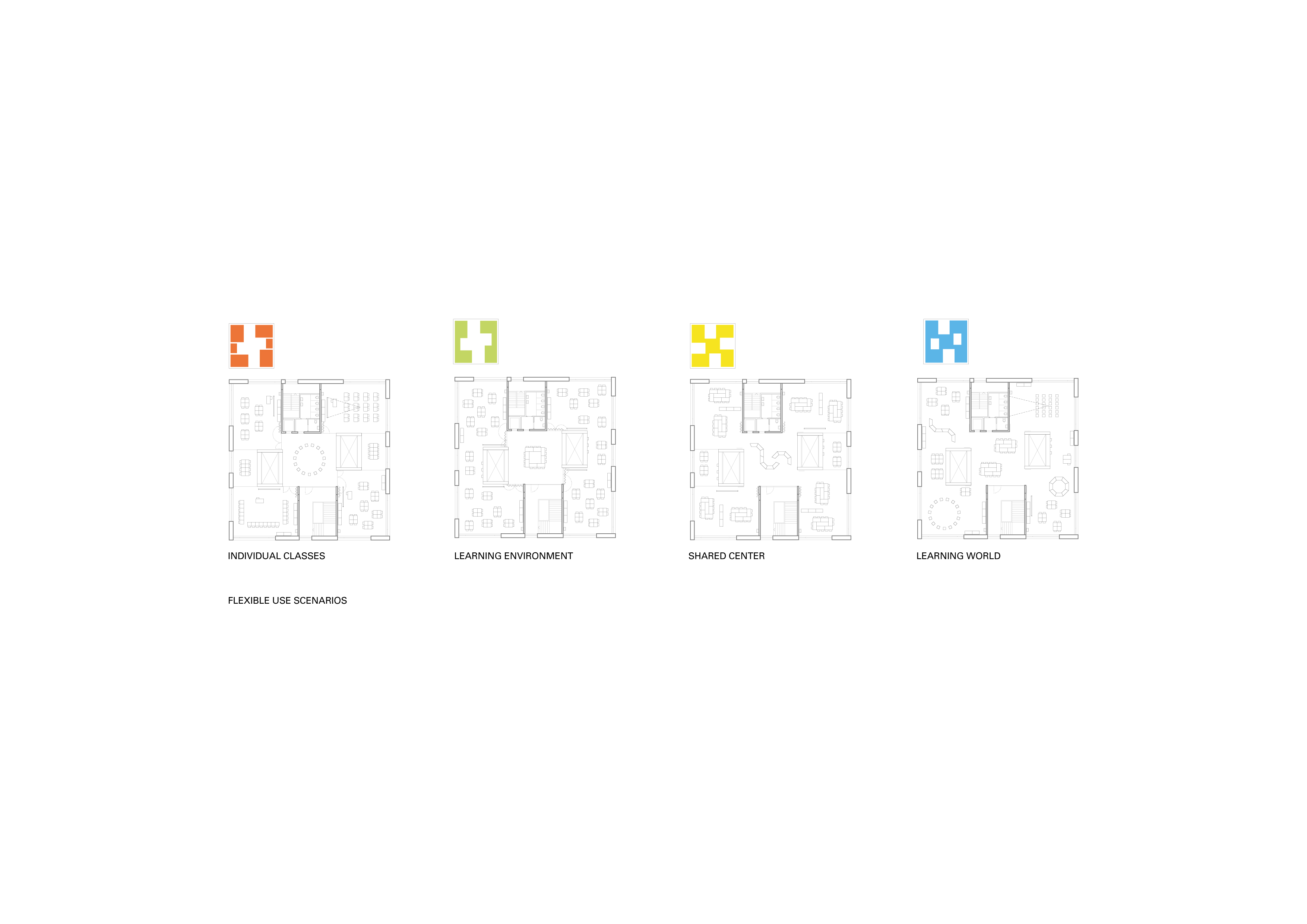 The school is defined by a lucid and consistent spatial organization: four equally sized classrooms are organized around a flexible common room in a pin-wheel manner, resulting in a square footprint on each level. Two light-wells bring daylight into the center of the building while also connecting the levels vertically and allowing for cross-views throughout the entire building. These visual connections encourage social camaraderie and communicative exchange between teachers and students. In addition, small flexible group-rooms connecting the classrooms enable different learning configurations, from individual tutoring to collective cross-class teaching. This innovative floor plan typology is a response to the latest pedagogical demands for versatile teaching spaces. This project addresses the current discourse of architecture of schools and visions of education changing over the course of time.