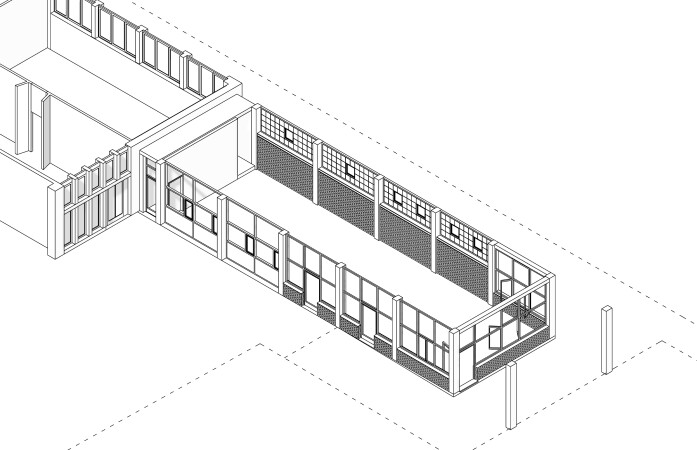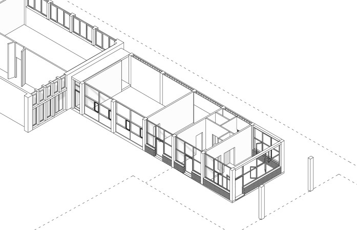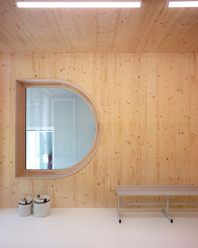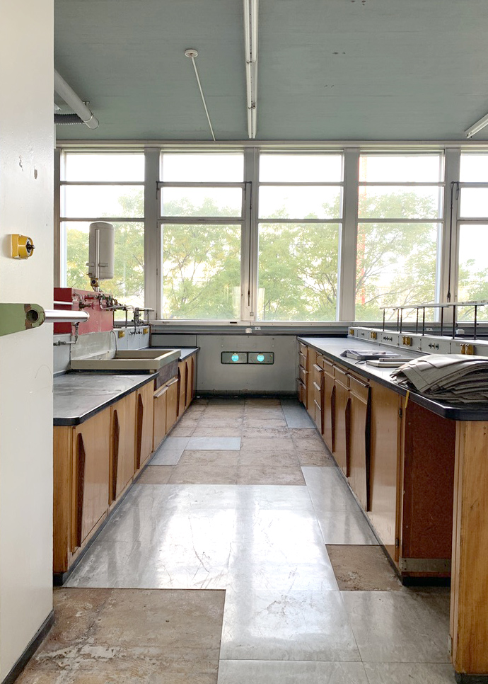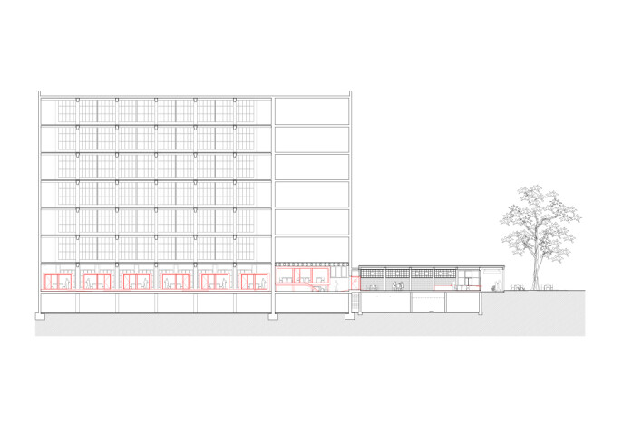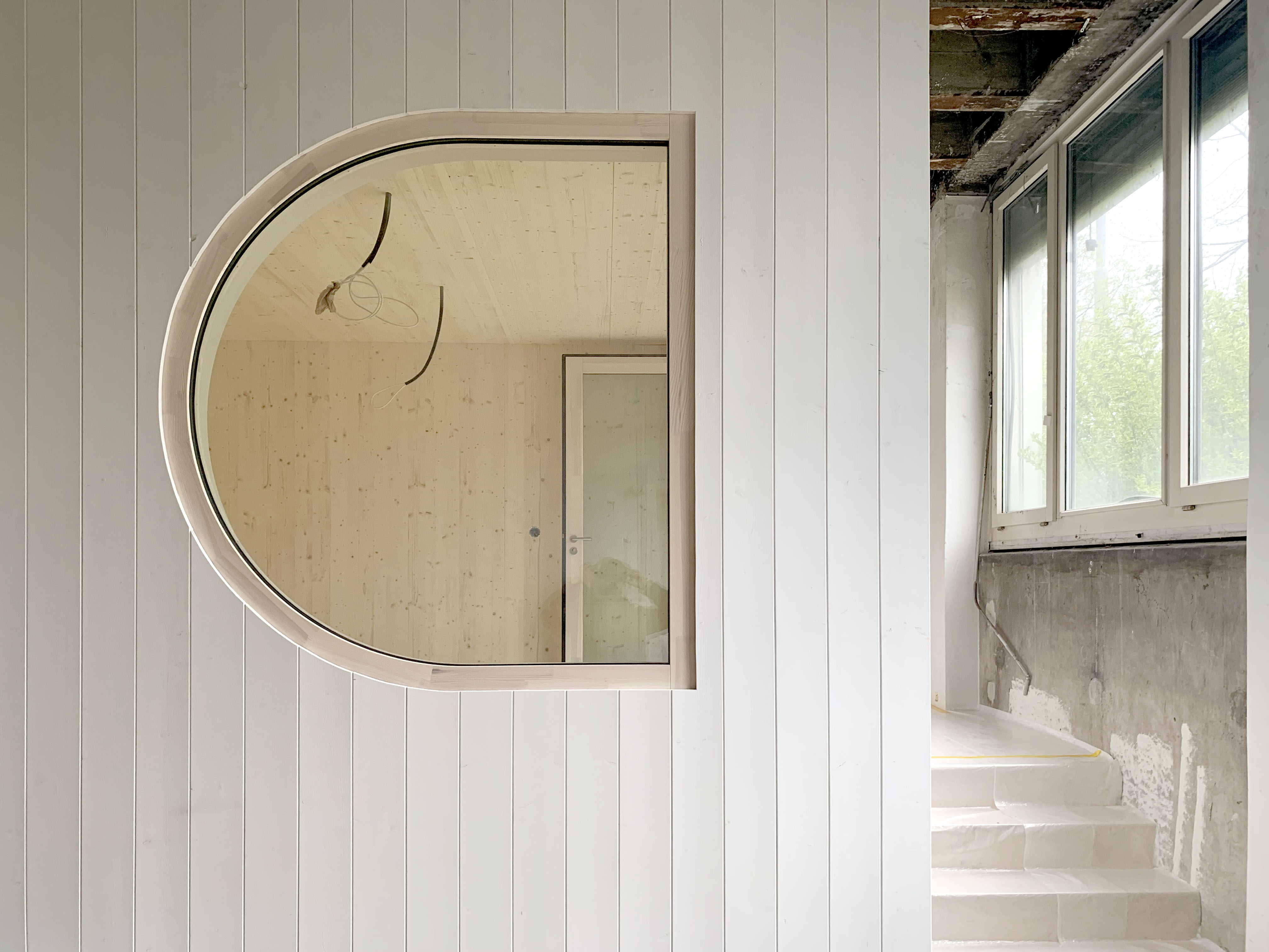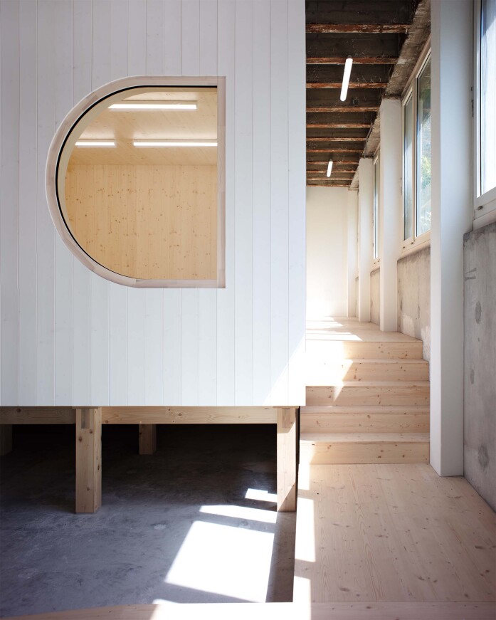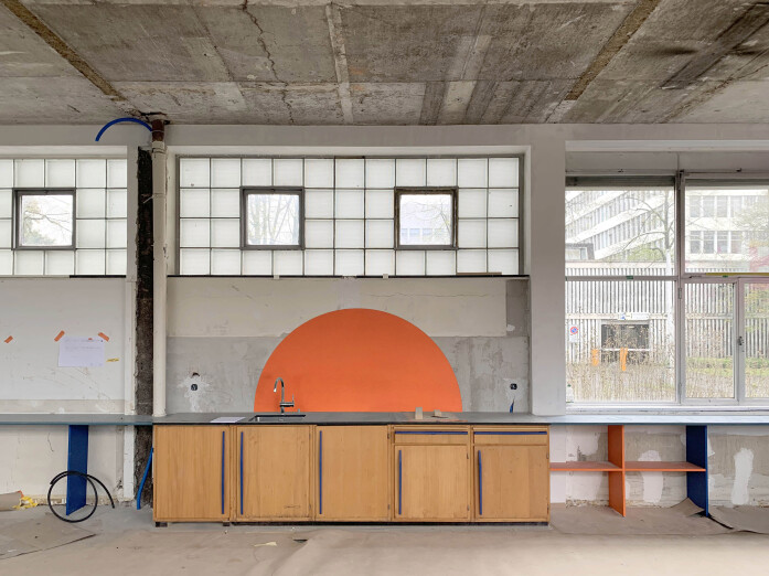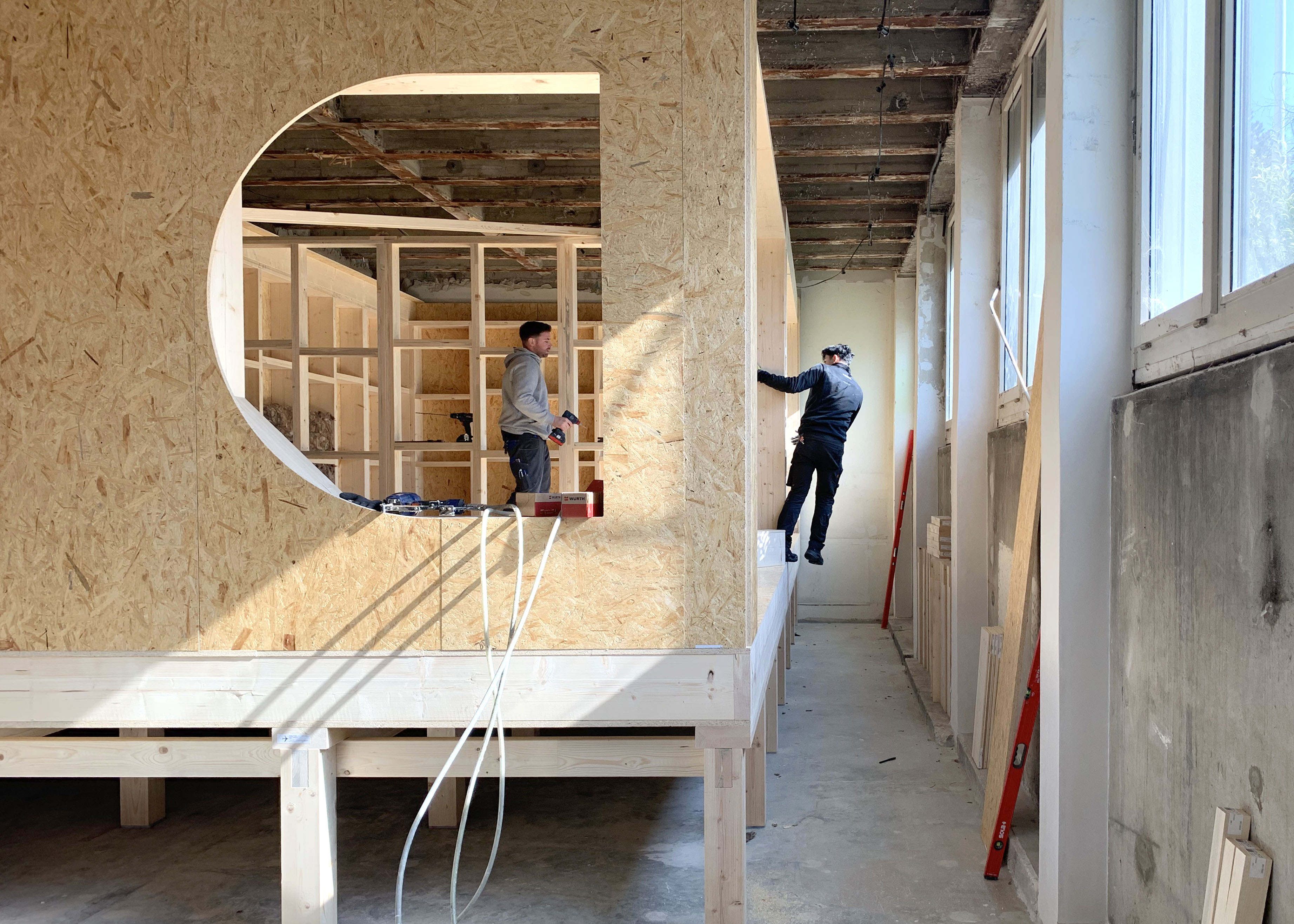 The Porte-31 is designed with minimal interventions and realized by re-using and recycling materials from some of the former pharmaceutical laboratories on site.