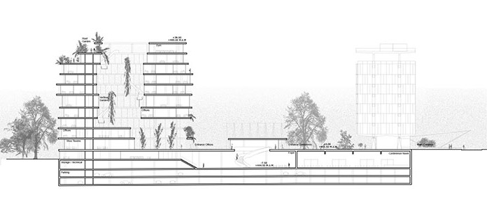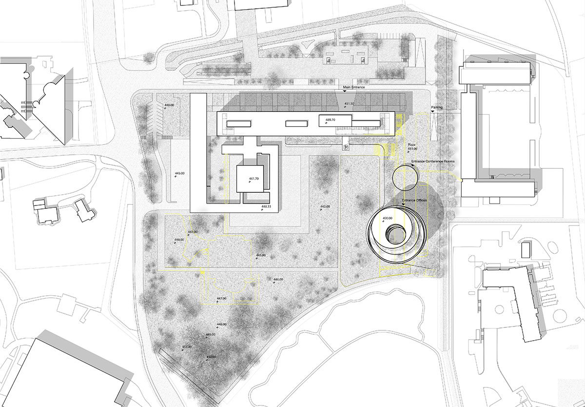 The intricate and specific context and the presence of an ‘architectural masterpiece’ generated the essence of the proposed extension to the WHO headquarters. The urban approach of this extension envisages a harmoniously conceived new building with yet a persuasive presence next to its heritage counterpart. The New Building strives to preserve the uninterrupted view of the existing Main Building through its distance and its minimal footprint. The intervention strategy of the project is based on two central ideas; the horizontal connector and the vertical extension: the first being a horizontal base, which is modestly embedded in the eastern edge of the site and is completely permeable to the garden and park. This connector does not only accommodate the public spaces and “smooth functioning” of the program, such as the conference spaces, multi-purpose areas, and the restaurant, but it also acts as the mediator and connexion between the main and the new building, the street and the park. Internally, it connects to the existing building through the new restaurant, which is inserted into the lower ground level of the main building. The reprogramming of the space revives this forgotten strip of the building and transforms it to a porous space towards the garden. The southern end of the connector links the offices and the SHOC areas to the second central idea of the proposal conceived as a vertical compact building with its small footprint, panoramic circular floors interconnected through an open courtyard and multiple terraces. The new extension aims to proudly create a coherent dialogue with the valuable past and the contemporary growing needs of the WHO. This attitude has the idea of maximizing the ‘unbuilt’ through minimizing the ‘built’ form at its heart.