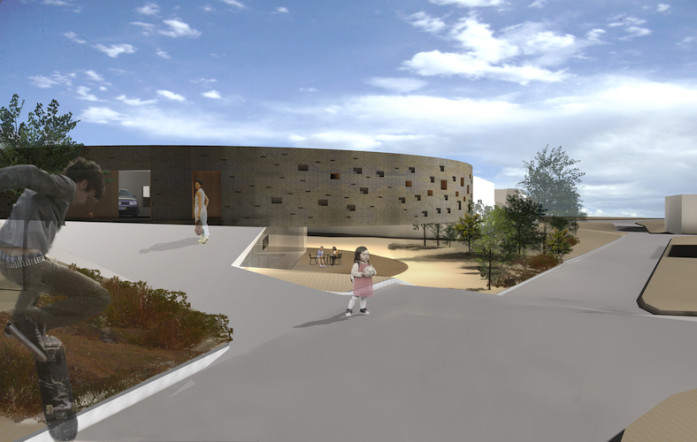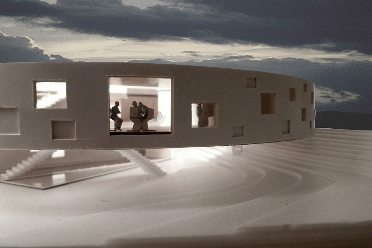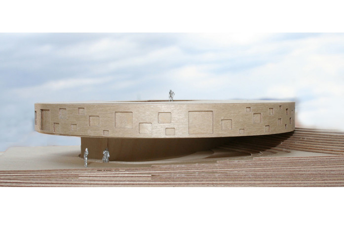 The building takes on the form of a circular disc as a primary response to the climate conditions, the northwest winds and the east south light. Like a sun clock, its diverse fenestration playfully relates to the living program and the sun light usage. As a result, the spaces are organized gradually and radially with different degrees of opacity and transparency along the exterior edge.