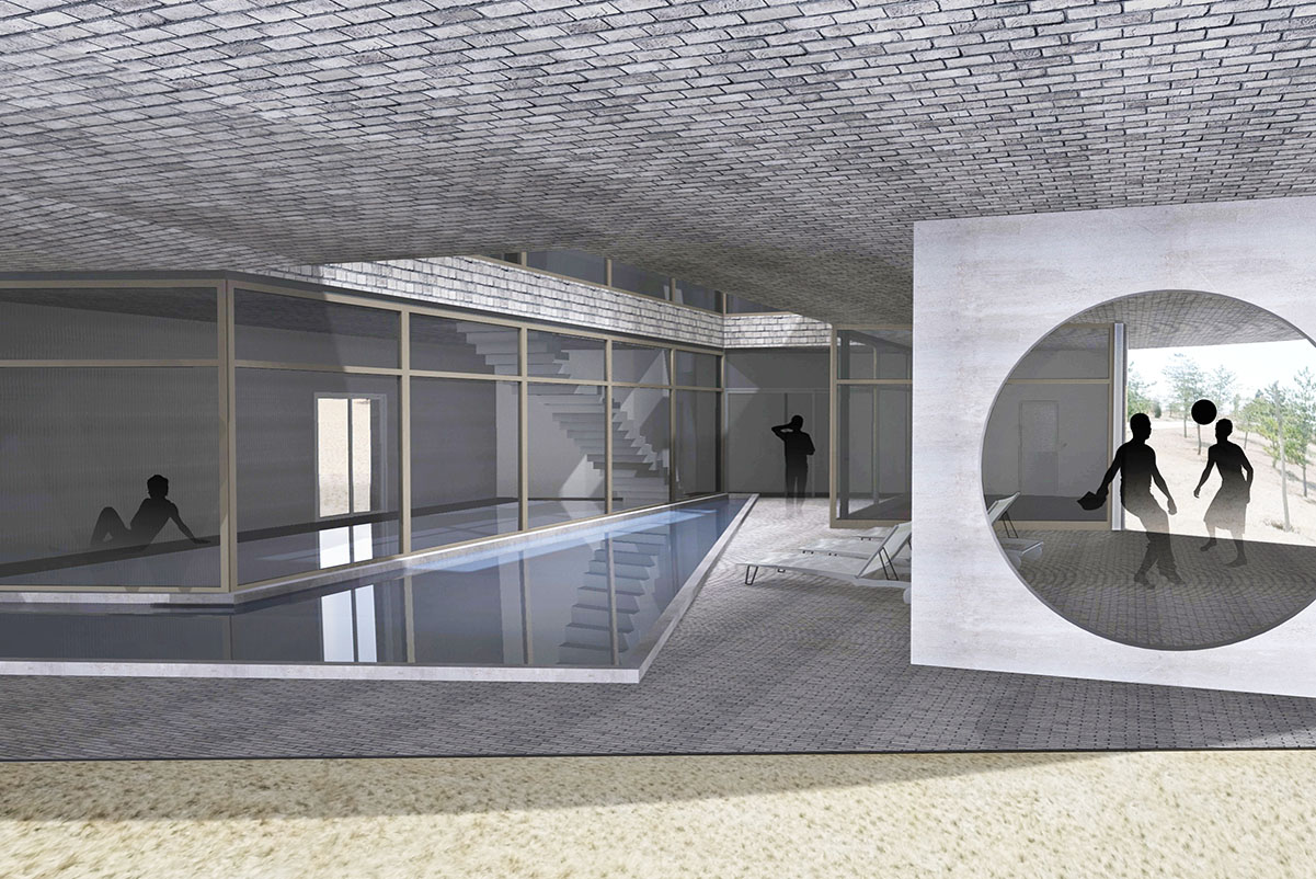 The circular plan, being efficient due to minimal circulation corridors, generates an intimate spatial experience through a sequence of interrelated spaces and cross views. A north south axis defines two open court yards and creates spatial complexity. The hovering villa touches the ground only selectively to accommodate an indoor and outdoor pool with auxiliary spaces.