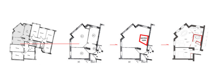 The five storey building marks the corner of a turn of the century city block. Close to the train station and in the disappearing red-light district neighbourhood, this block finds itself in a city area that is being revitalized and gentrified. The recovery concept for these apartments – as a reaction to their existing compartmentalized spaces - is to create openness through efficient minimal interventions. Openness was achieved through removing walls and inserting service cores to collect installations in one concentrated space.