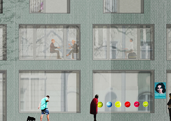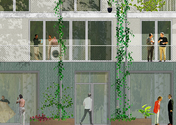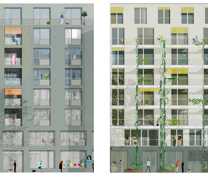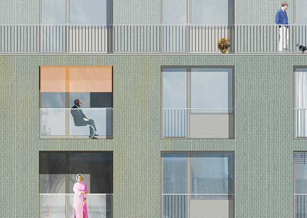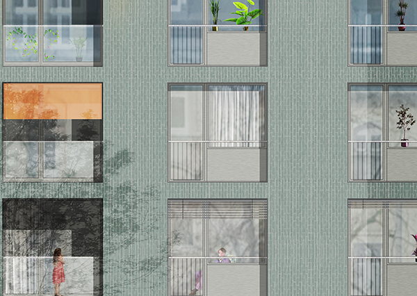 project: mixed-use in the city: 100 apartments consisting of social, regular and large shared apartments, 80 student studios, offices, co-working spaces, shops, atelier studios, restaurants and a day care school, Invited competition with prequalification, 2016