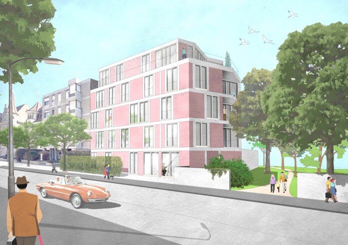 The residential building has an urban character and a natural presence. The new building forms a clear end of the row of houses to the park. The façade is structured by loggias and terraces. Following the historical buildings of the neighbourhood, the materialisation and design is proposed in mineral form. The banding of the façade gives the building a delicate structure.