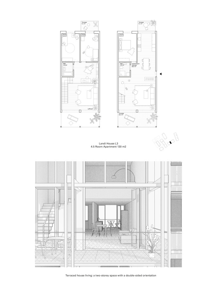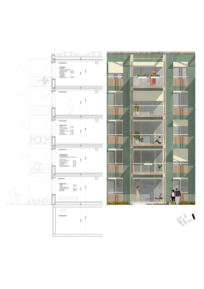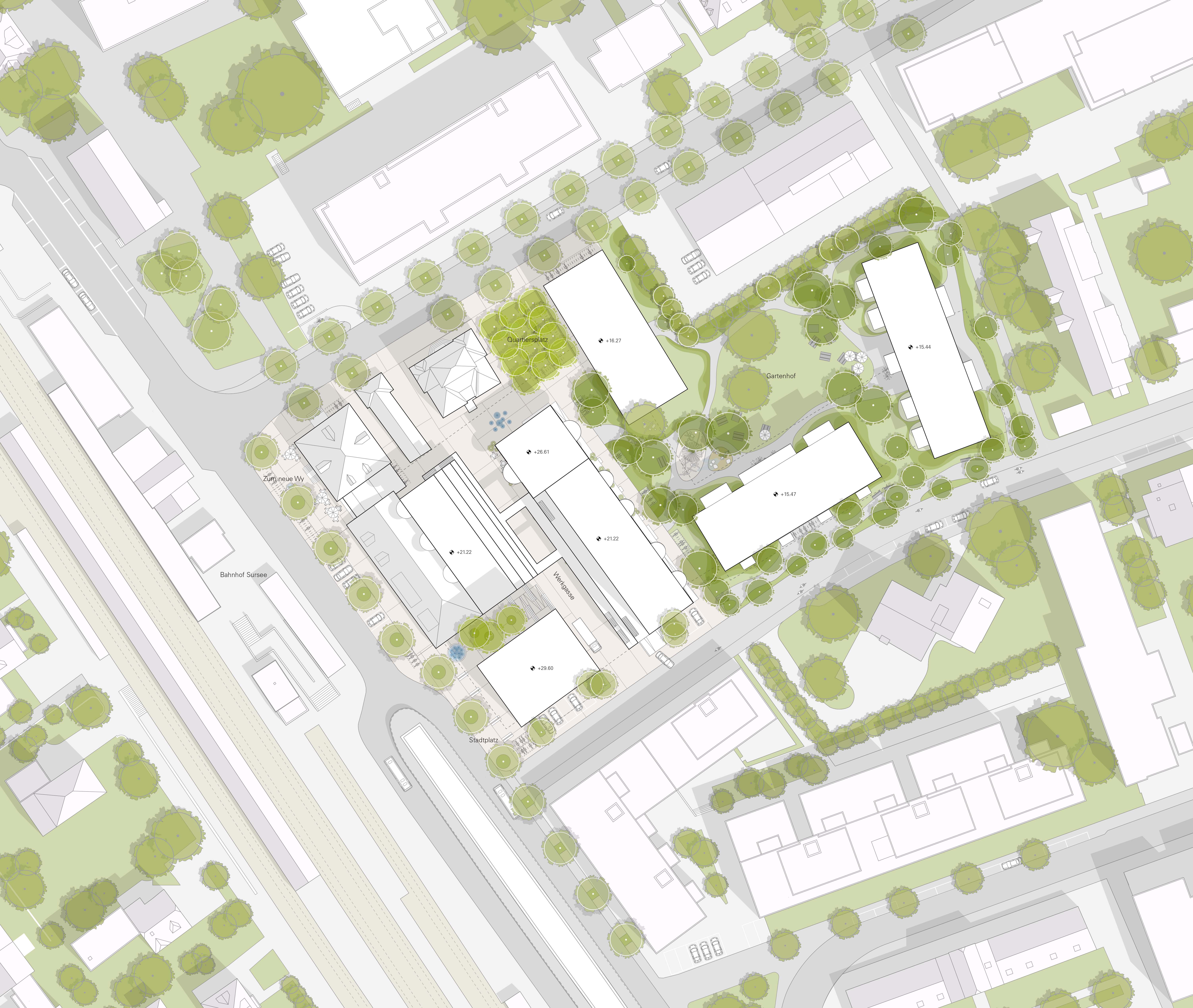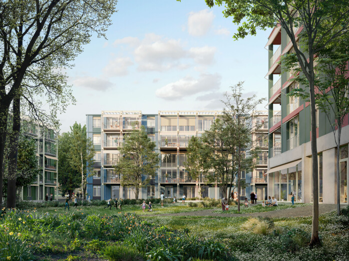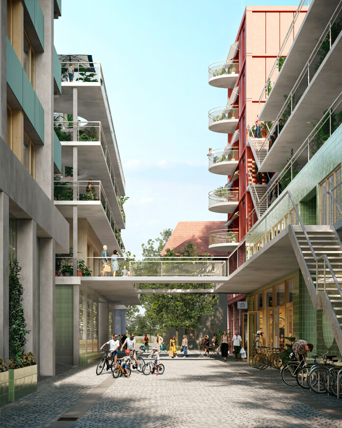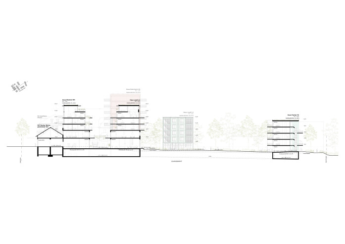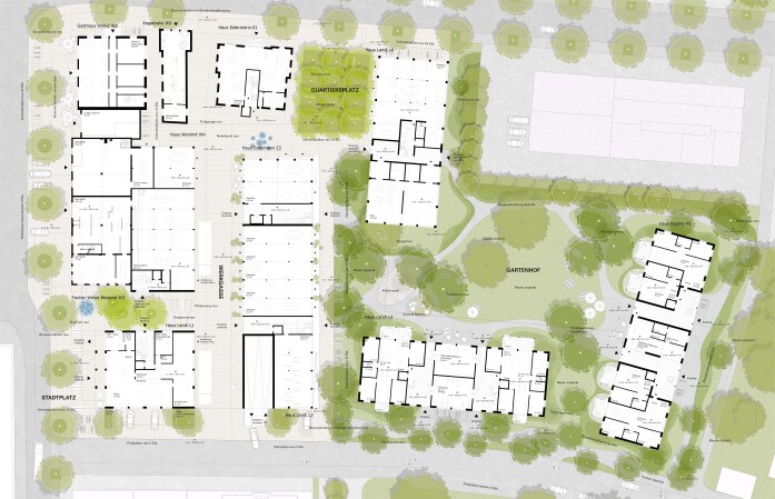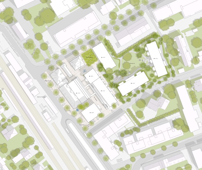 A 30-metre-high landmark building on the train station square sets an urban accent along the railway line and forms the gateway to the new development. As a counterpoint, a permeable building structure will be created in the east of the site, continuing the existing terraced buildings and flowing green spaces of the adjacent plots. A large garden courtyard is created here, loosely enclosed by three horizontal residential buildings. In keeping with the ideals of the garden city, the aim is to create ground-level living with a strong connection to the communal garden area.