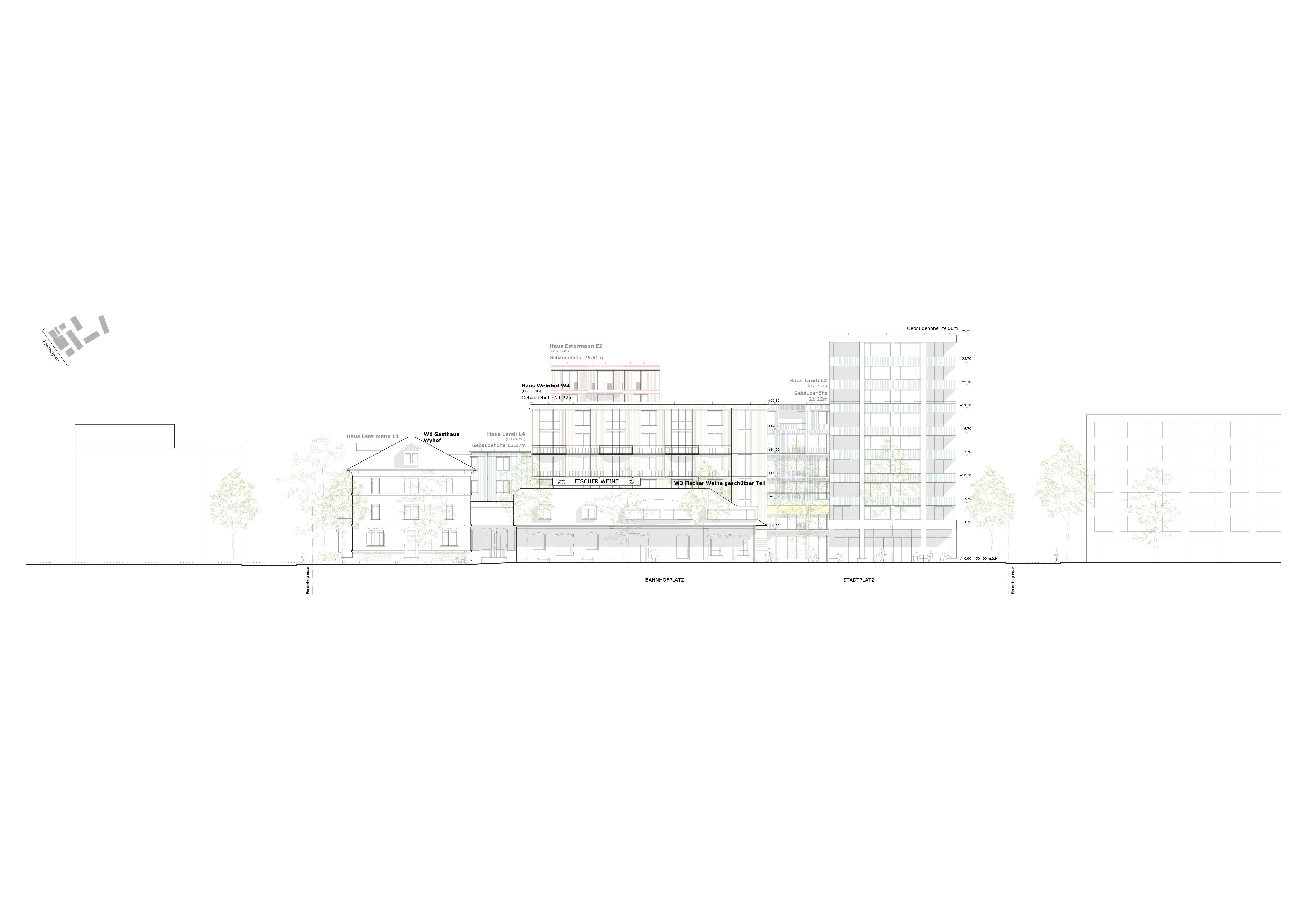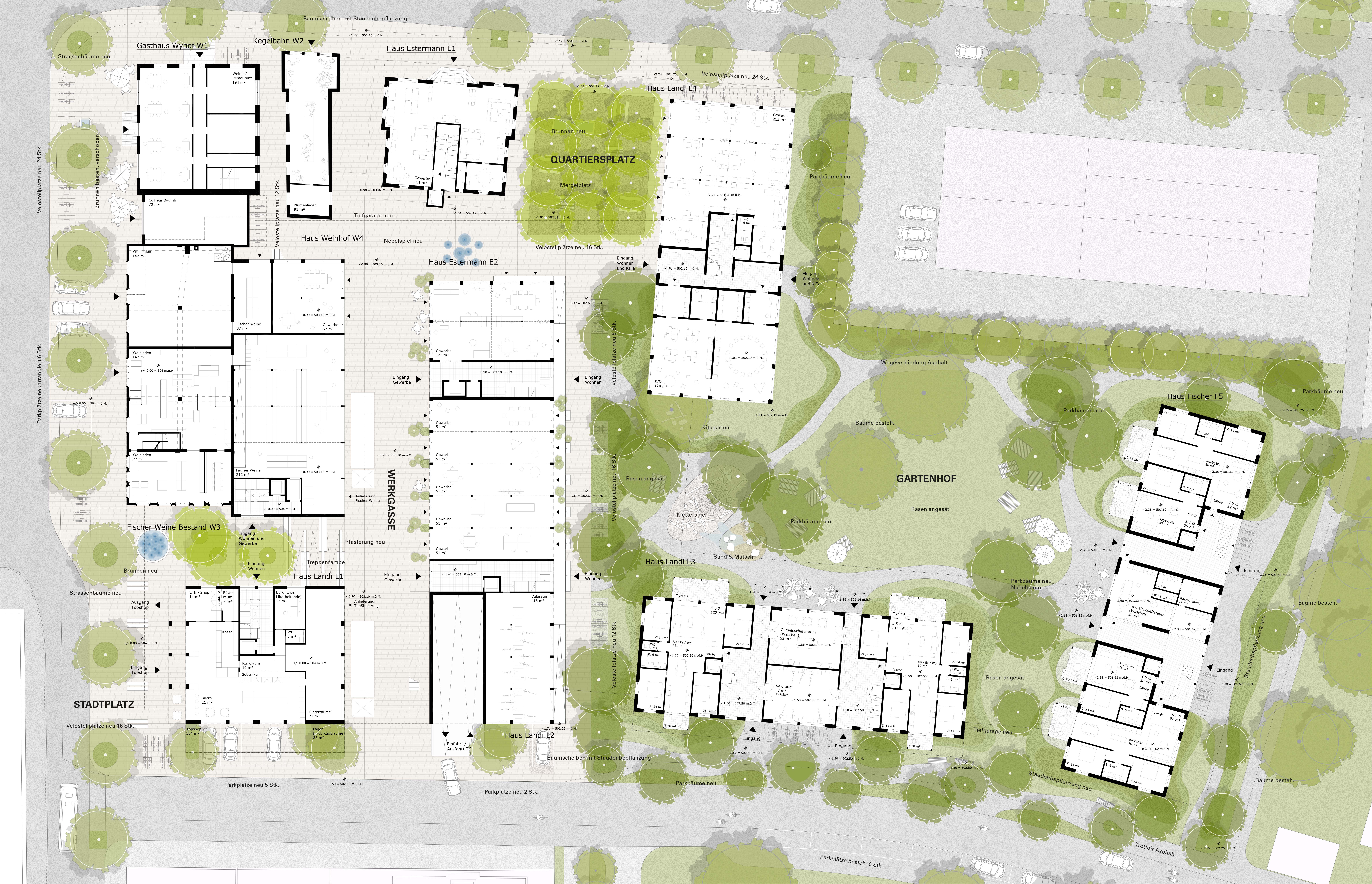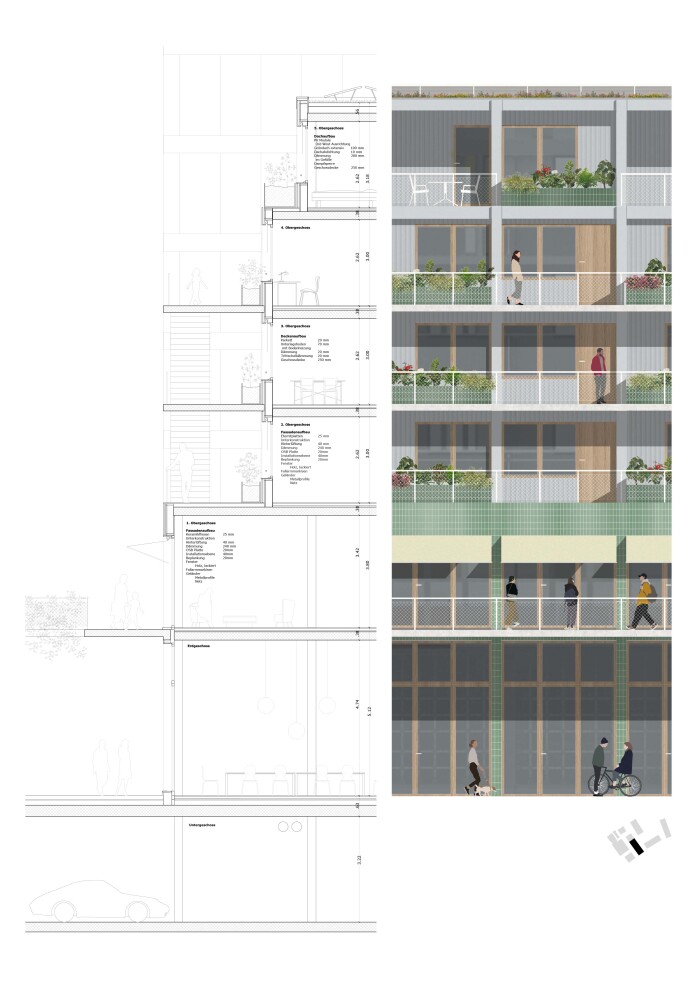 The exciting urban spaces are to be preserved and further developed. The two elongated new buildings in the immediate vicinity of Wyhof and Fischer Weine create a new atelier lane that is commercially characterised on the first floor and at the same time forms differentiated living space on the upper floors.