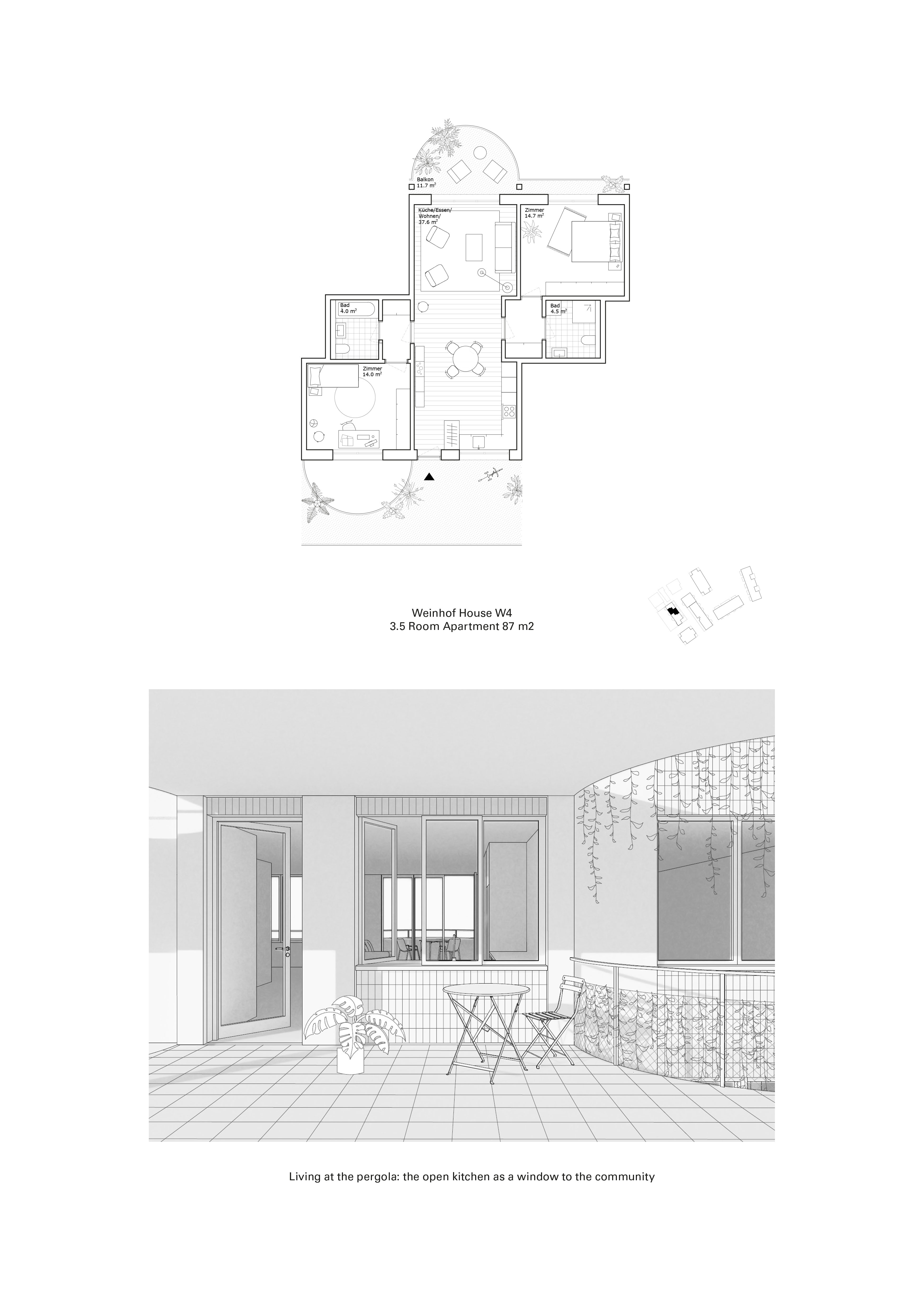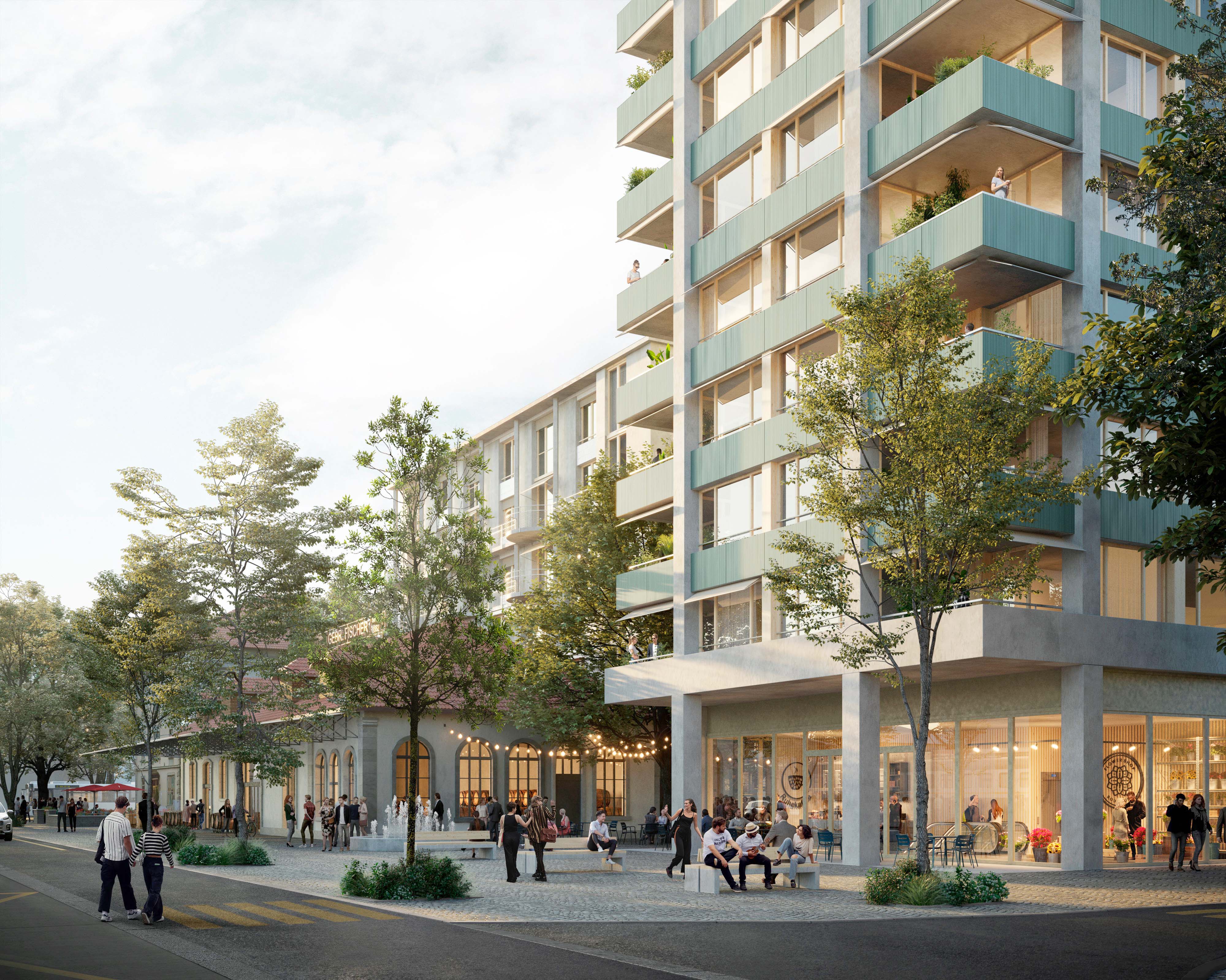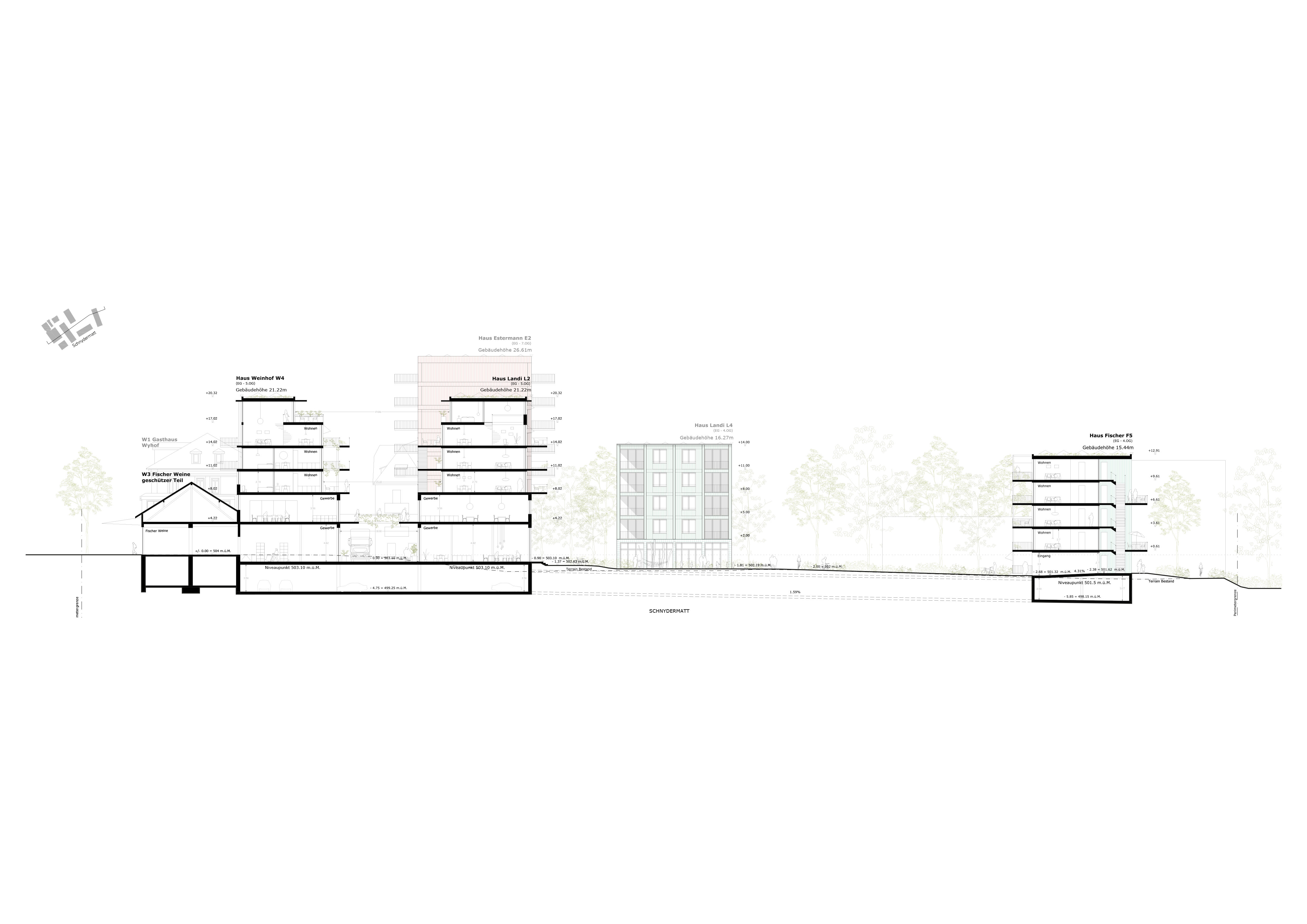 The exciting urban spaces are to be preserved and further developed. The two elongated new buildings in the immediate vicinity of Wyhof and Fischer Weine create a new atelier lane that is commercially characterised on the first floor and at the same time forms differentiated living space on the upper floors.